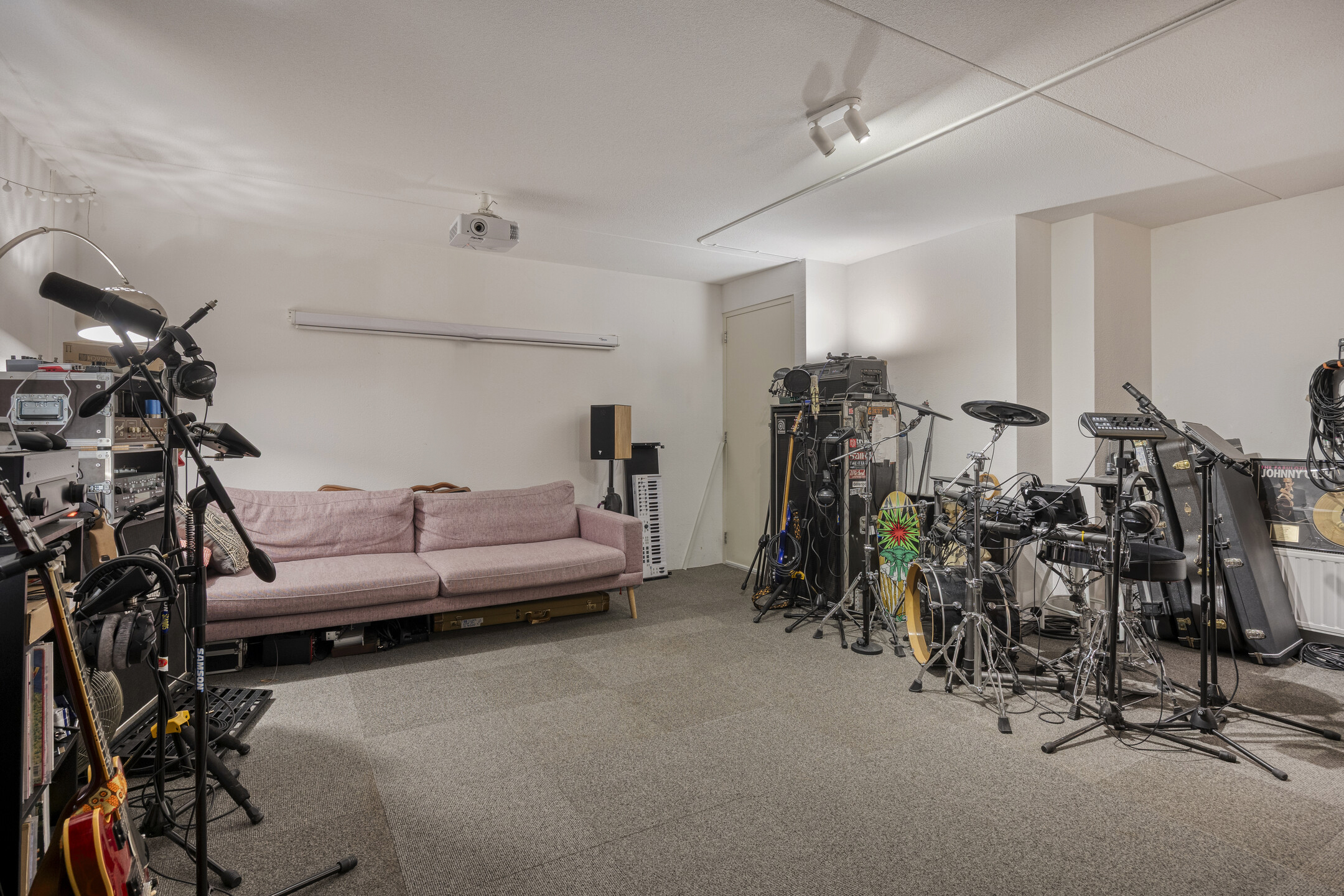 Geluidsdichte kelder met vloerverwarming en mechanische ventilatie, thans in gebruik als muziekstudio en bioscoop, wandafwerking sierpleister, vloer afgewerkt met tapijttegels, plafond afgewerkt met spuitwerk.