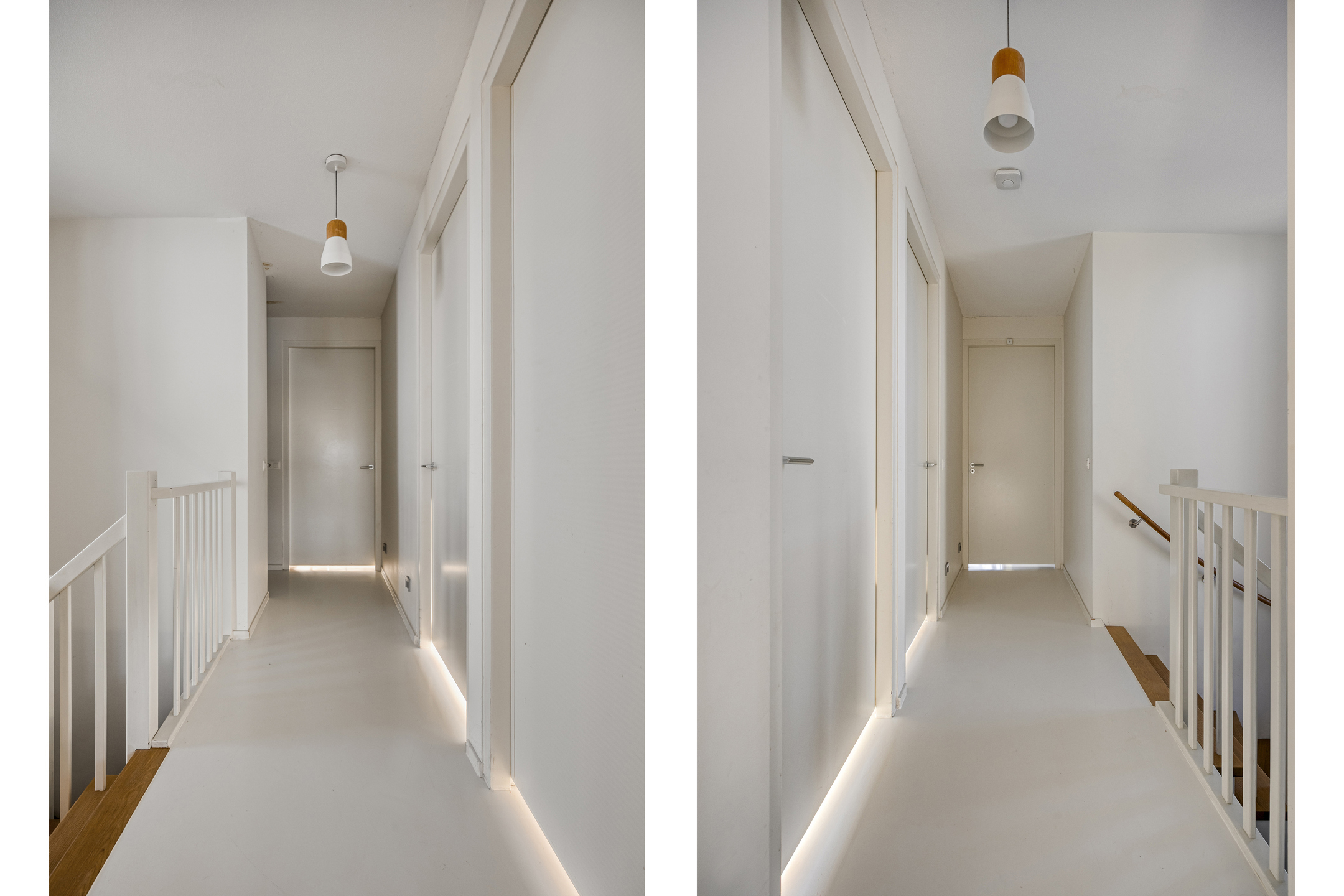 Overloop, wandafwerking stucwerk, gietvloer, plafond afgewerkt met stucwerk, opstelplaats wasmachine en droger;