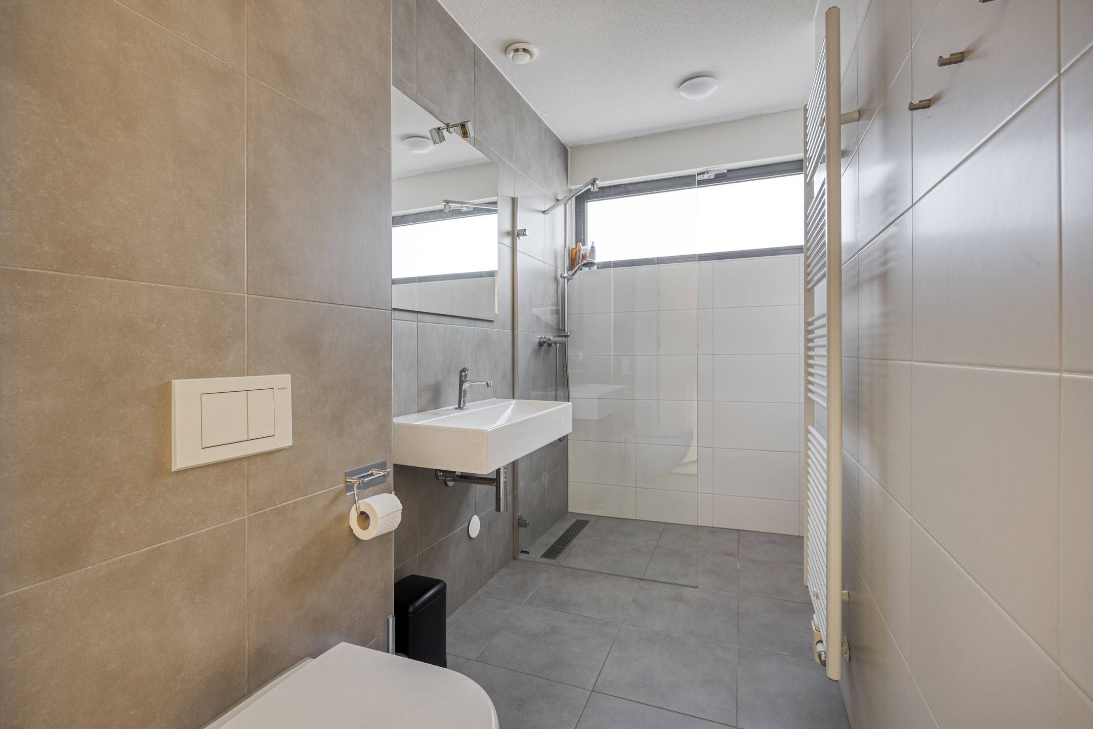 betegelde badkamer, voorzien van een inloopdouche, toilet, badkamermeubel met een dubbele wastafel, een designradiator en mechanische ventilatie.