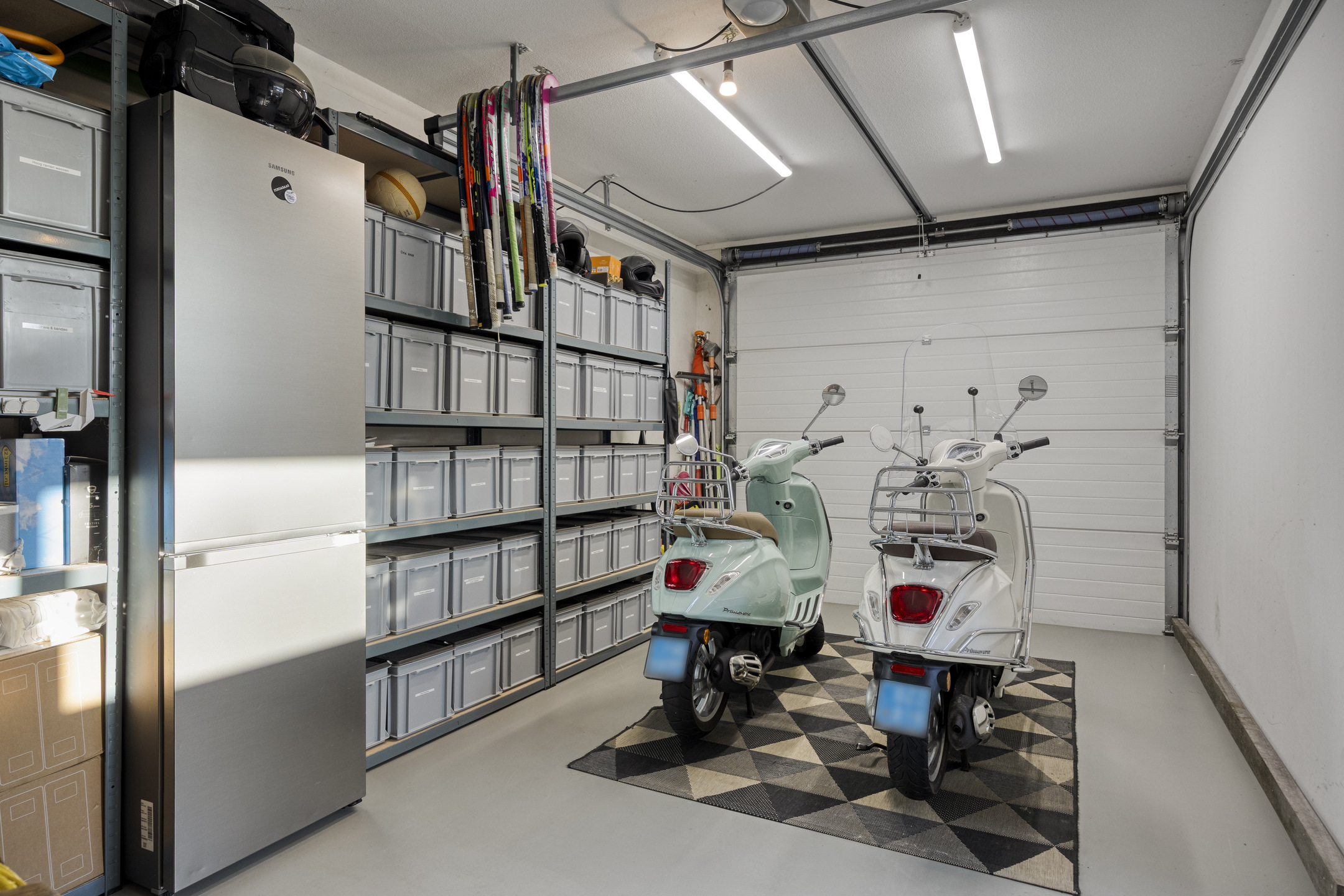 Inpandig bereikbare garage en berging (mogelijk kantoor, praktijkruimte, e.d.) met een elektrische roldeur en separate openslaande deuren vanuit de berging. De ruimte is volledig voorzien van een gietvloer. Tevens is de omvormer hier geplaatst.