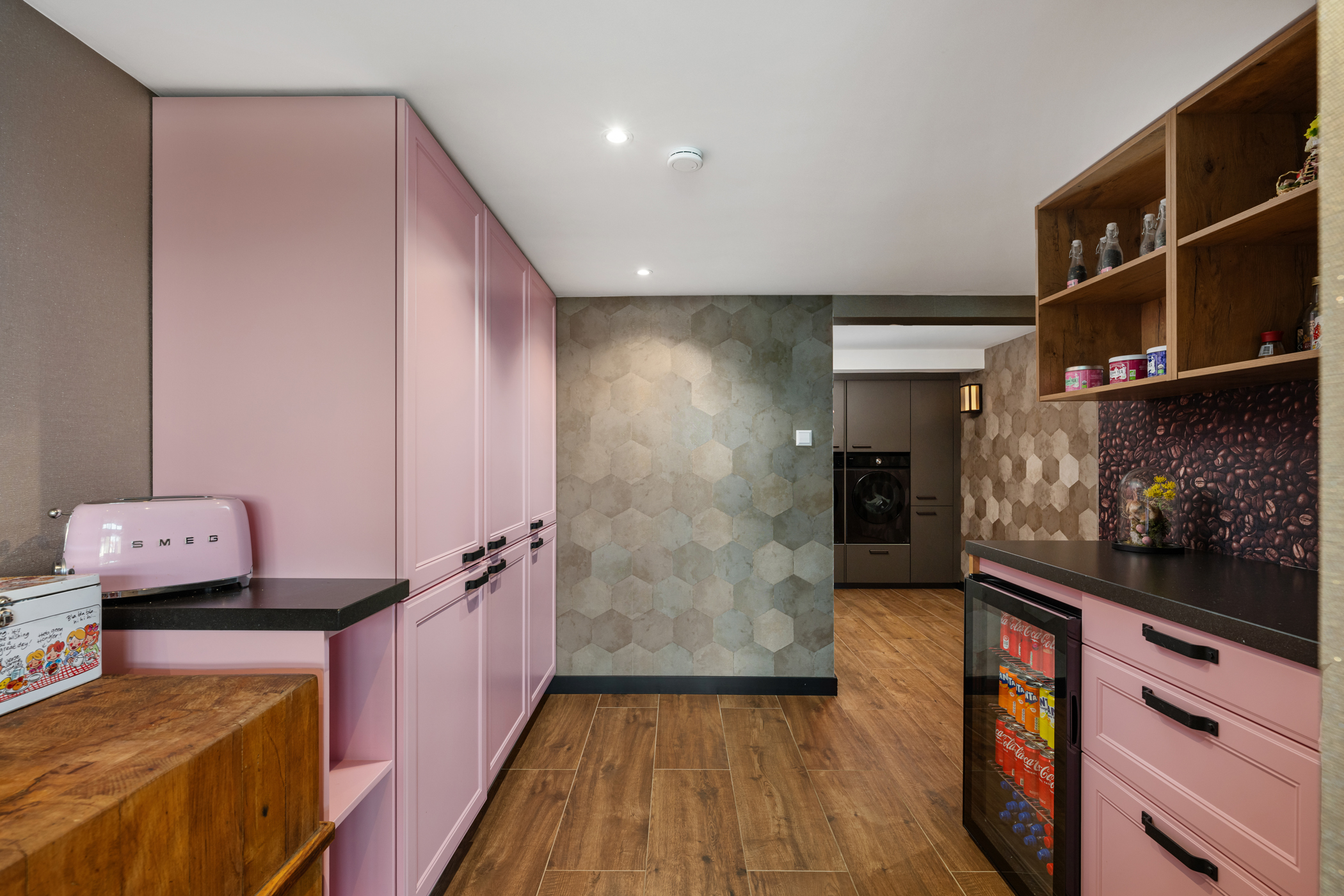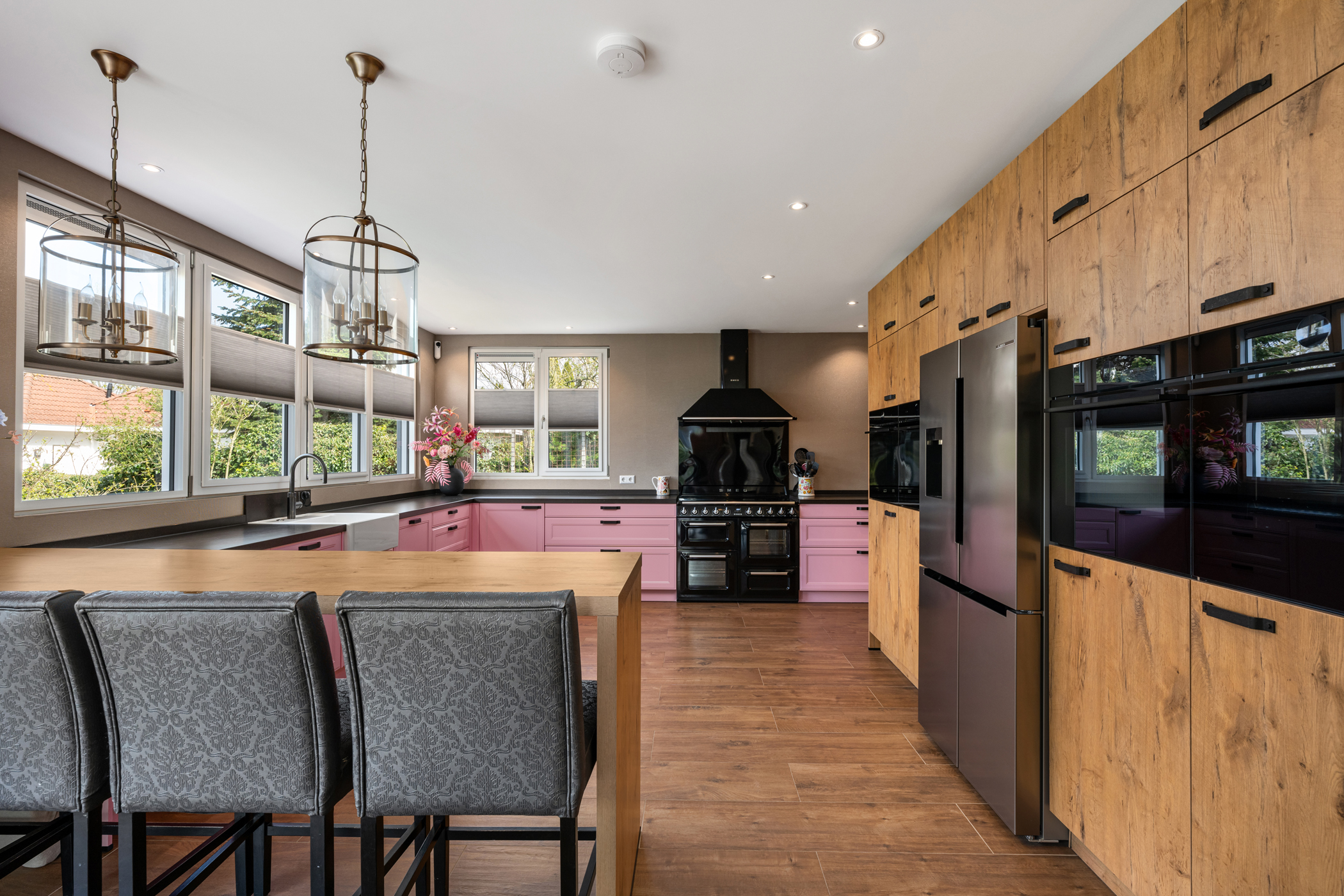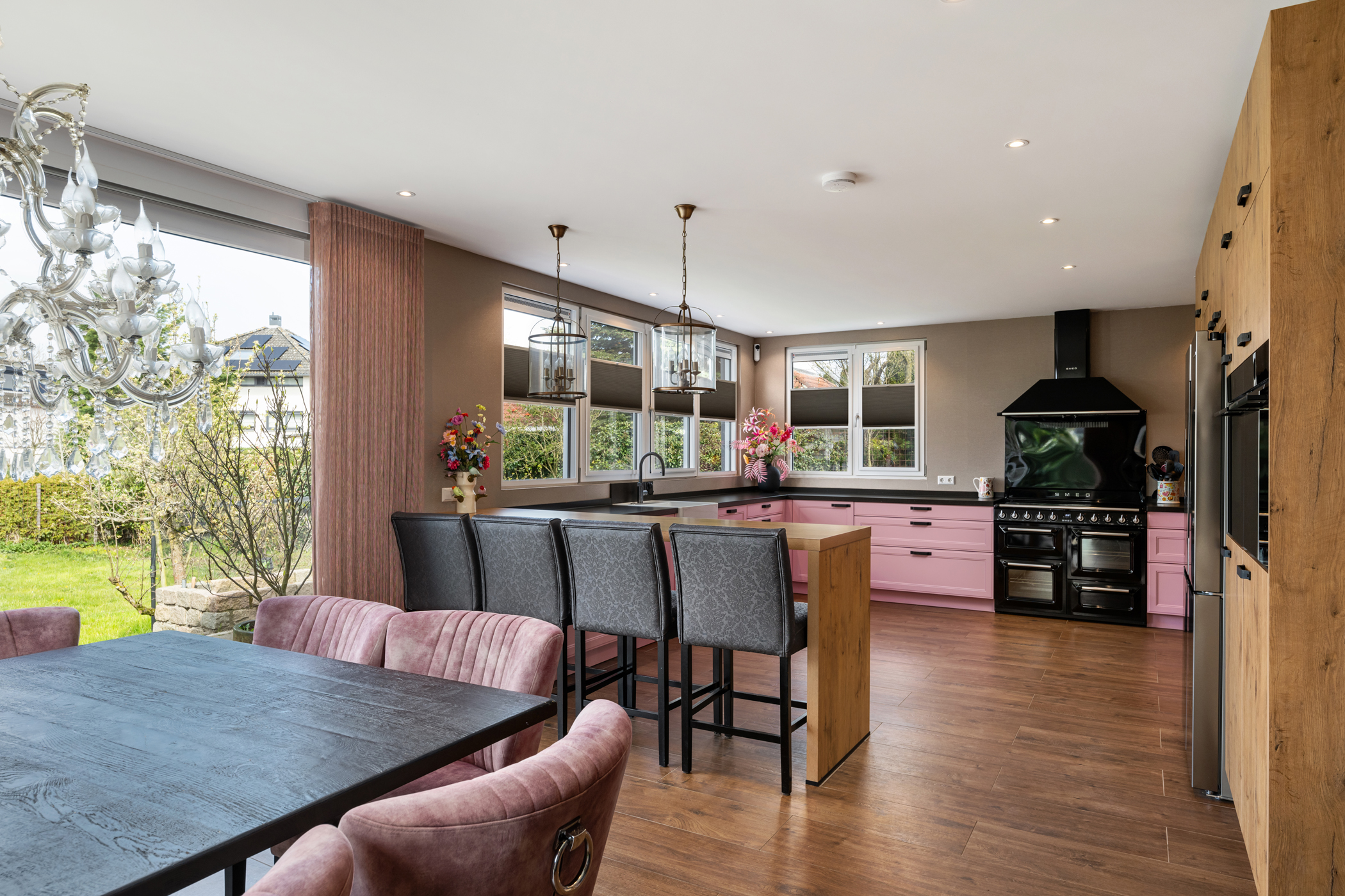De royale woonkamer aan de voorzijde is ingedeeld in een sfeervolle zit- en eetkamer, met veel lichtinval en een warme uitstraling. Aan de achterzijde bevindt zich de zeer ruime woonkeuken, uitgevoerd met hoogwaardige inbouwapparatuur, waaronder een groot gasfornuis, twee koelkasten, twee vaatwassers, twee combi-ovens, twee stoomovens en een Quooker. Ideaal voor liefhebbers van koken en gastvrijheid.
