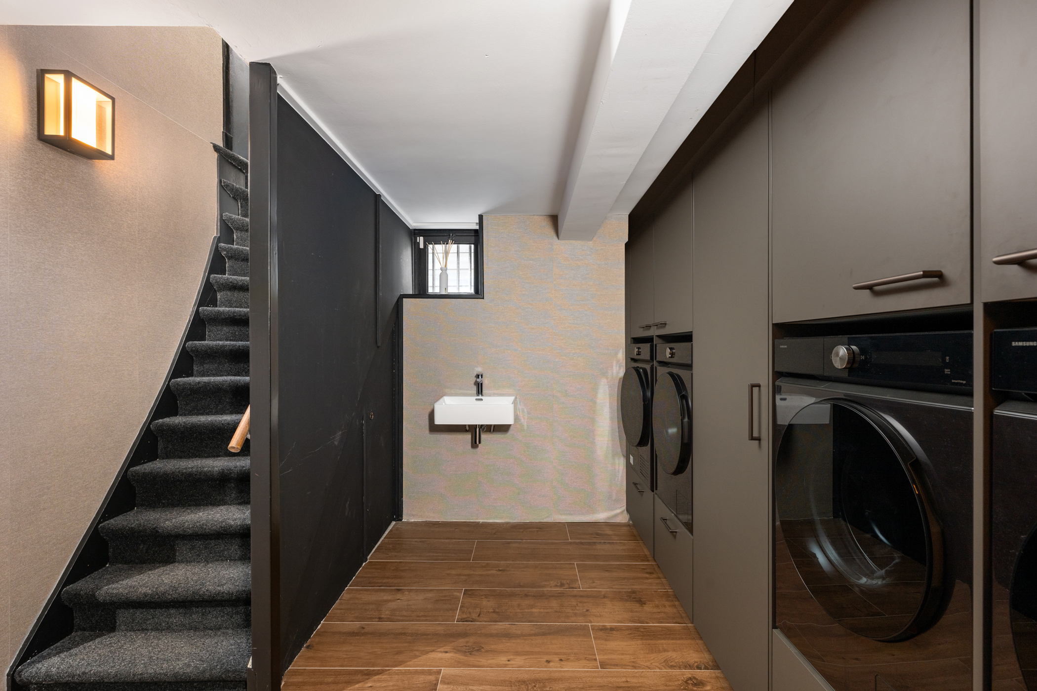 Aan de voorzijde van het souterrain bevindt zich tevens de wasruimte met dubbele aansluitingen voor wasmachines en drogers. Daarnaast is er een aparte dames en heren toilet met urinoir aanwezig.