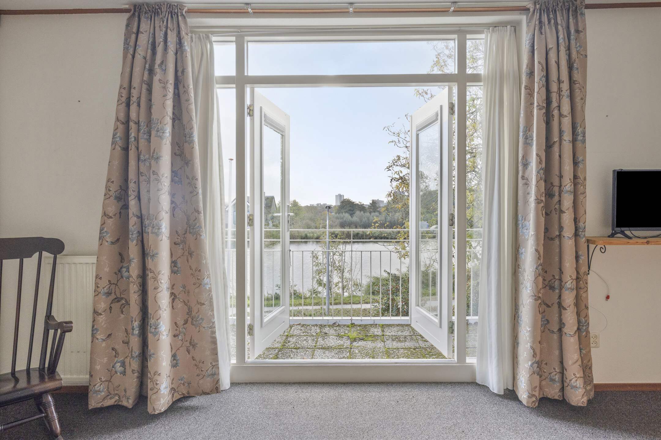 Slaapkamer 1, gelegen aan de voorzijde, met vaste kasten en toegang tot het balkon met prachtig uitzicht over de Rotte.
