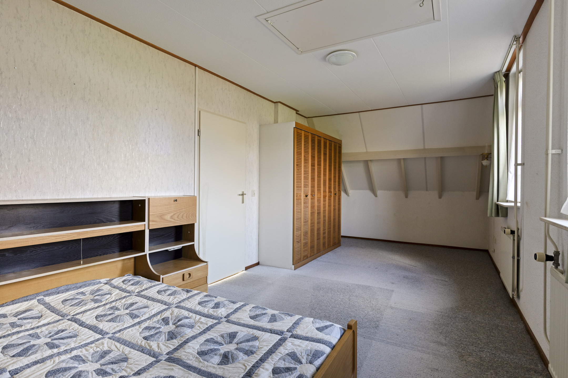Slaapkamer 2, ruime kamer aan de achterzijde, waar eenvoudig twee volwaardige slaapkamers van te maken zijn. Vanuit deze kamer is de vliering bereikbaar, waar zich de opstelplaats van de cv-ketel bevindt.