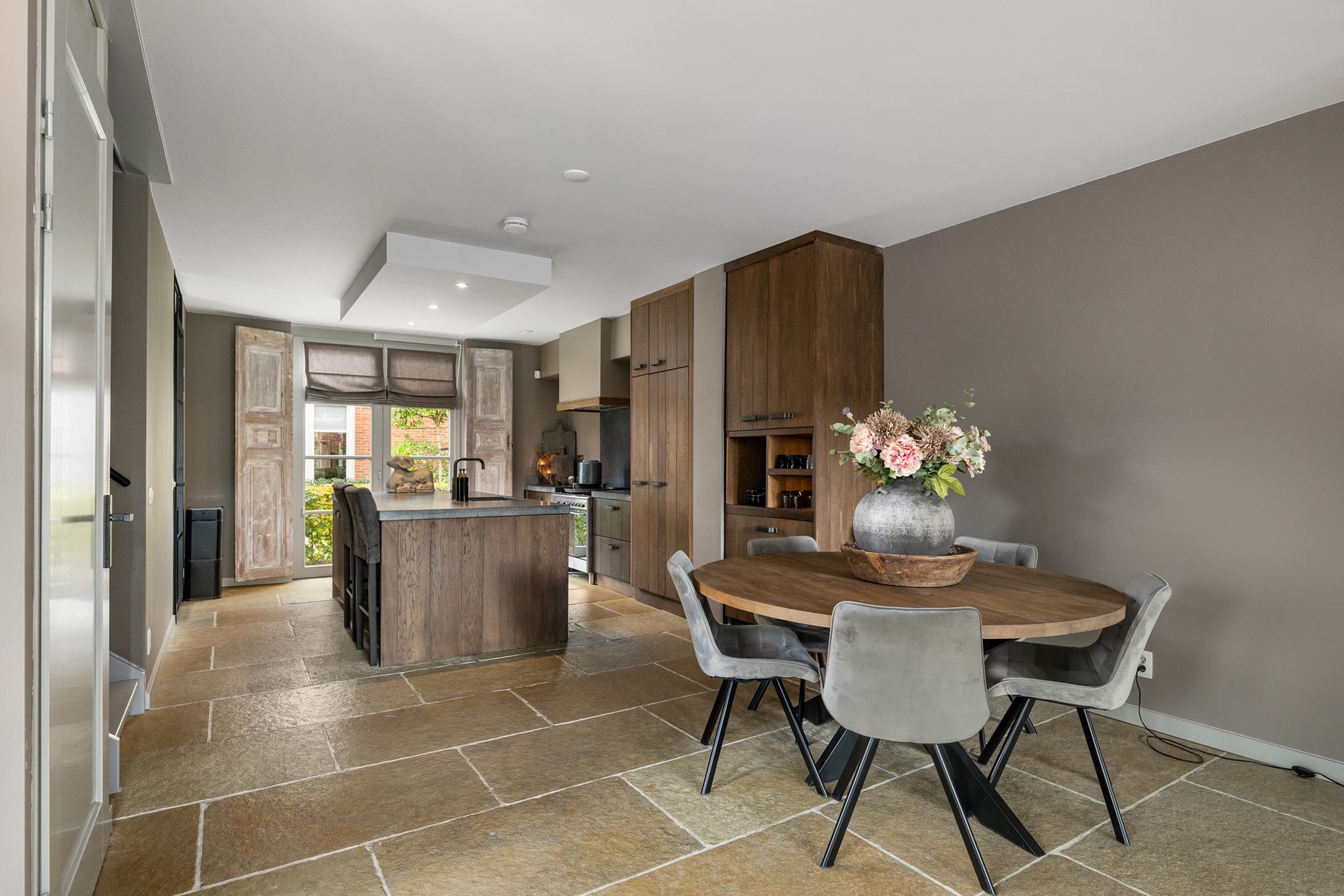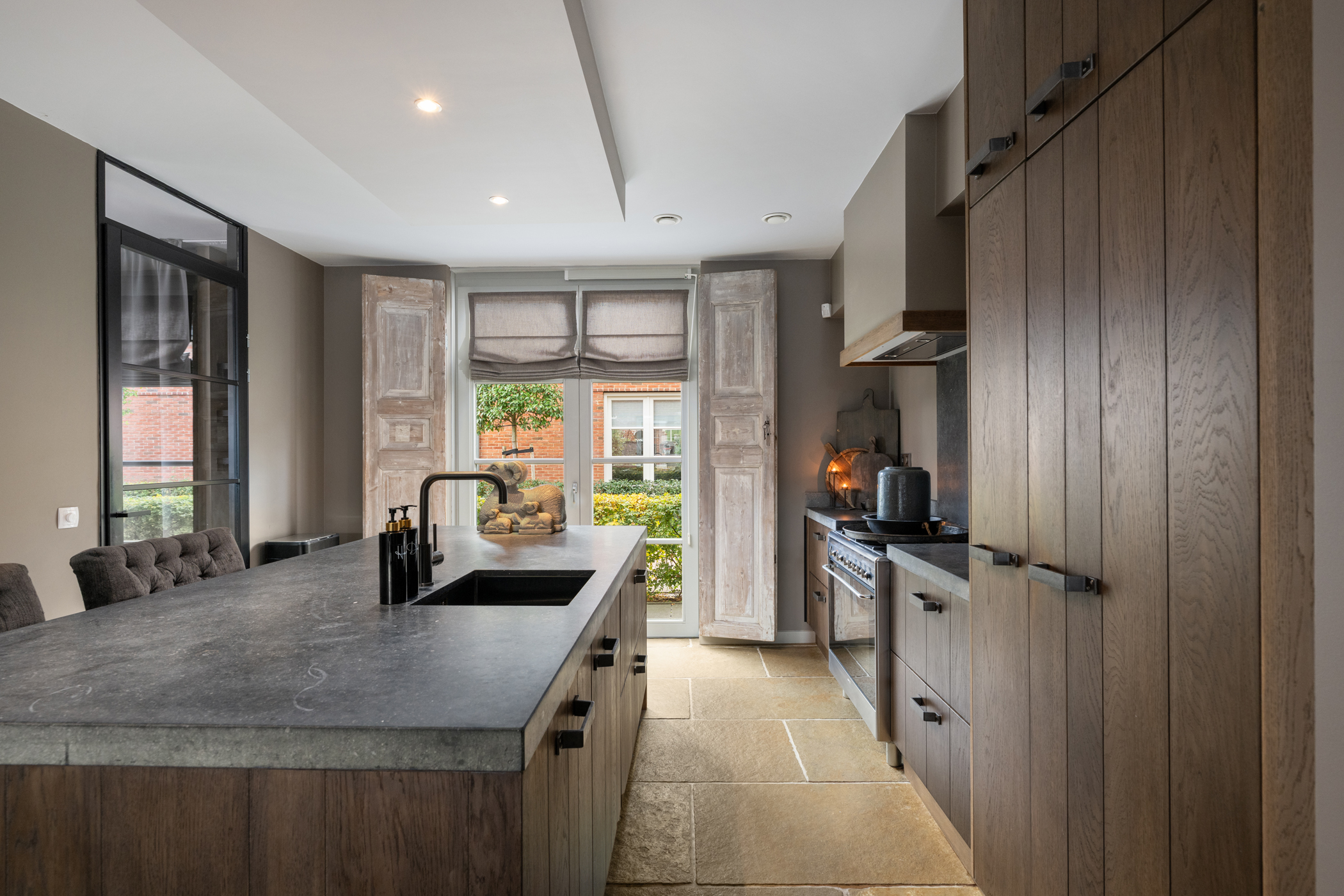 Aan de voorzijde van de woning bevindt zich de moderne keuken met groot kook- en spoeleiland, uitgerust met hoogwaardige inbouwapparatuur zoals een apothekerskast, spoelbak, gasfornuis, afzuigkap, heteluchtoven, koelkast en vaatwasser.