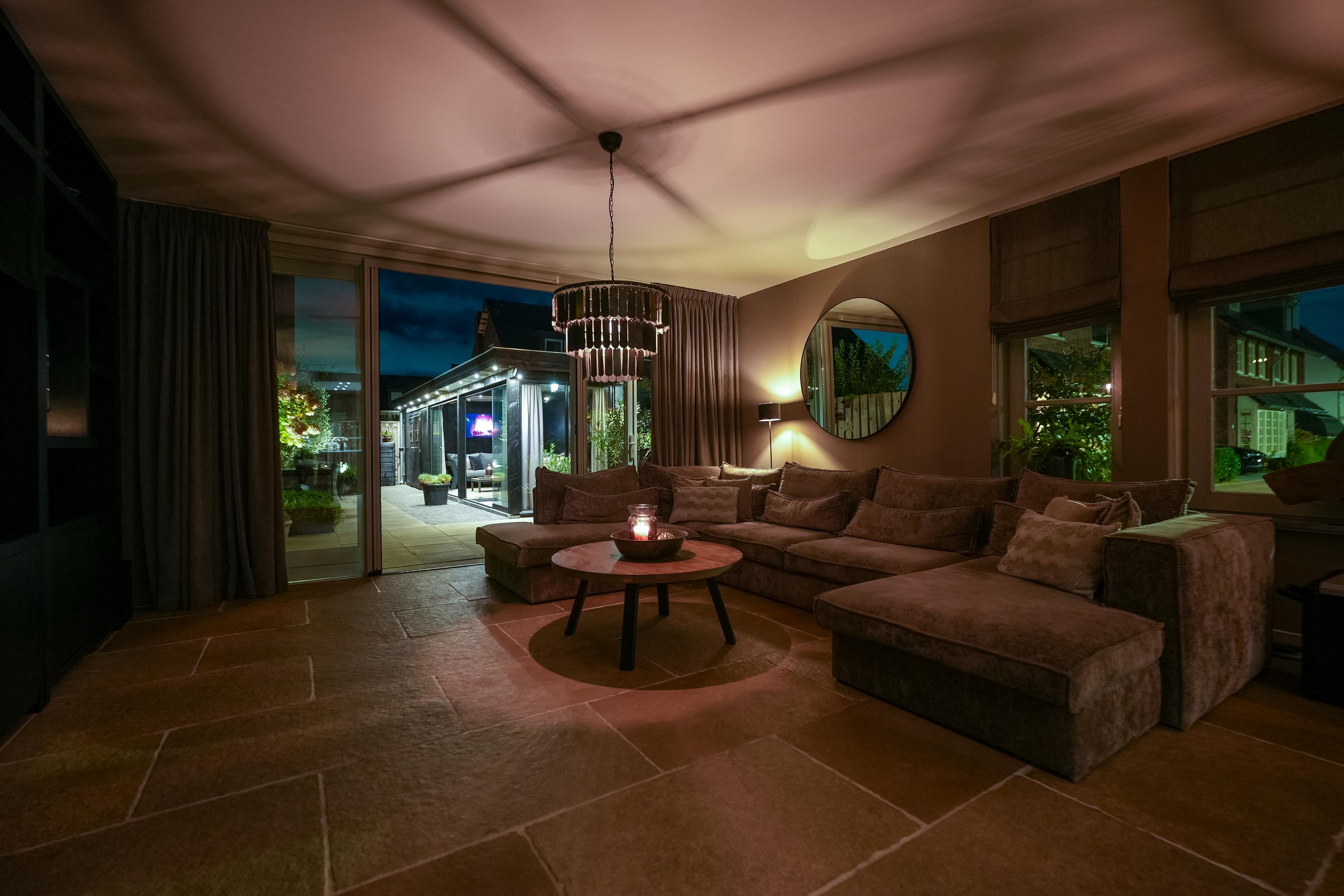 De tuingerichte woonkamer is ruim en licht, afgewerkt met een fraaie Bourgondisch dallen natuurstenen vloer met vloerverwarming. De trap naar de eerste verdieping bevindt zich in de woonkamer en de trapkast is praktisch ingericht als extra garderobe. Openslaande deuren bieden toegang tot de diepe achtertuin, compleet met overkapping en vrijstaande houten berging.