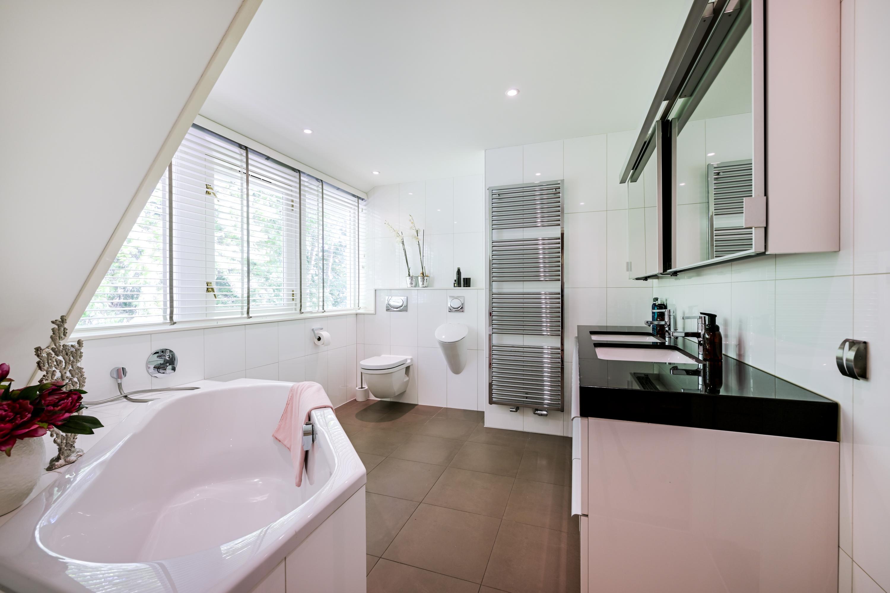 Hal met bordestrap en lift, werkkamer met ronde erker met prachtig uitzicht, ruime slaapkamer met toegang tot balkon, tweede grote (ouder-)slaapkamer met beschut balkon met fraai uitzicht over de tuin, gang naar kleedkamer en eigen badkamer met ligbad, douche, dubbele wastafel in meubel, urinoir en toilet, vloerverwarming. Derde slaapkamer en vierde slaapkamer beide met dakkapel en beide met toegang naar badkamer met bad, douche, toilet, urinoir, wastafelmeubel en vloerverwarming.