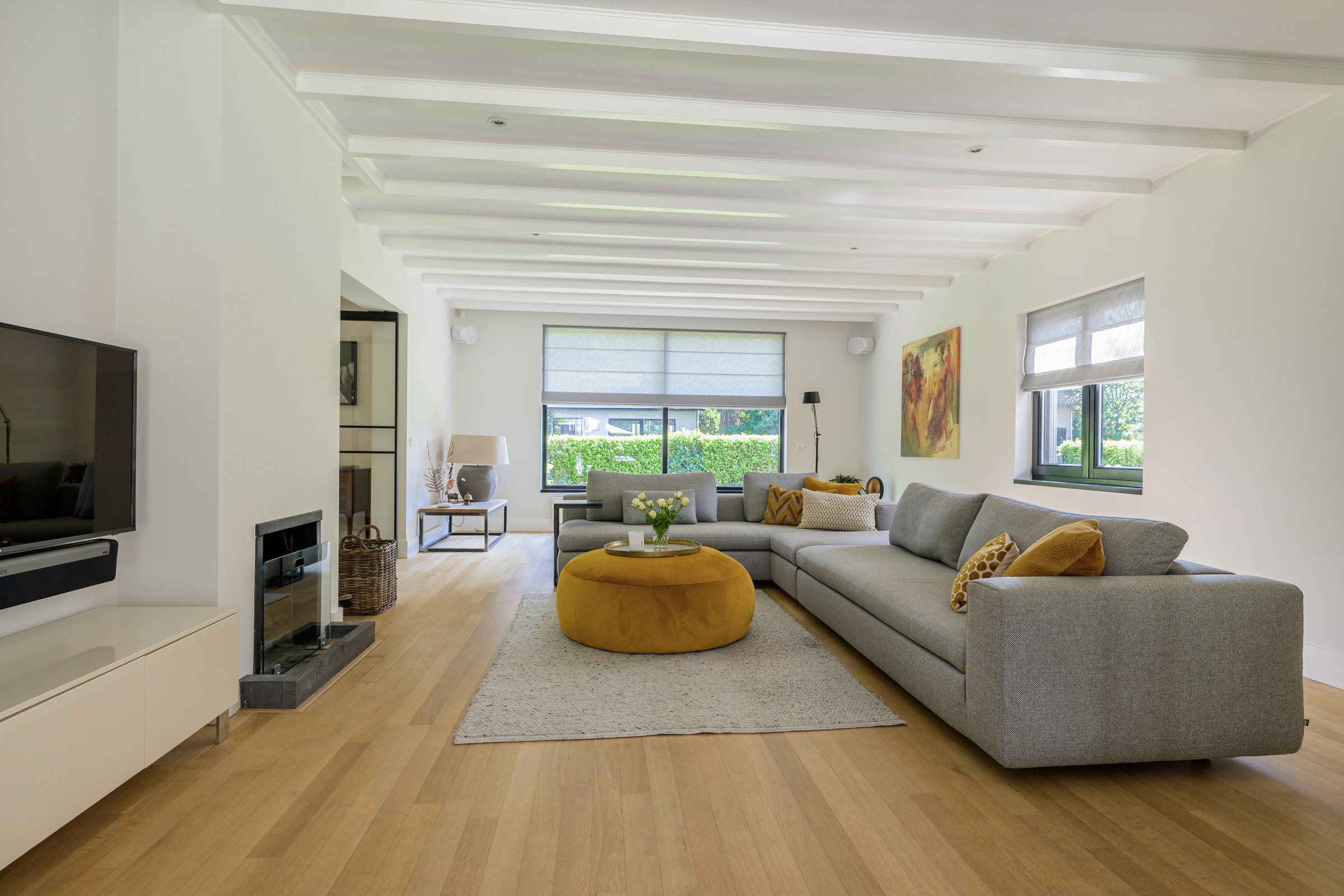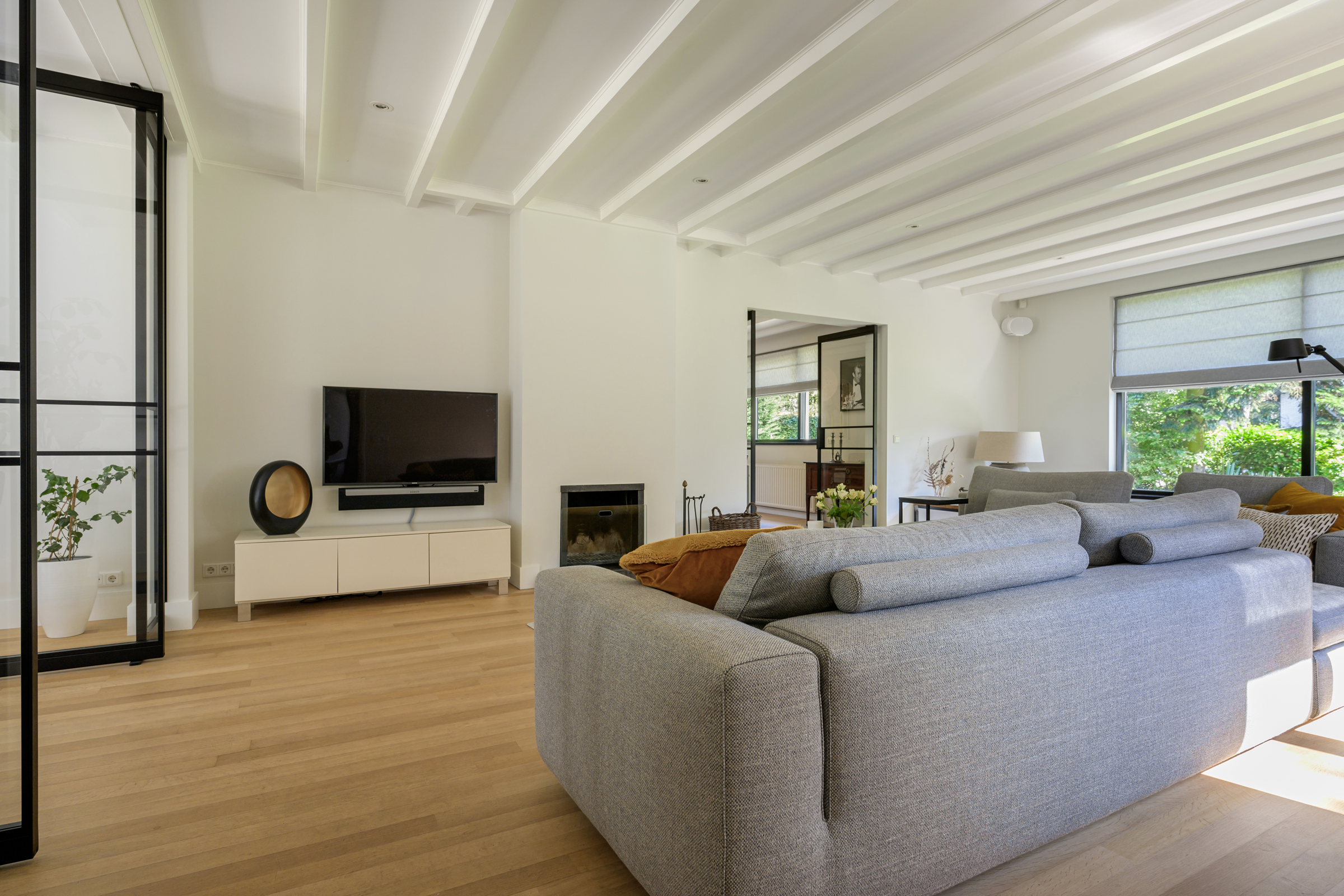 • De woning is deels voorzien van een sfeervol balkenplafond (waartussen glad stucwerk) met inbouwverlichting.