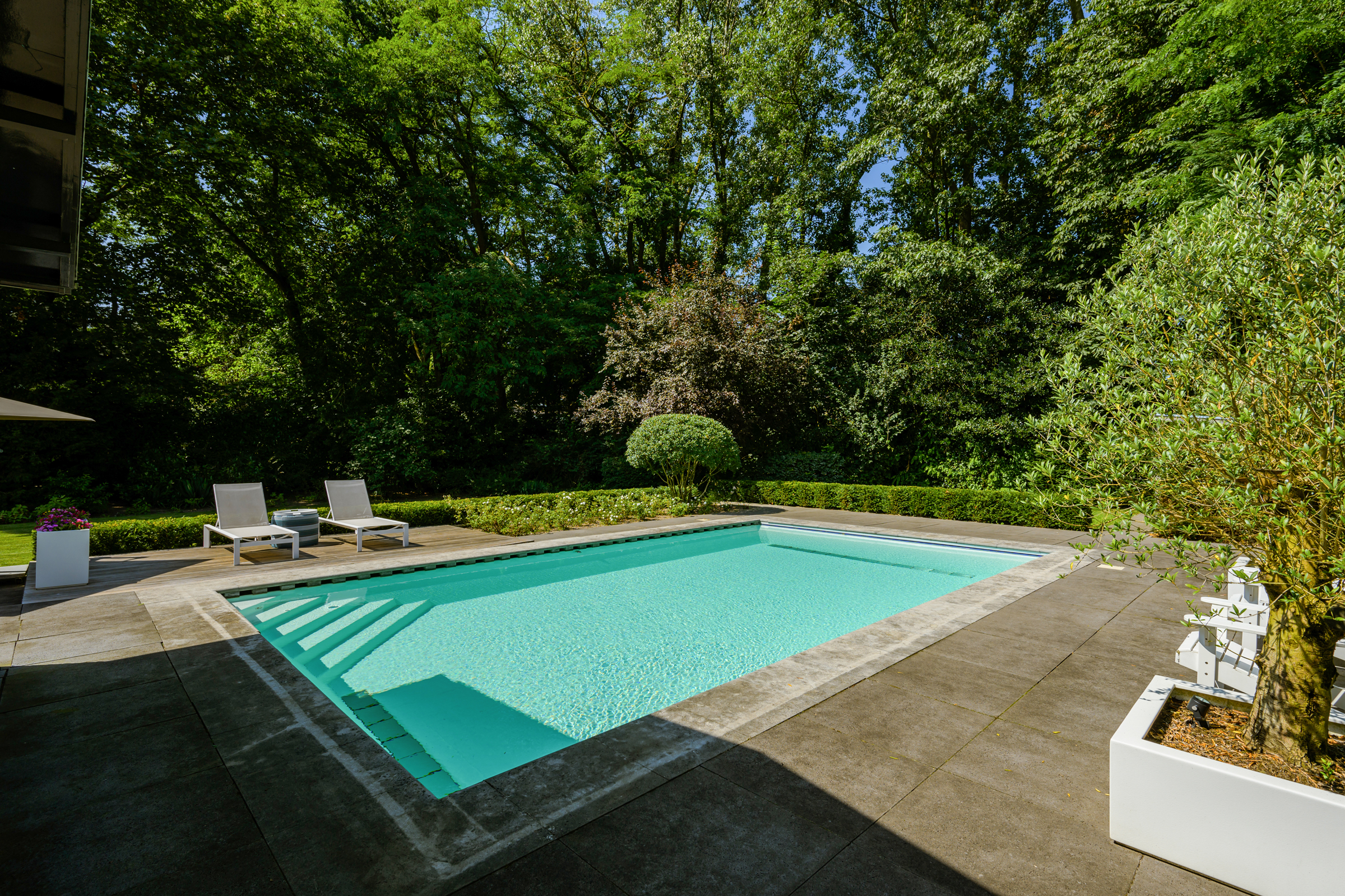 Modern, verwarmd zwembad (ca. 6,0 x 9,5 m met een diepte van ca. 1,3 tot 1,75 m) met filterinstallatie, elektrisch roldek.