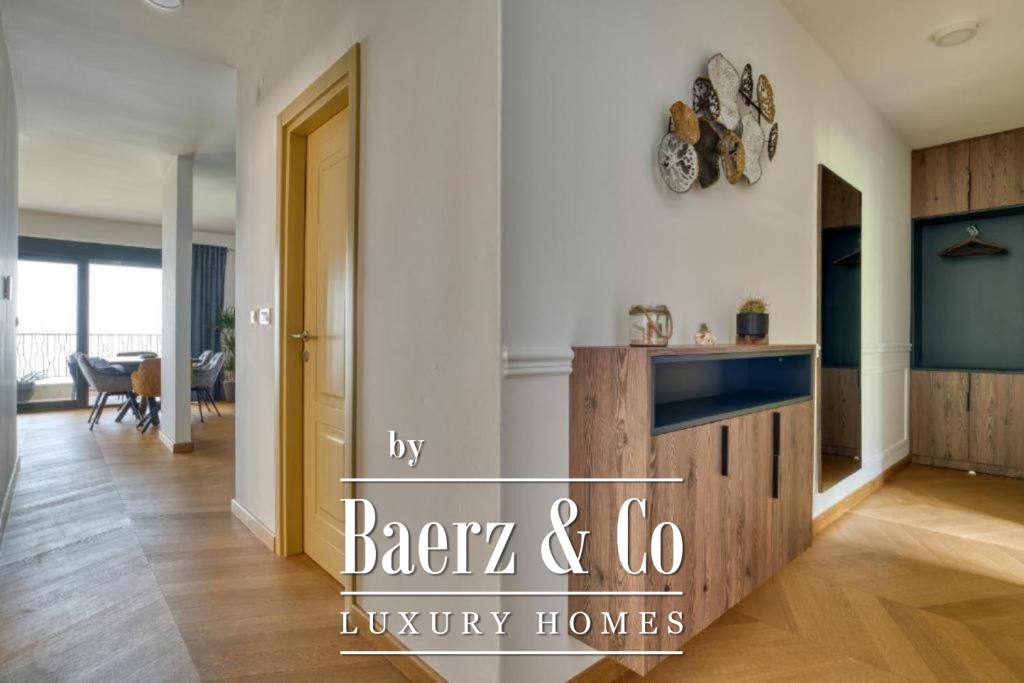 Binnen is de indeling functioneel en doordacht. Drie slaapkamers en twee badkamers bieden ruimte aan familie of gasten, terwijl de hal leidt naar een woonkamer met open keuken en eetgedeelte, ideaal voor ontspannen samenzijn. Grote ramen bieden zowel zee- als bergzicht vanaf het terras en versterken het gevoel van verbondenheid met de natuurlijke omgeving. Het appartement is volledig gemeubileerd en direct bewoonbaar.