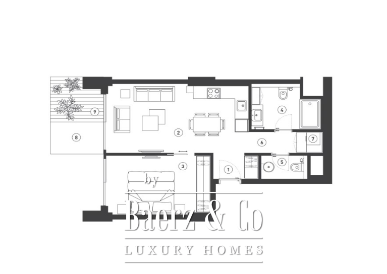Het appartement bevindt zich in een eigentijds wooncomplex van 14 verdiepingen, uitgerust met een volledig assortiment faciliteiten: infinitypool met bar, rooftopbars, een zorgvuldig samengestelde selectie restaurants, een winkelcentrum met 27 winkels, wellnesscentrum, gym en fitnessstudio’s, privéstrand en 24-uurs conciërgeservice. Beveiligde inpandige parkeergelegenheid, directe toegang tot de hoofdweg en een multifunctionele conferentieruimte maken het dagelijks leven compleet. Voor investeerders is er een professioneel verhuurbeheer dat inkomen en flexibiliteit combineert.