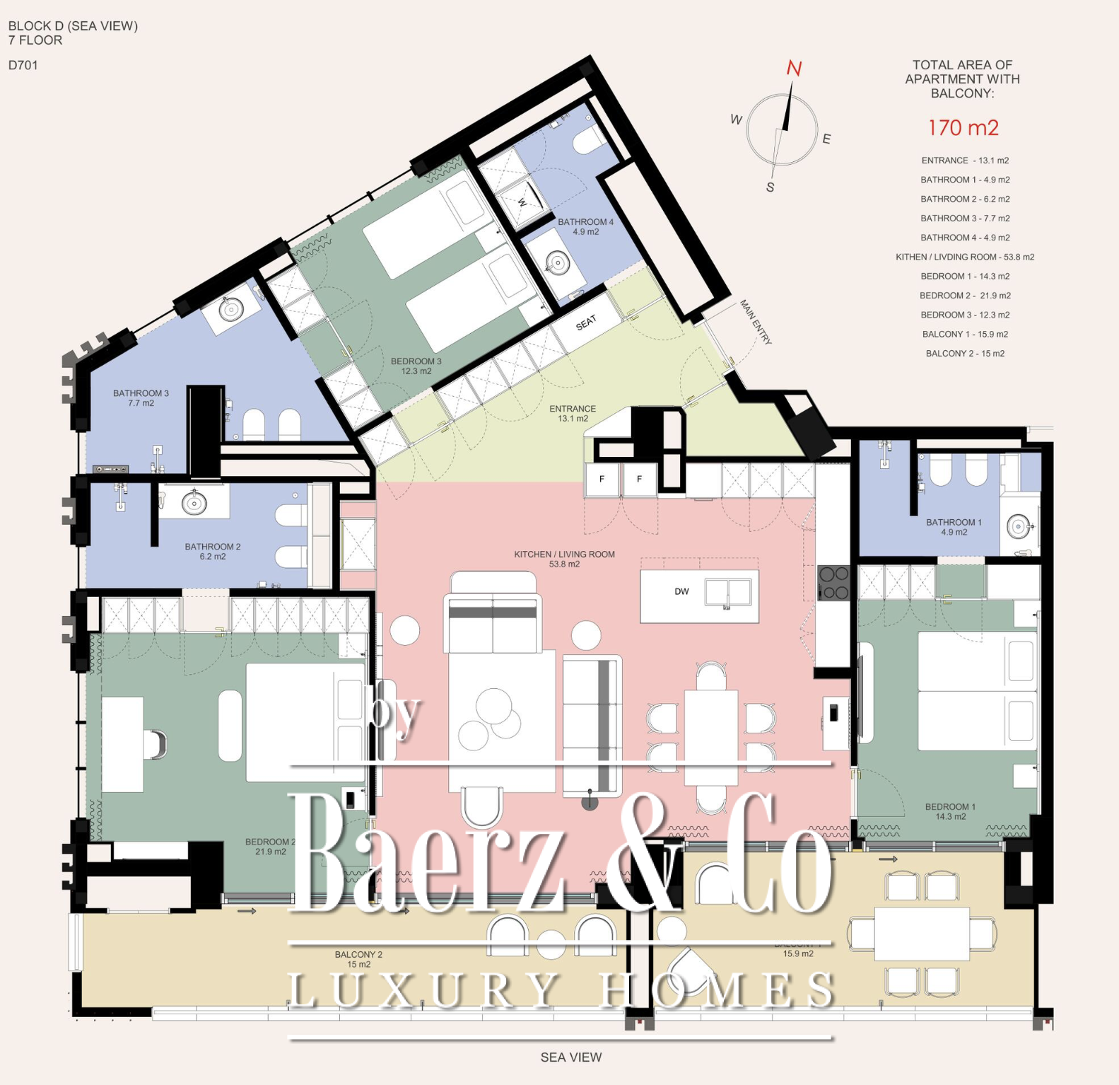 Apartment Budva brengt moeiteloos kustwonen naar een hoger niveau, met een ingetogen ontwerp en panoramisch zeezicht dat naadloos overgaat in het omliggende berglandschap. Het woonoppervlak van 170 m² omvat een uitnodigende entreehal die leidt naar een lichte open woonkamer met keuken en eetgedeelte. Het appartement beschikt over drie slaapkamers en vier badkamers, samen met twee privéterrassen die zowel uitzicht op zee als bergen bieden, wat zorgt voor een rustige en bijzonder gewilde toevluchtsoord.