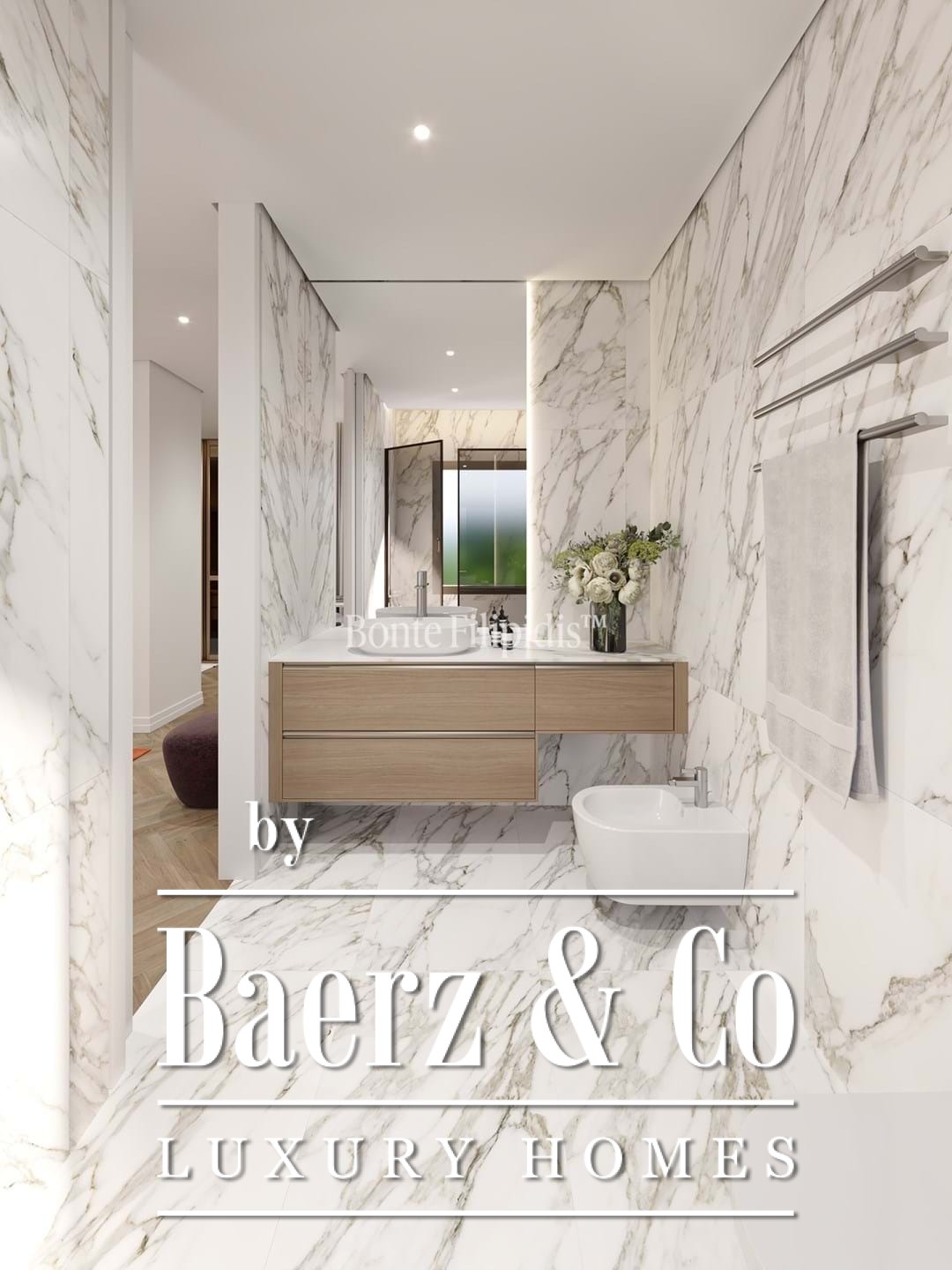 Natuurlijke materialen bepalen het luxueuze interieur: visgraat houten vloeren in de woonvertrekken en slaapkamers, maatwerk schrijnwerk en een elegante marmeren afwerking voor keuken en badkamers. De gezamenlijke ruimtes ademen dezelfde sfeer dankzij marmer, hout en geïntegreerde verlichting.
