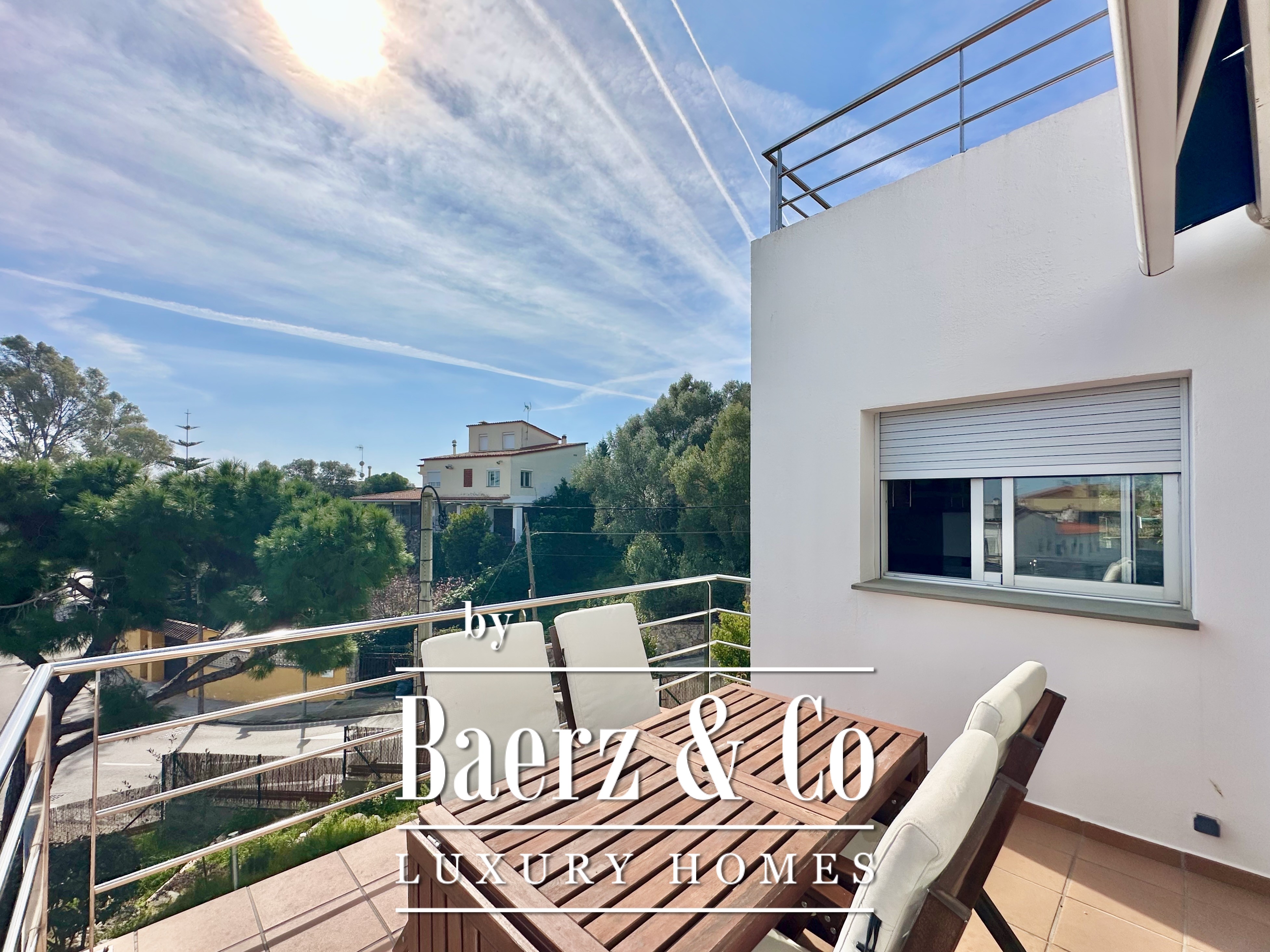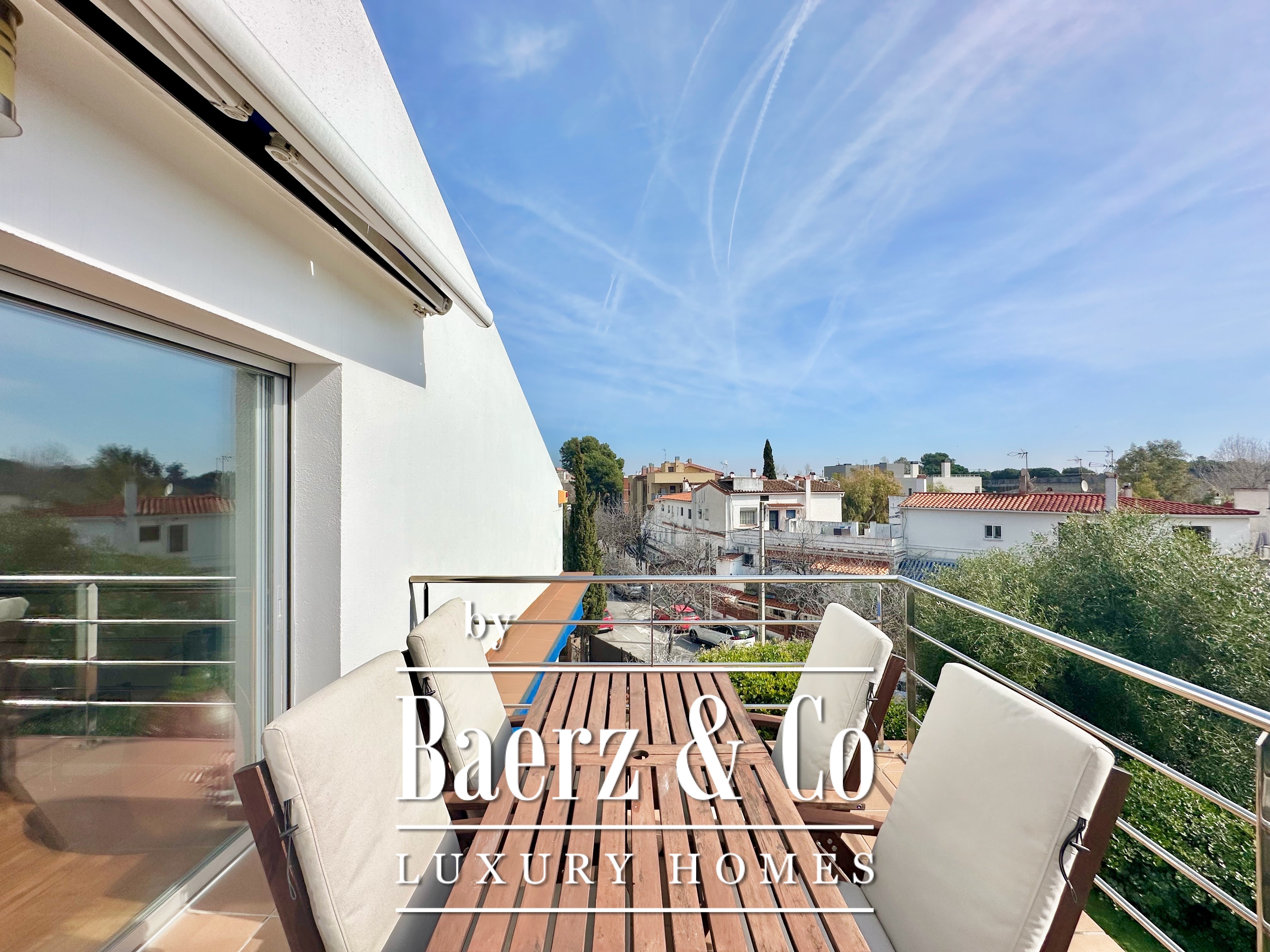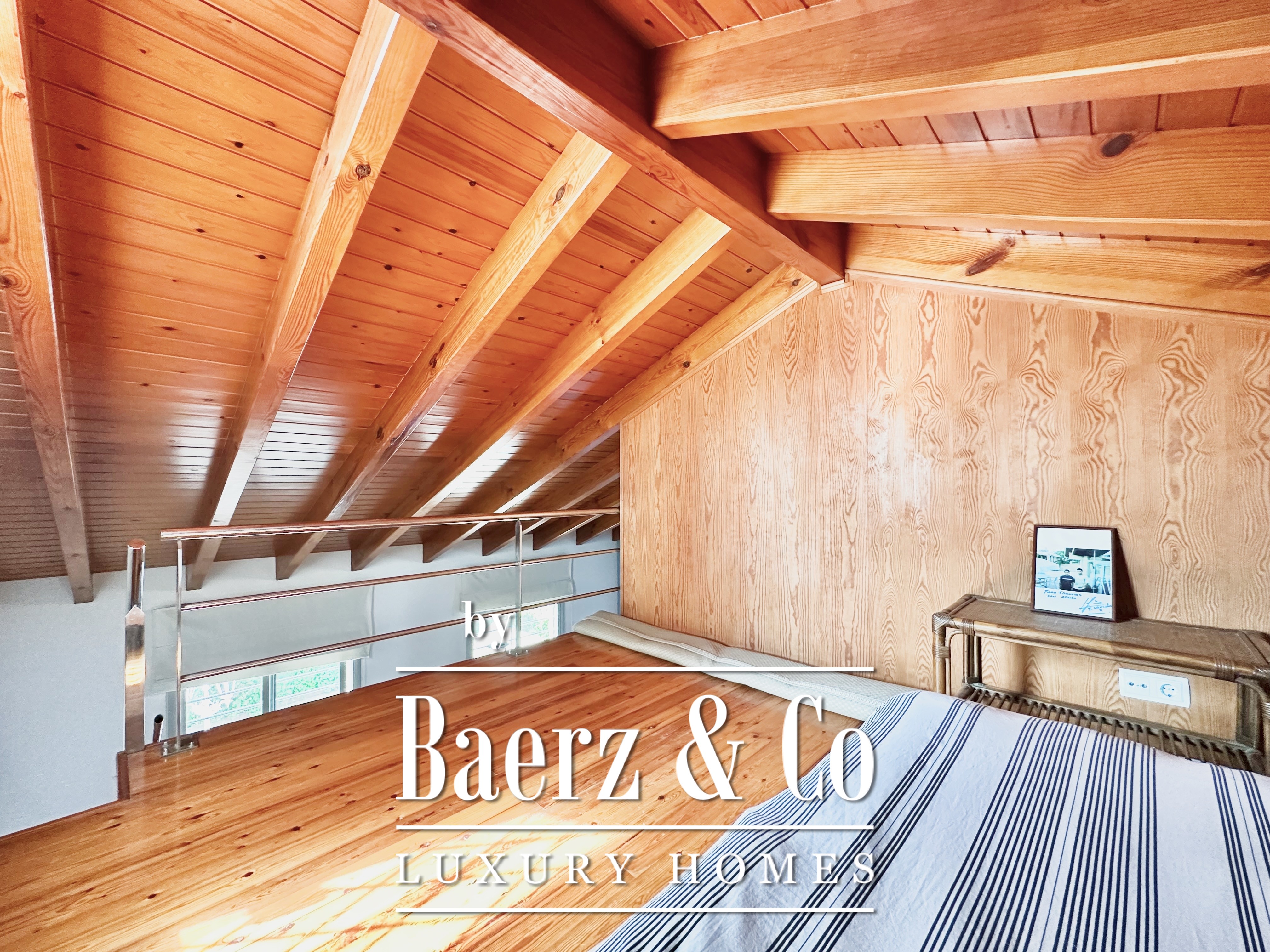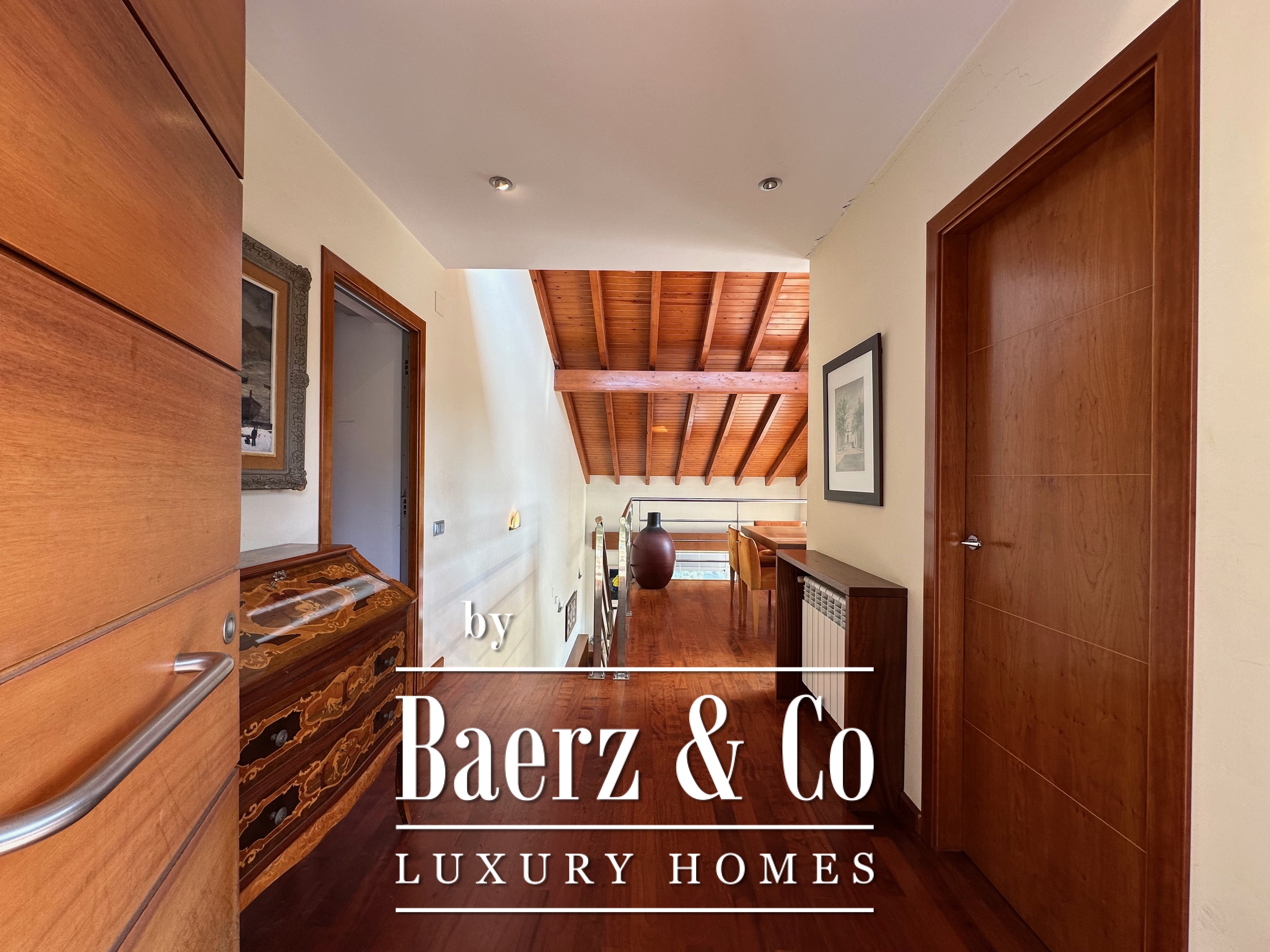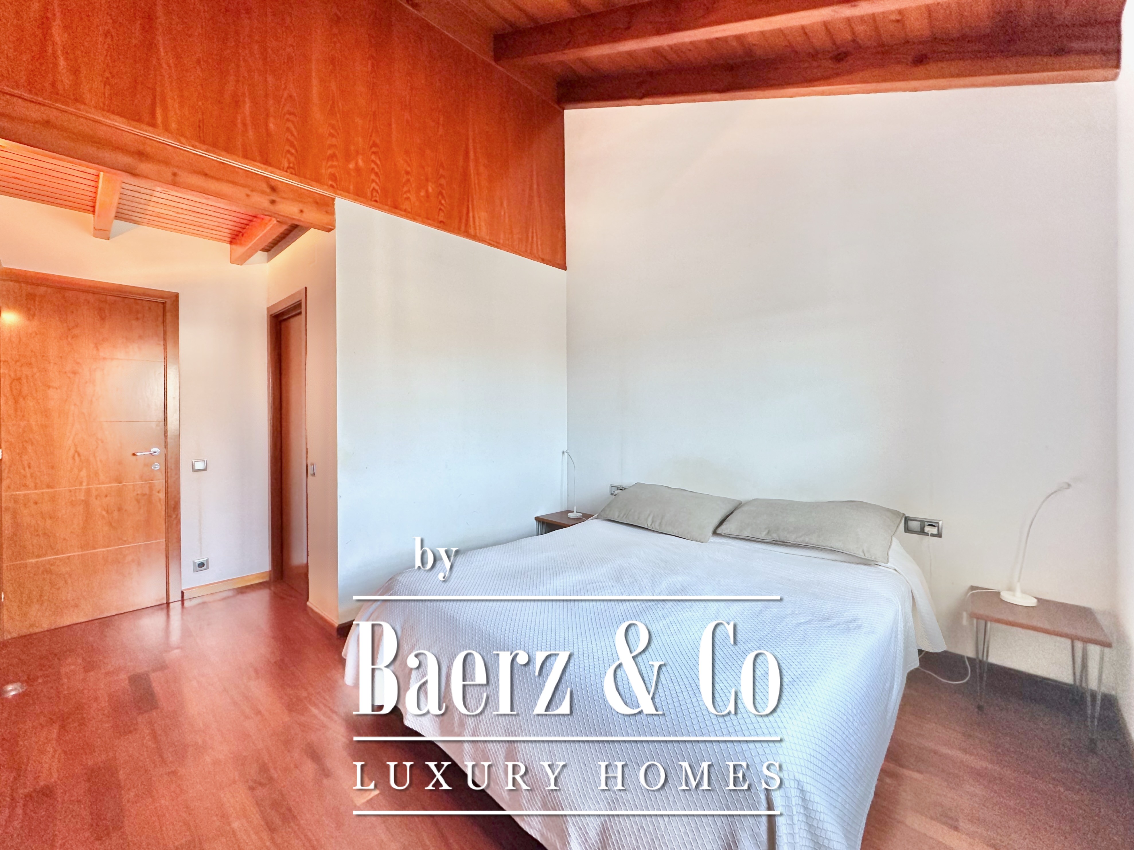De privévertrekken bestaan uit vijf slaapkamers en twee badkamers. Twee dubbele kamers zijn samengevoegd tot een flexibele suite van meer dan 20 m², maar kunnen desgewenst eenvoudig weer gescheiden worden. Een zolder biedt mogelijkheden voor werk of ontspanning, met directe toegang tot een terras van 20 m² met panoramisch bergzicht. De hoofdsuite beschikt over een kleedruimte en een elegante badkamer met vijf elementen, en combineert comfort met ingetogen klasse. Deze vrijstaande woning te koop in Castelldefels integreert elk detail op doordachte wijze voor een levensstijl van allure in een van Spanje’s meest gewaardeerde kustplaatsen.