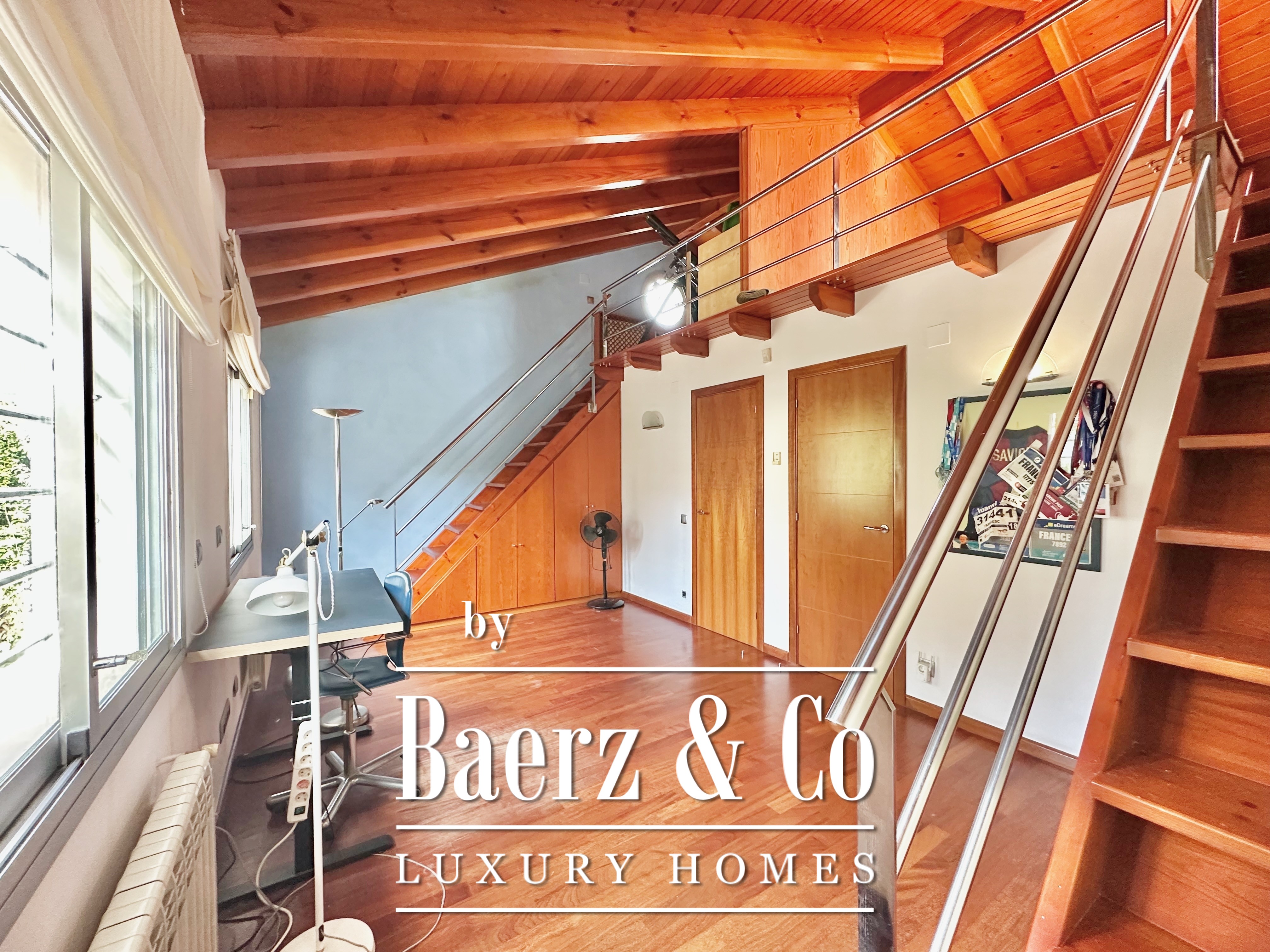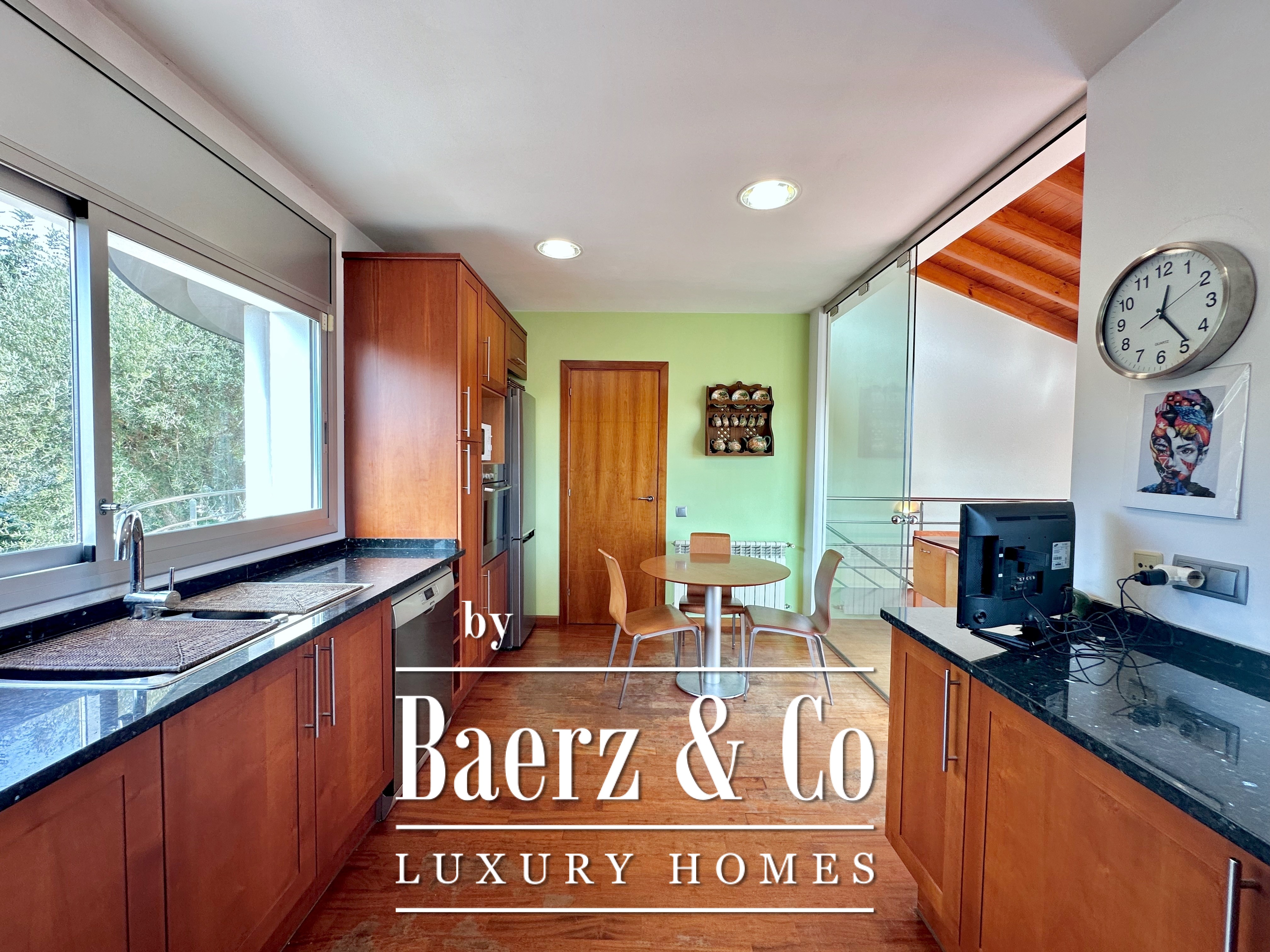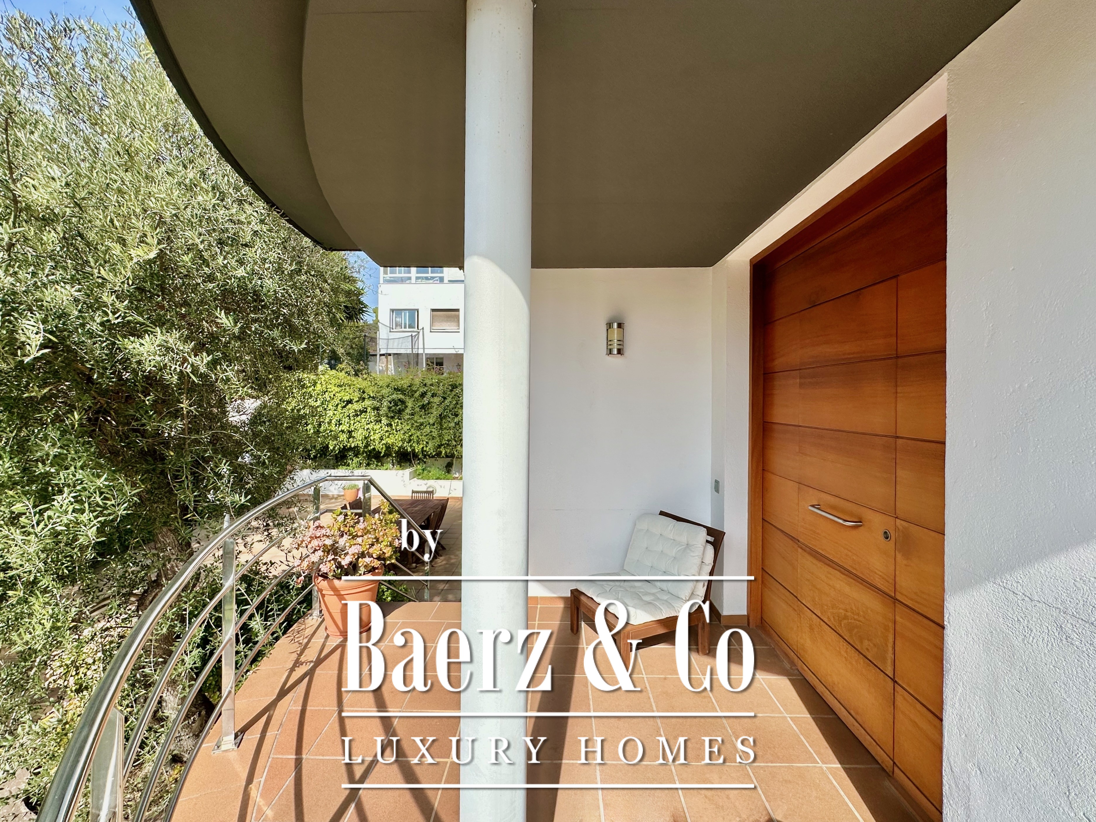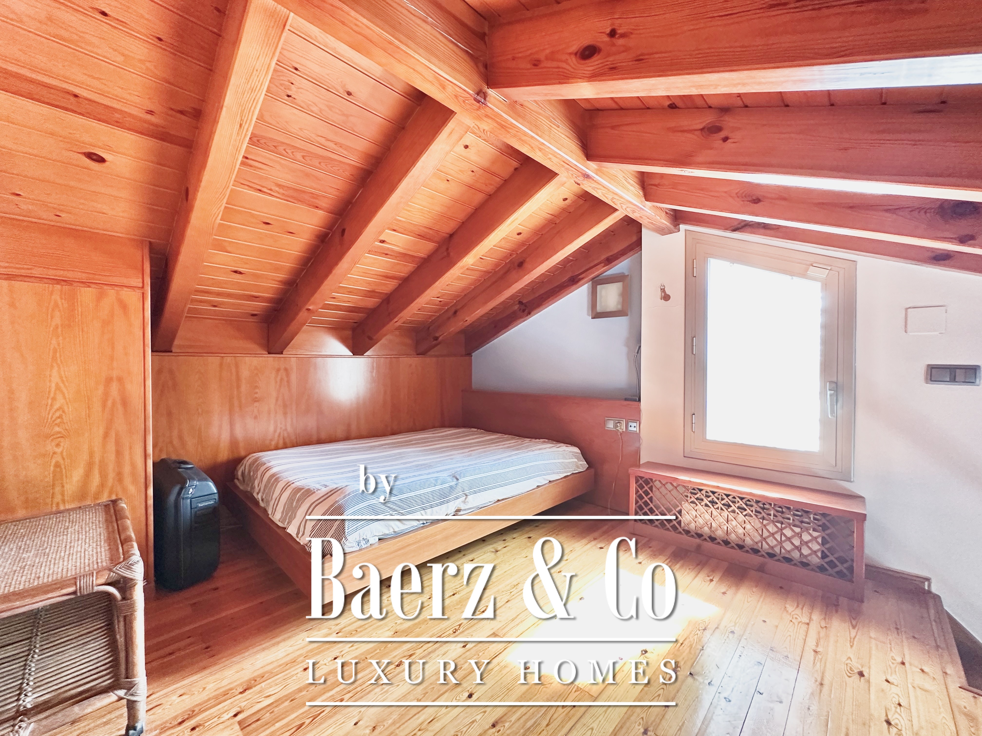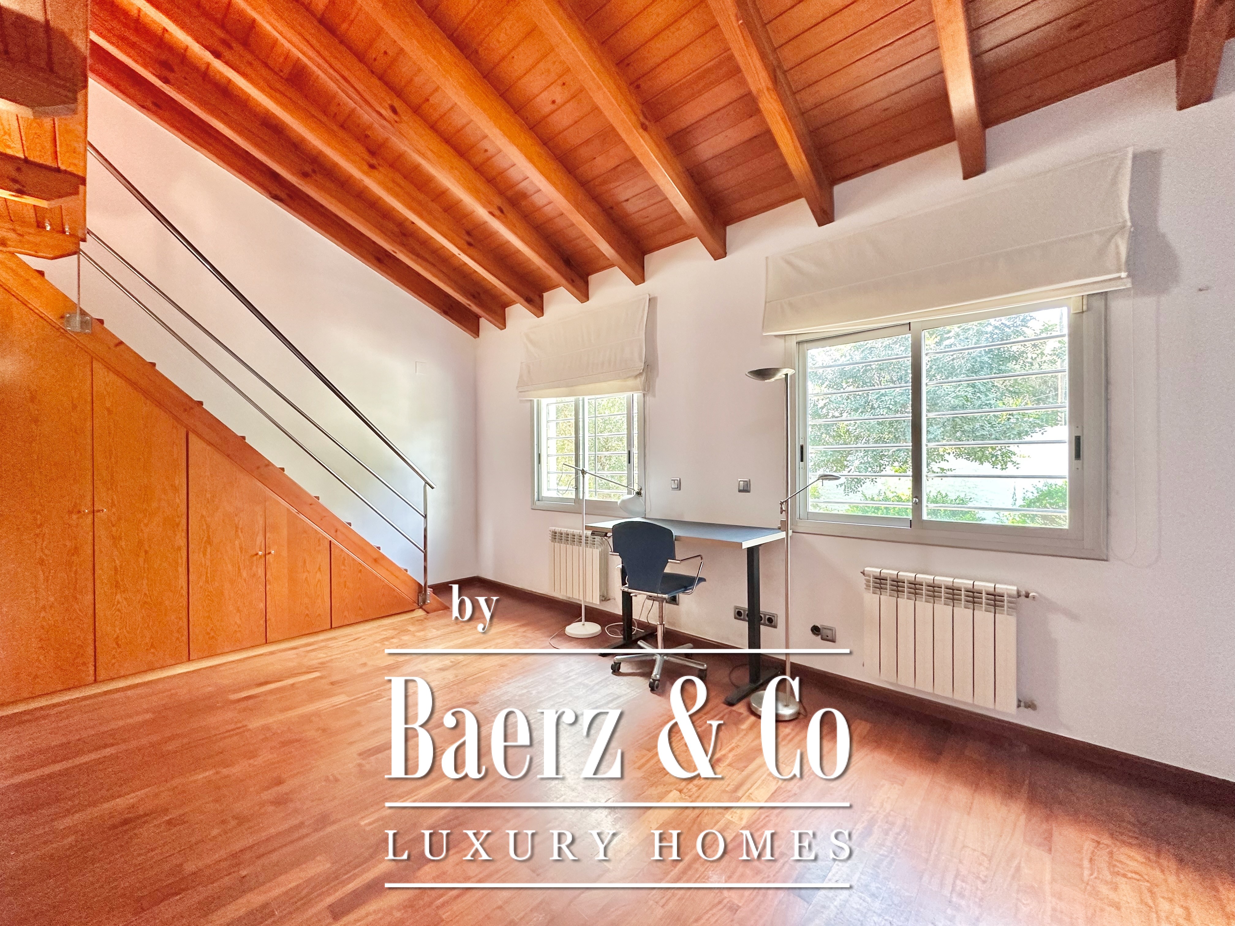 De privévertrekken bestaan uit vijf slaapkamers en twee badkamers. Twee dubbele kamers zijn samengevoegd tot een flexibele suite van meer dan 20 m², maar kunnen desgewenst eenvoudig weer gescheiden worden. Een zolder biedt mogelijkheden voor werk of ontspanning, met directe toegang tot een terras van 20 m² met panoramisch bergzicht. De hoofdsuite beschikt over een kleedruimte en een elegante badkamer met vijf elementen, en combineert comfort met ingetogen klasse. Deze vrijstaande woning te koop in Castelldefels integreert elk detail op doordachte wijze voor een levensstijl van allure in een van Spanje’s meest gewaardeerde kustplaatsen.