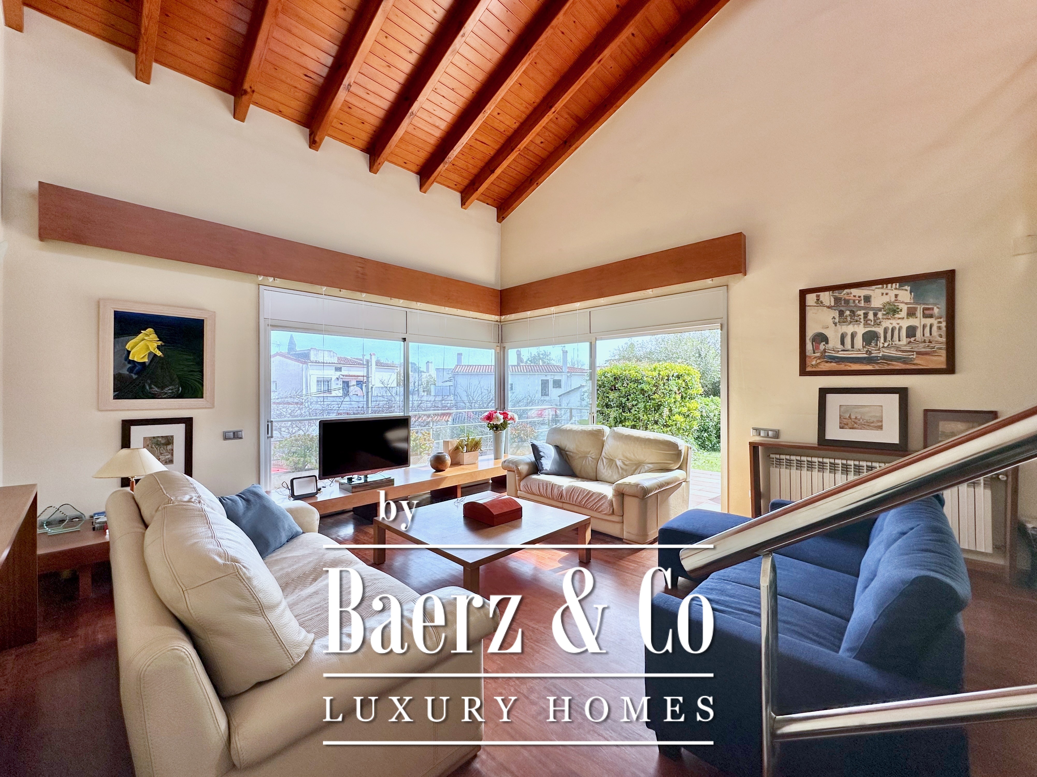 De hoofdverdieping wordt rijkelijk verlicht door grote ramen, waardoor de open keuken en eetruimte baden in daglicht. Een op het zuiden georiënteerd terras verlengt naadloos het woongedeelte naar buiten, waardoor het Mediterrane levensritme krachtig tot uiting komt. De eetkamer valt op door het schuin aflopende houten plafond met zichtbare balken, wat warmte en architectonisch karakter toevoegt. Deze ruimte is visueel en ruimtelijk verbonden met de royale woonkamer eronder en versterkt zo het gevoel van openheid in het huis.