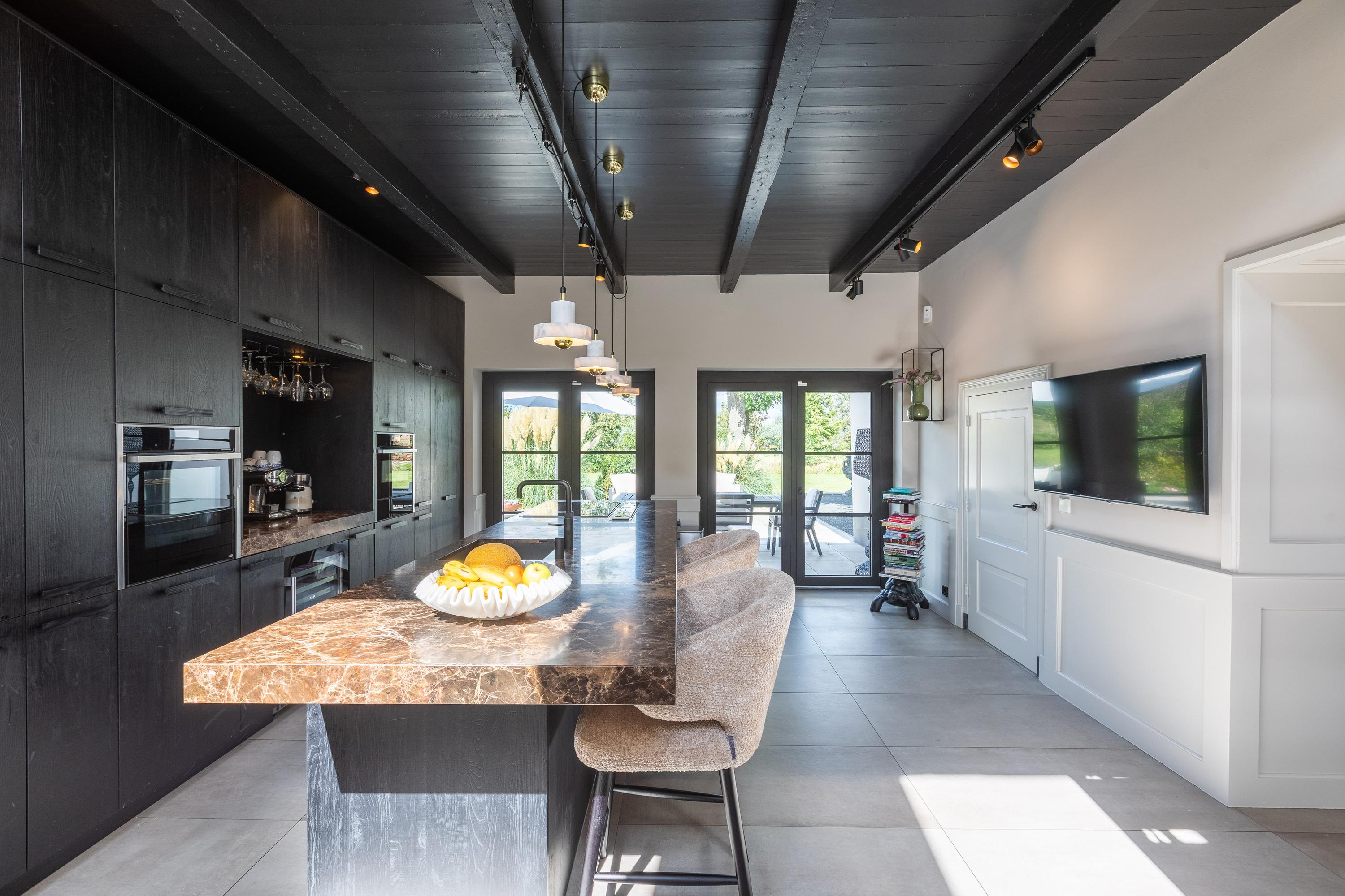 Daarnaast beschikt de begane grond over een tweede moderne keuken bij het terras en een multifunctionele ruimte van ca. 85 m² in de voormalige stal, voorzien van een bar, pantry, toilet en toegang tot de garages en bergruimte. Aan de andere zijde van deze ruimte betreedt u de royale aanbouw met wellness, compleet ingericht met jacuzzi, Finse sauna, infraroodsauna en voldoende plek voor een grote eettafel of een lounge set– een heerlijke plek om te ontspannen en samen te genieten.