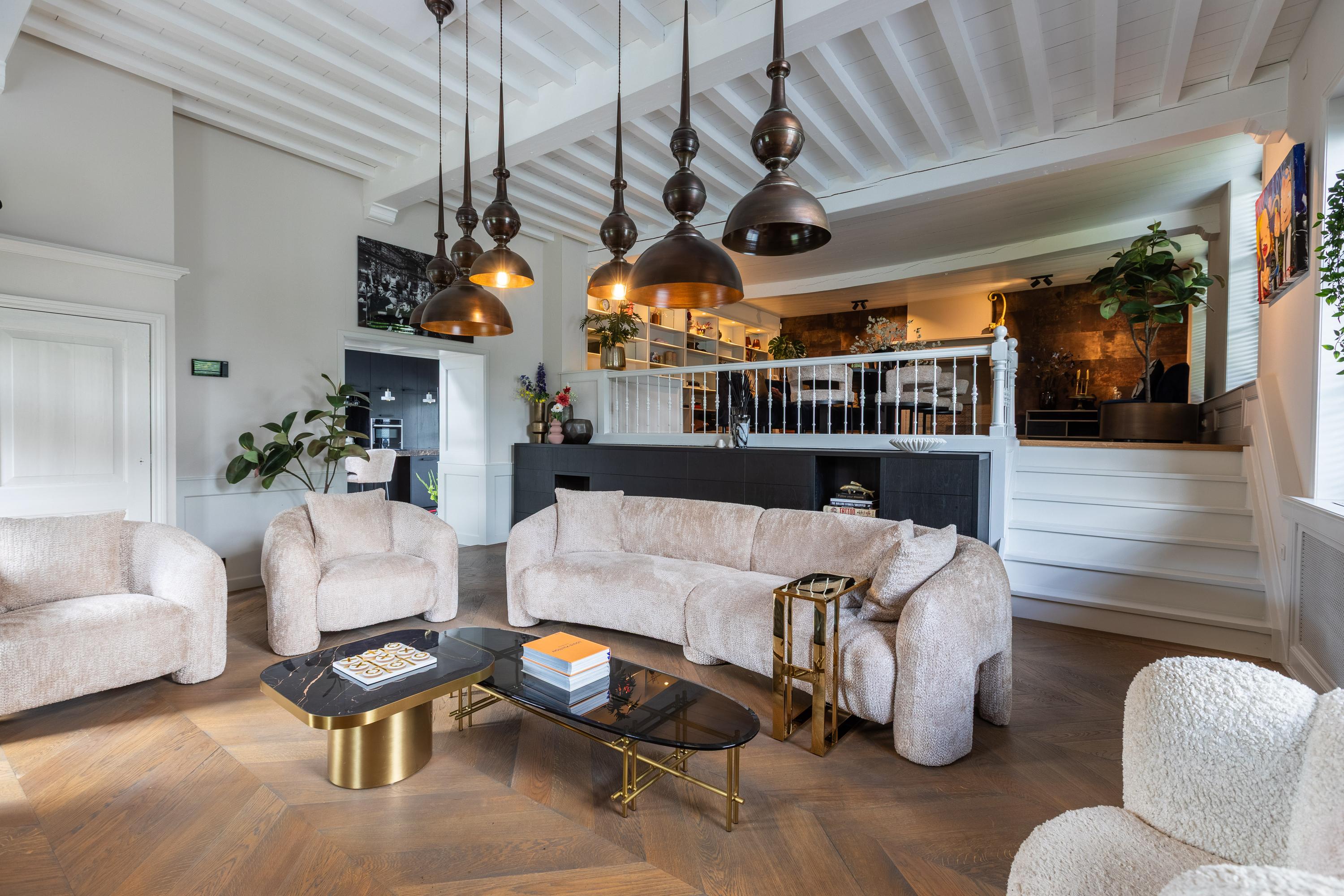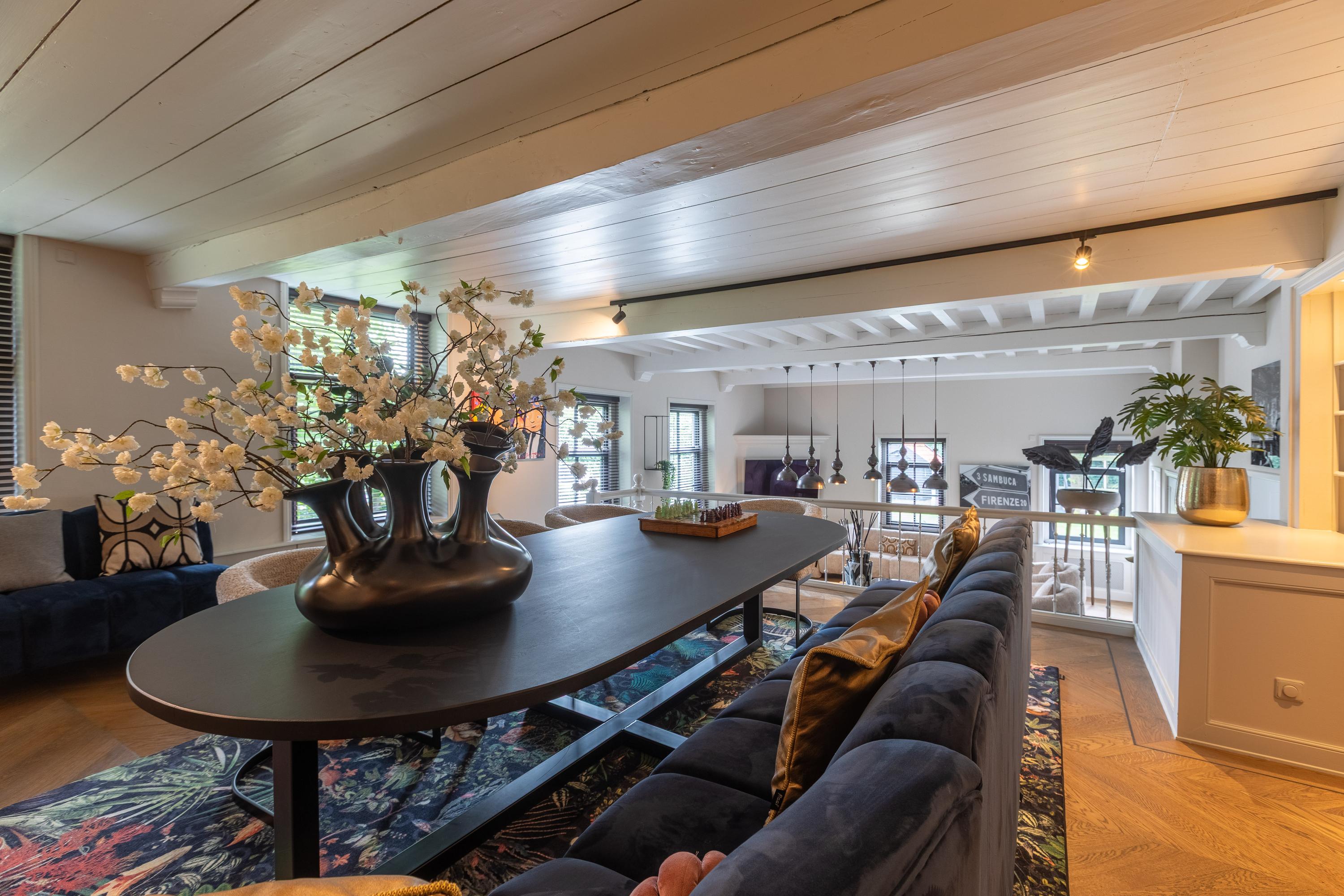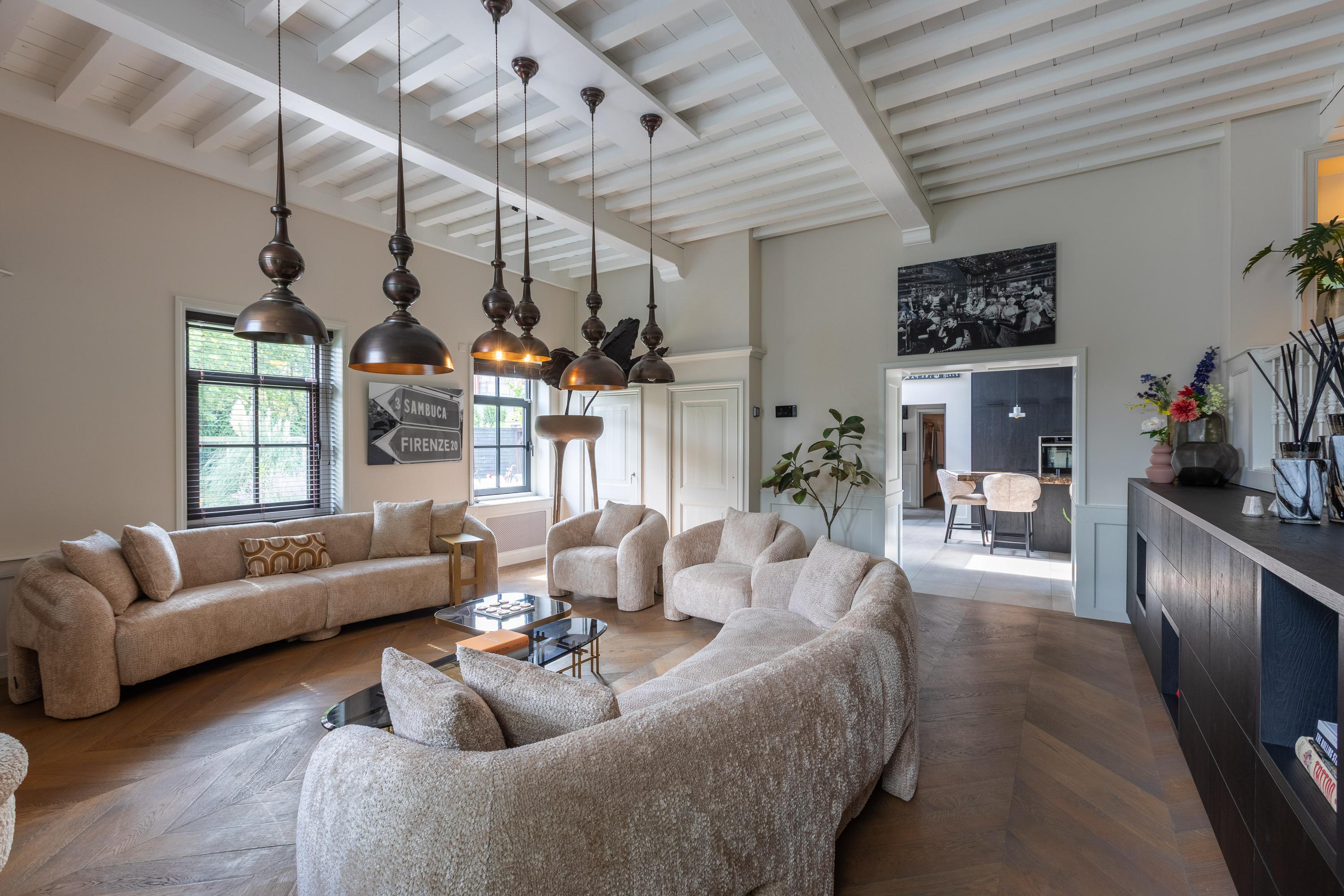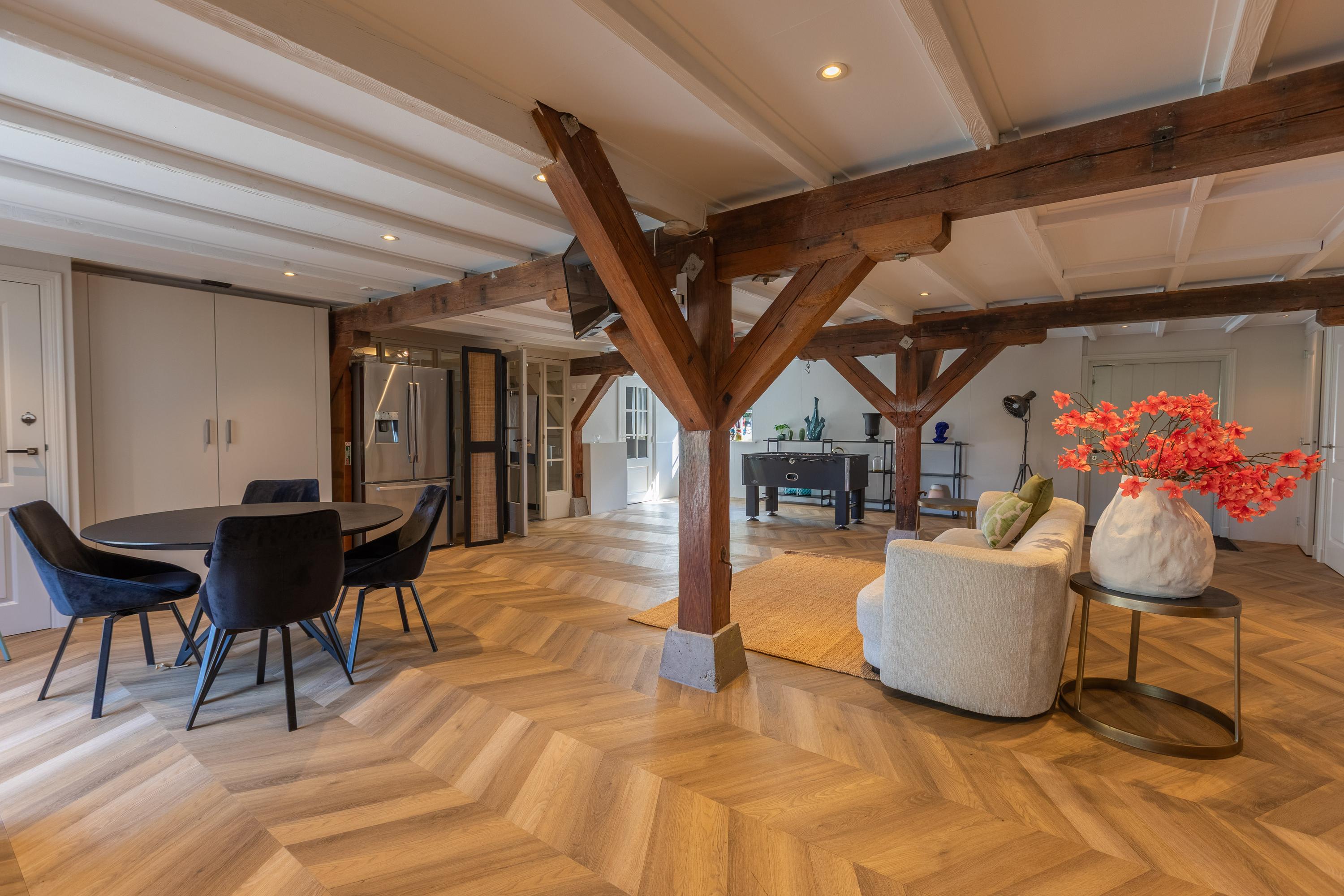 Aansluitend vindt u de stijlvolle woonkamer, bestaande uit twee delen die naar eigen wens zijn in te delen. Momenteel is de eetkamer gesitueerd in de voormalige opkamer (het verhoogde gedeelte) en de zitkamer in het lager gelegen deel, waar het karakteristieke balkenplafond direct in het oog springt. Desgewenst kunnen eet- en woonkamer eenvoudig worden omgewisseld.