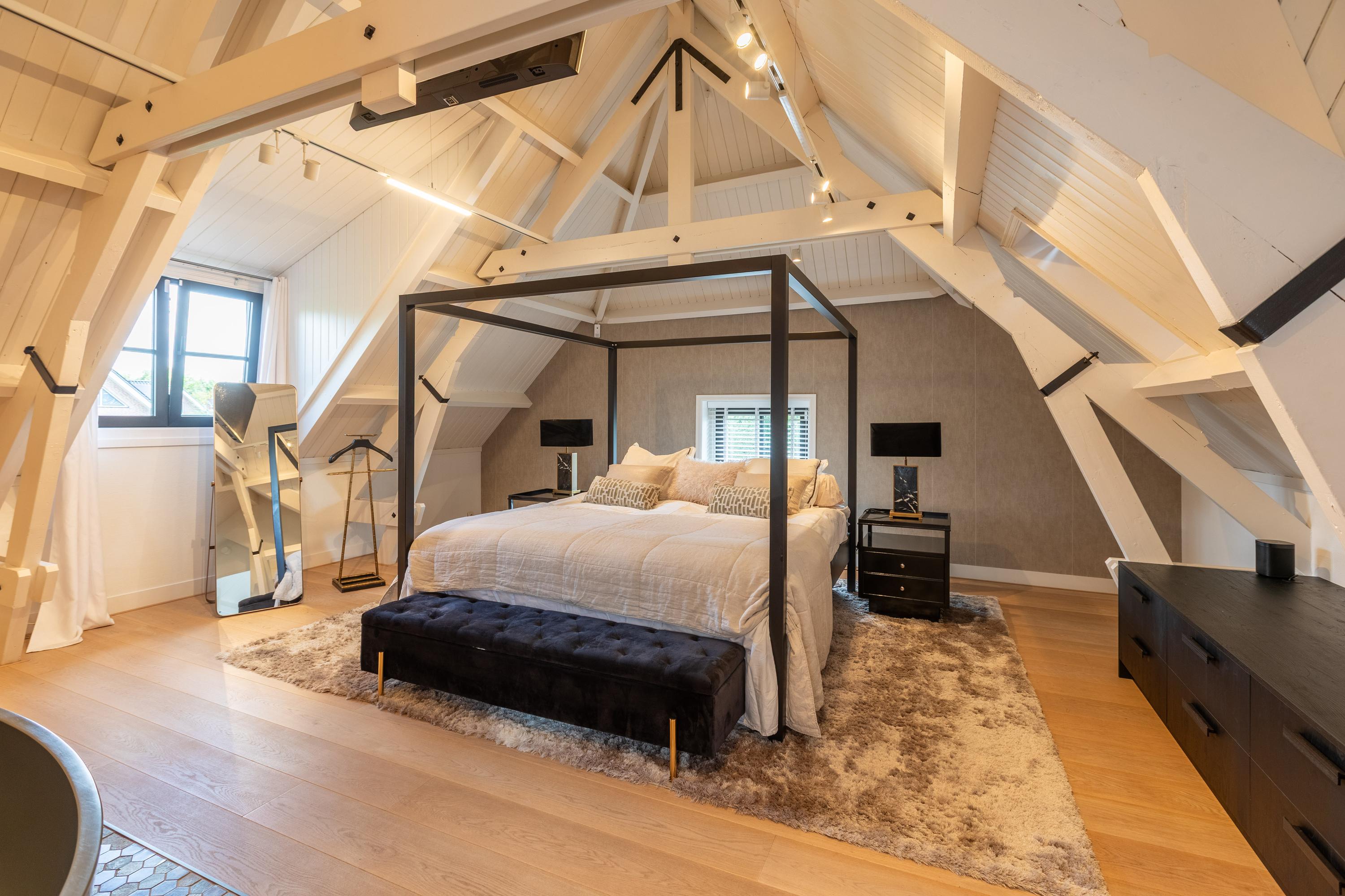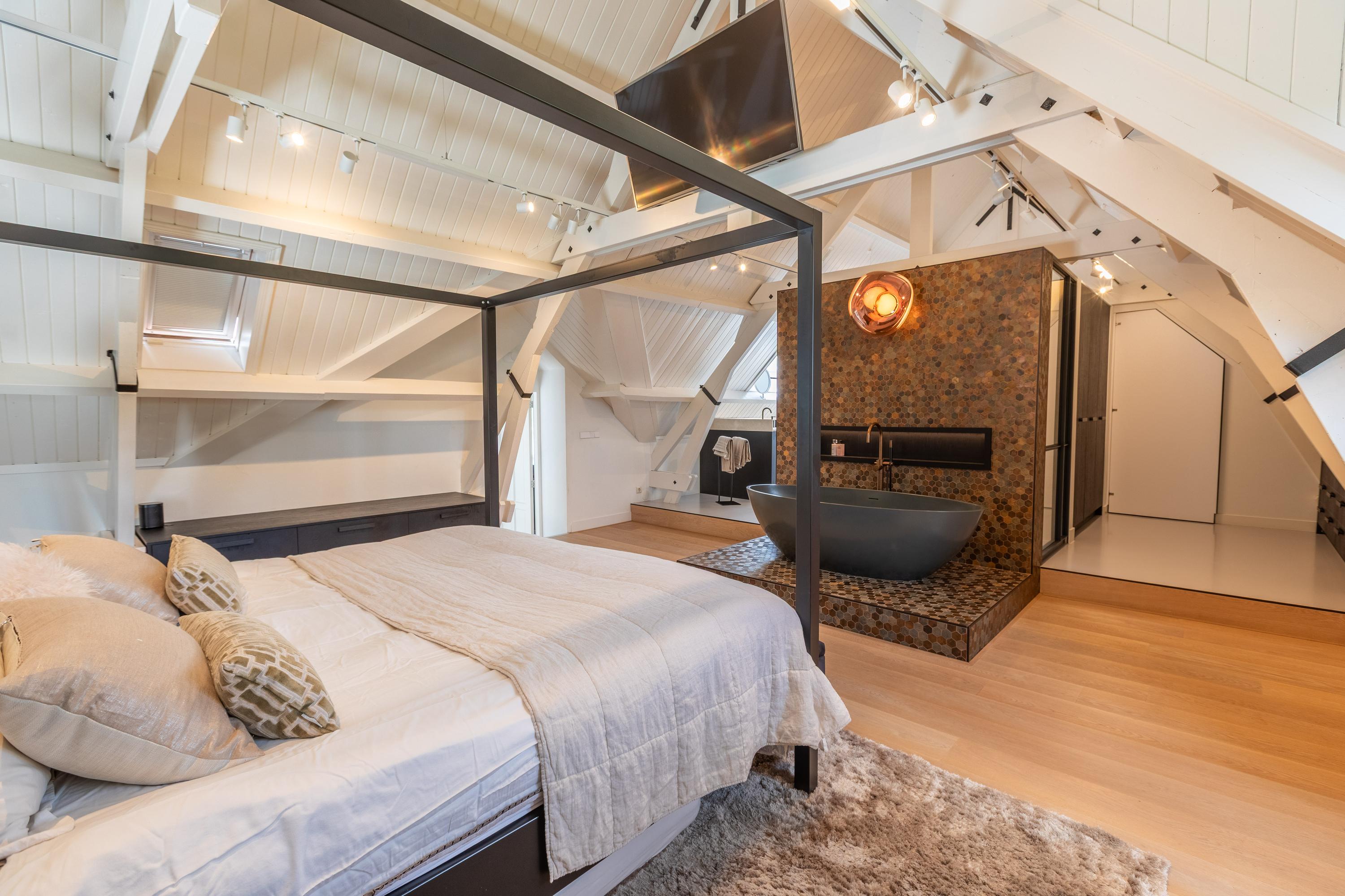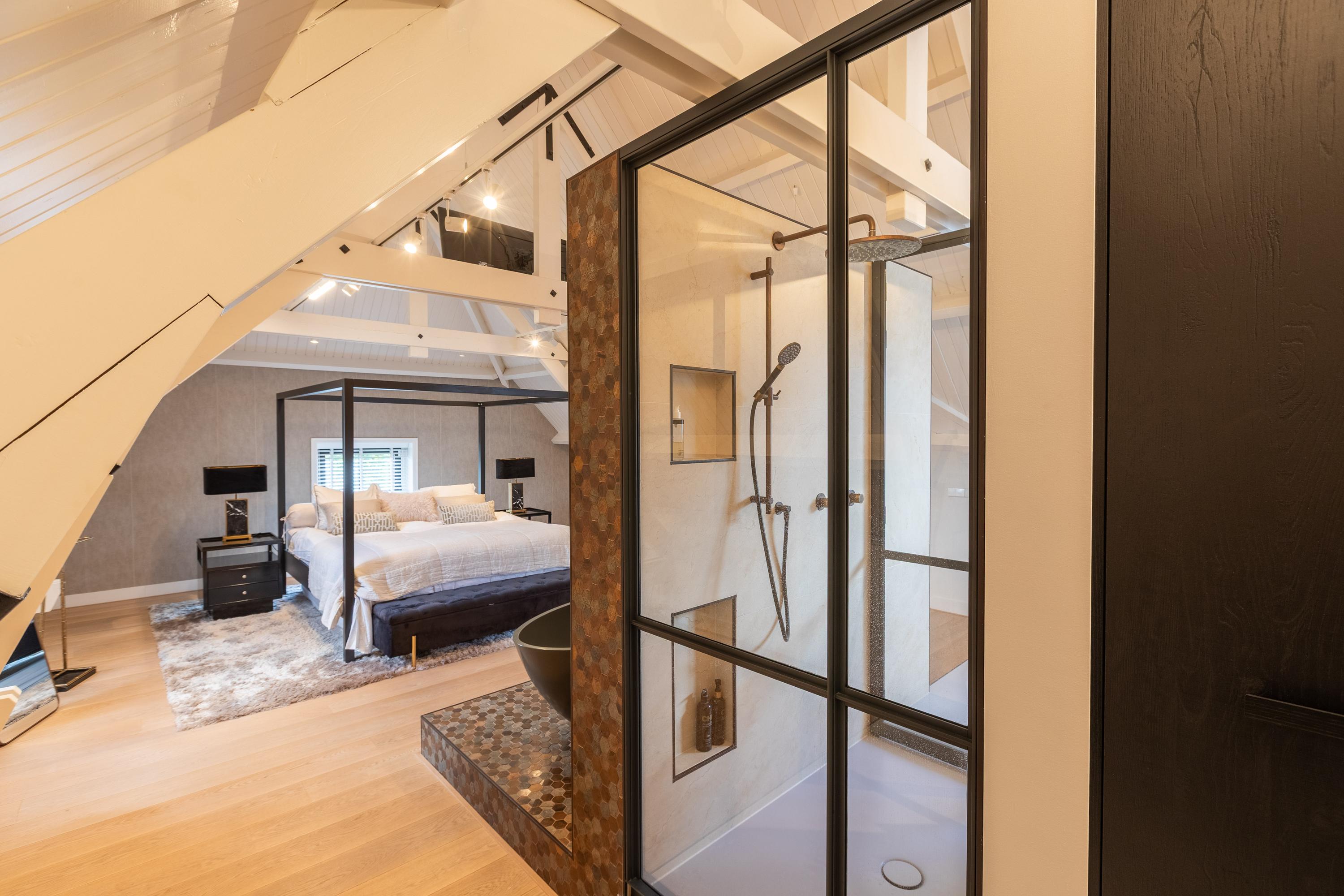 Een ruime overloop boven de keuken geeft toegang tot de master bedroom (ca. 65 m²) v.v. airco met karakteristieke houten kapbalken, een luxe badkamer en suite met vrijstaand bad, inloopdouche, toilet en dubbele wastafel, plus een walk-in closet met dakkapel en uitzicht op het groen van Midden-Delfland.