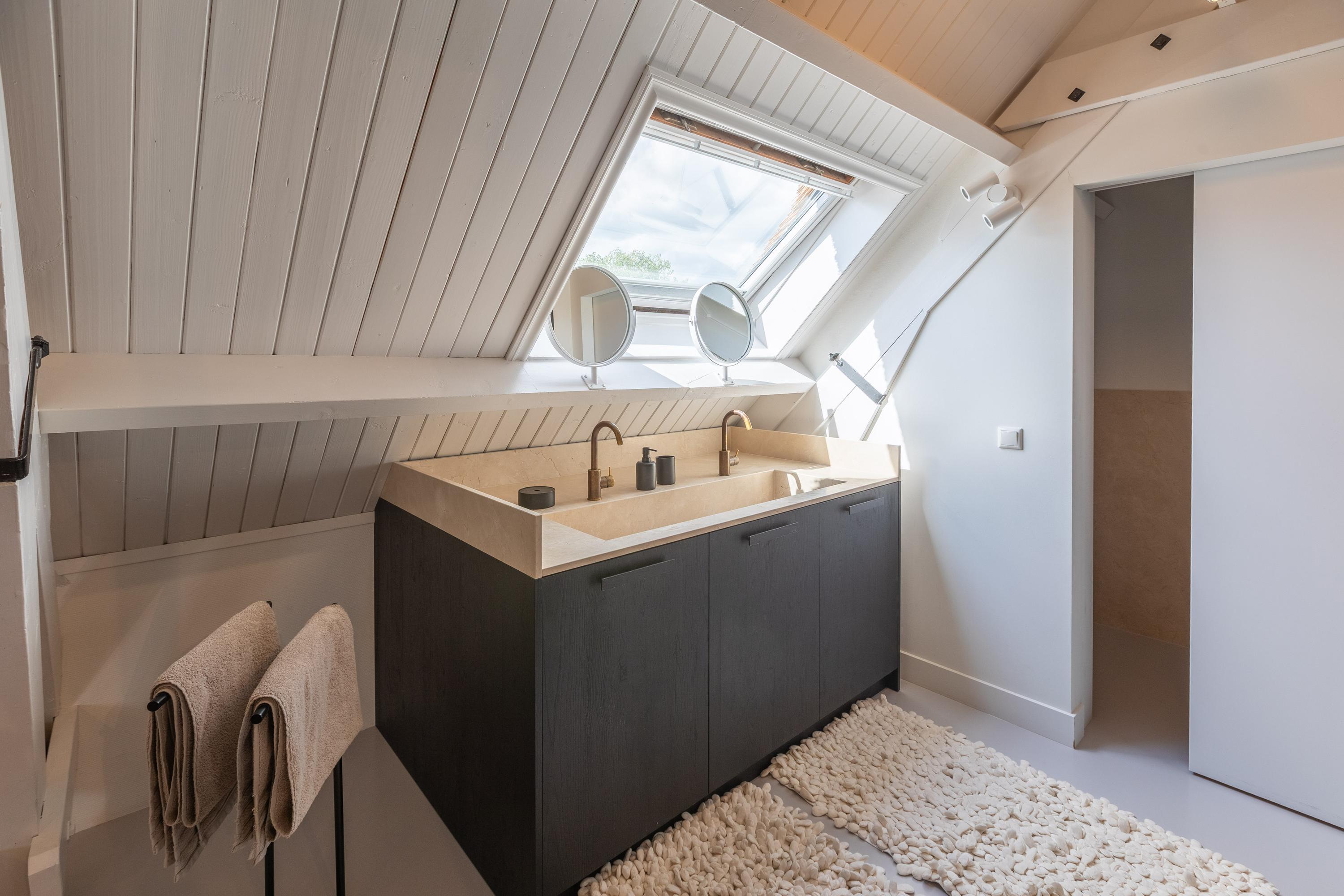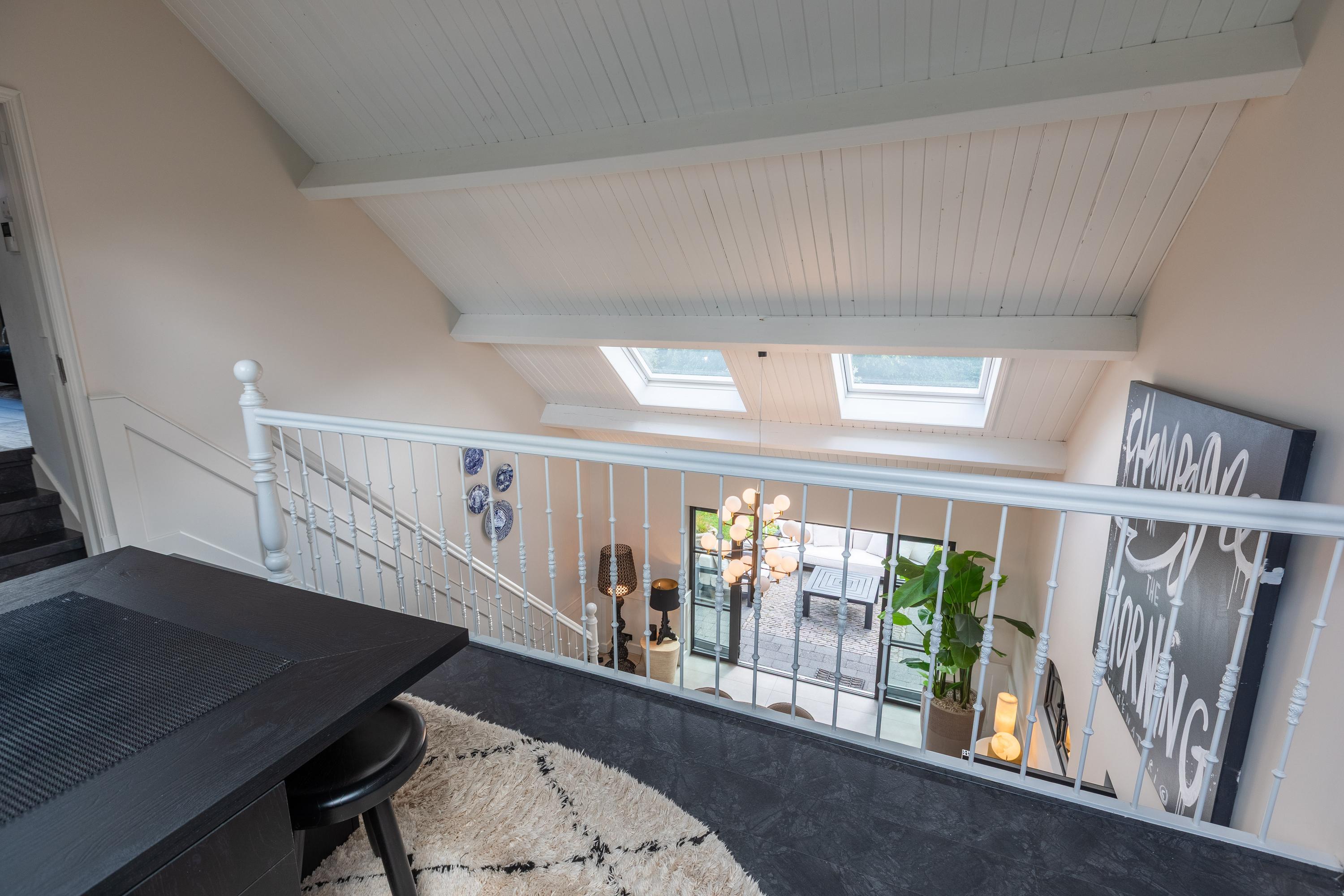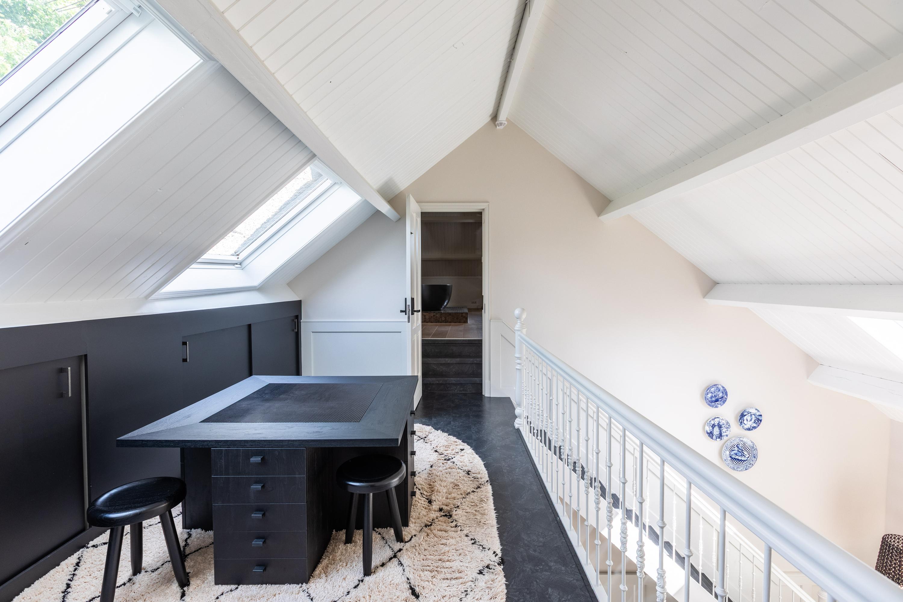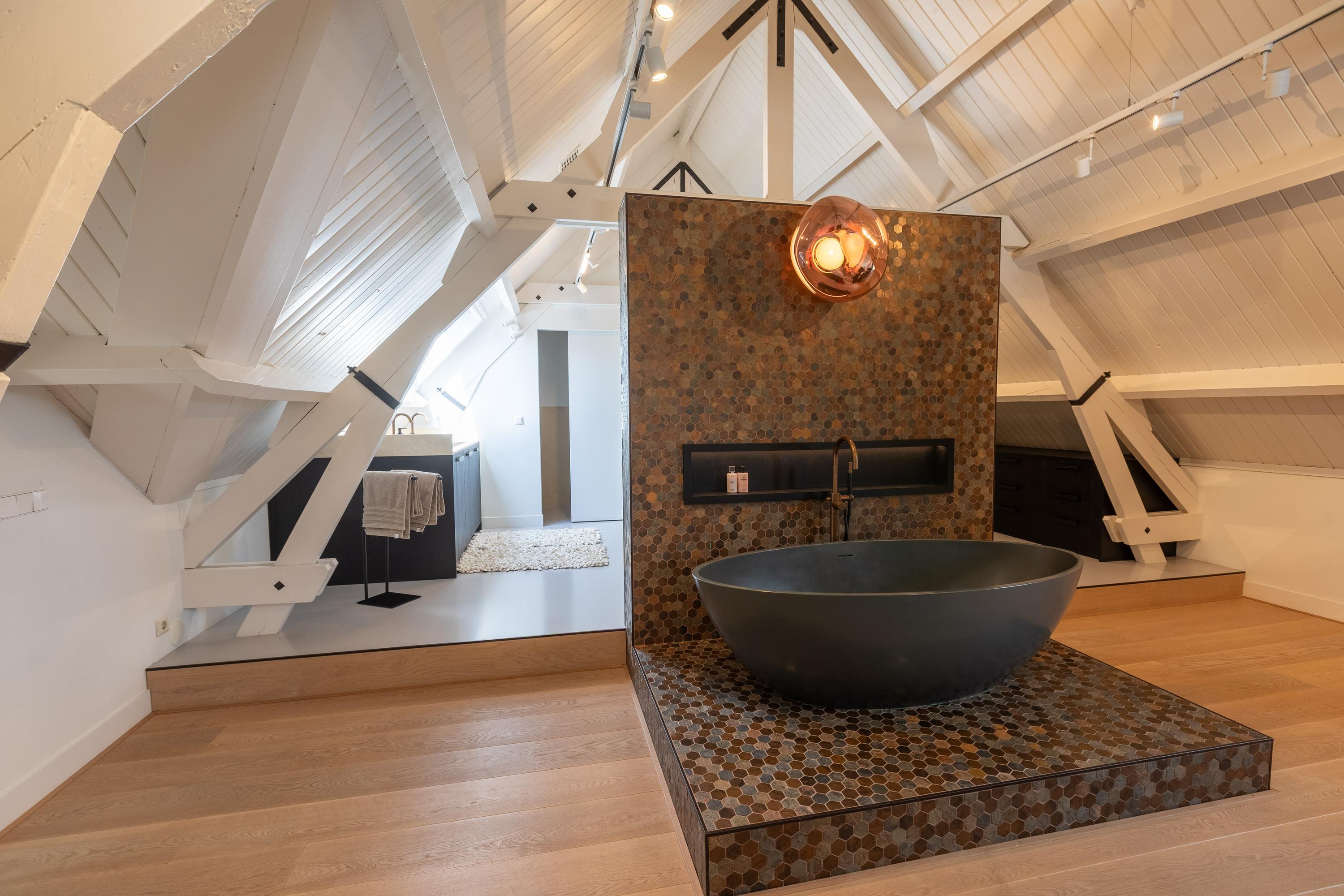 Een ruime overloop boven de keuken geeft toegang tot de master bedroom (ca. 65 m²) v.v. airco met karakteristieke houten kapbalken, een luxe badkamer en suite met vrijstaand bad, inloopdouche, toilet en dubbele wastafel, plus een walk-in closet met dakkapel en uitzicht op het groen van Midden-Delfland.