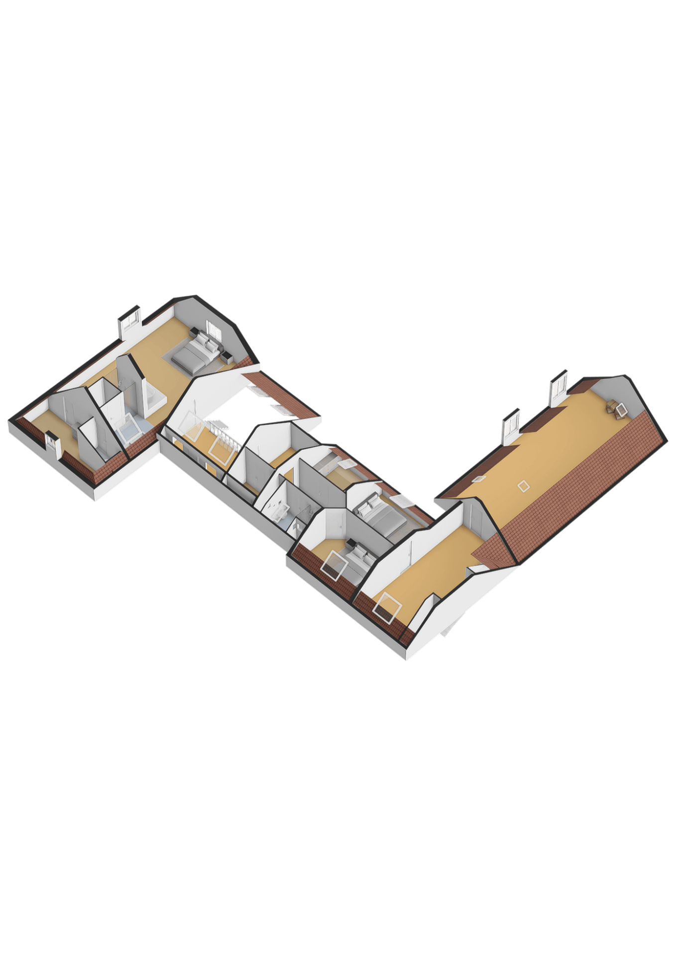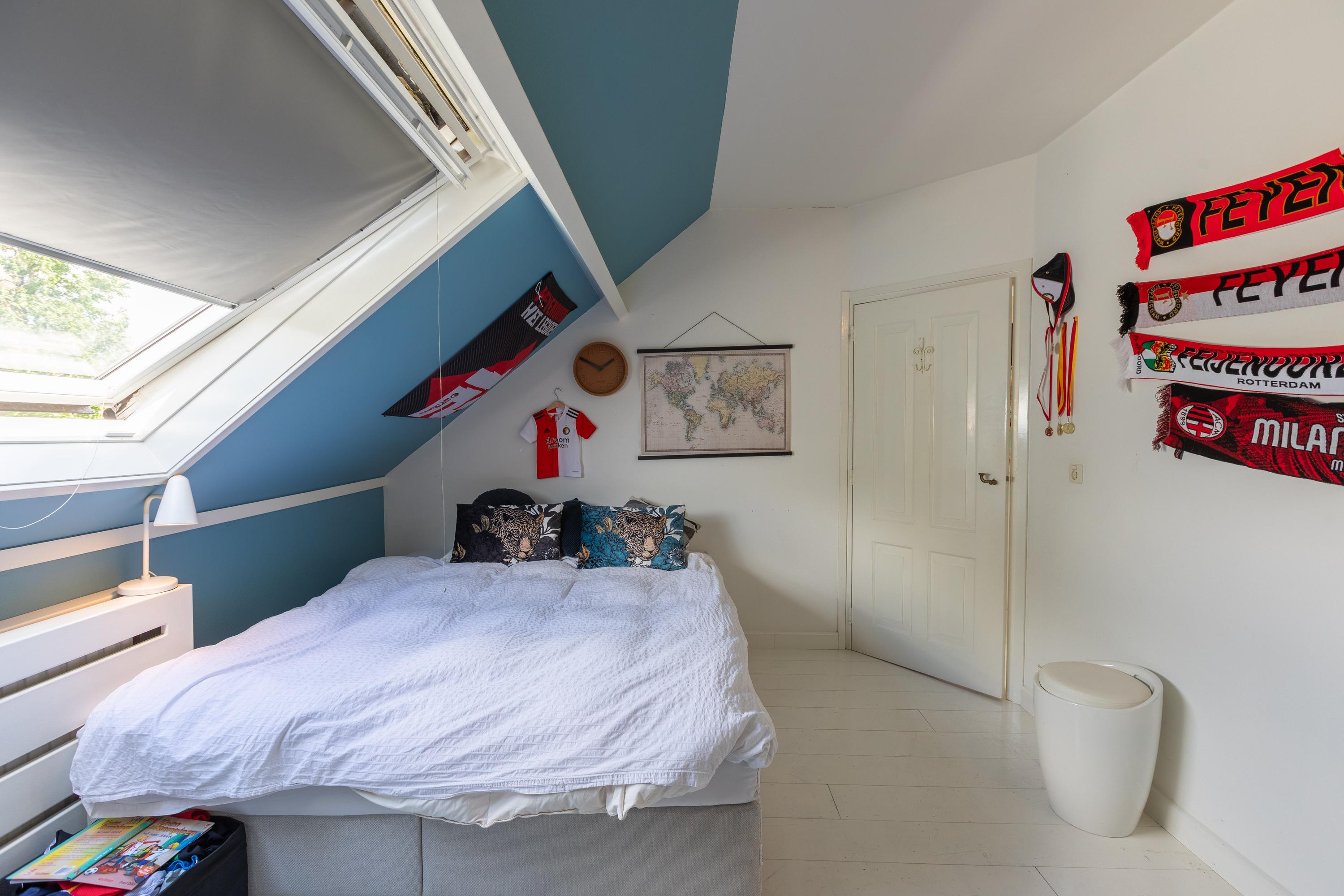Aan de andere zijde van de overloop bevinden zich een hal met cv-ruimte, drie volwaardige slaapkamers voorzien van airco, een moderne tweede badkamer met douche, toilet en wastafel en een aparte werkkamer.