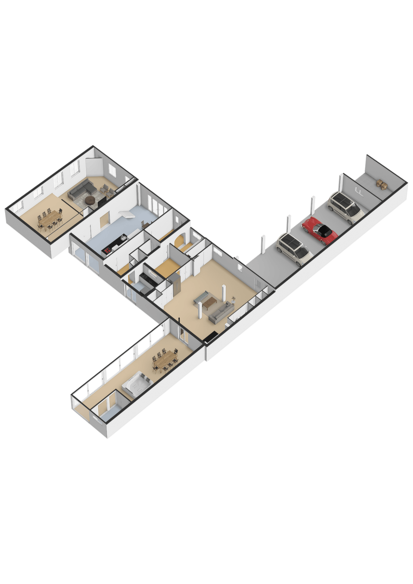 - Garage met vier deuren, gym en zolder (65 m²) met potentie tot uitbreiding met mogelijkheid tot een eigen ingang;