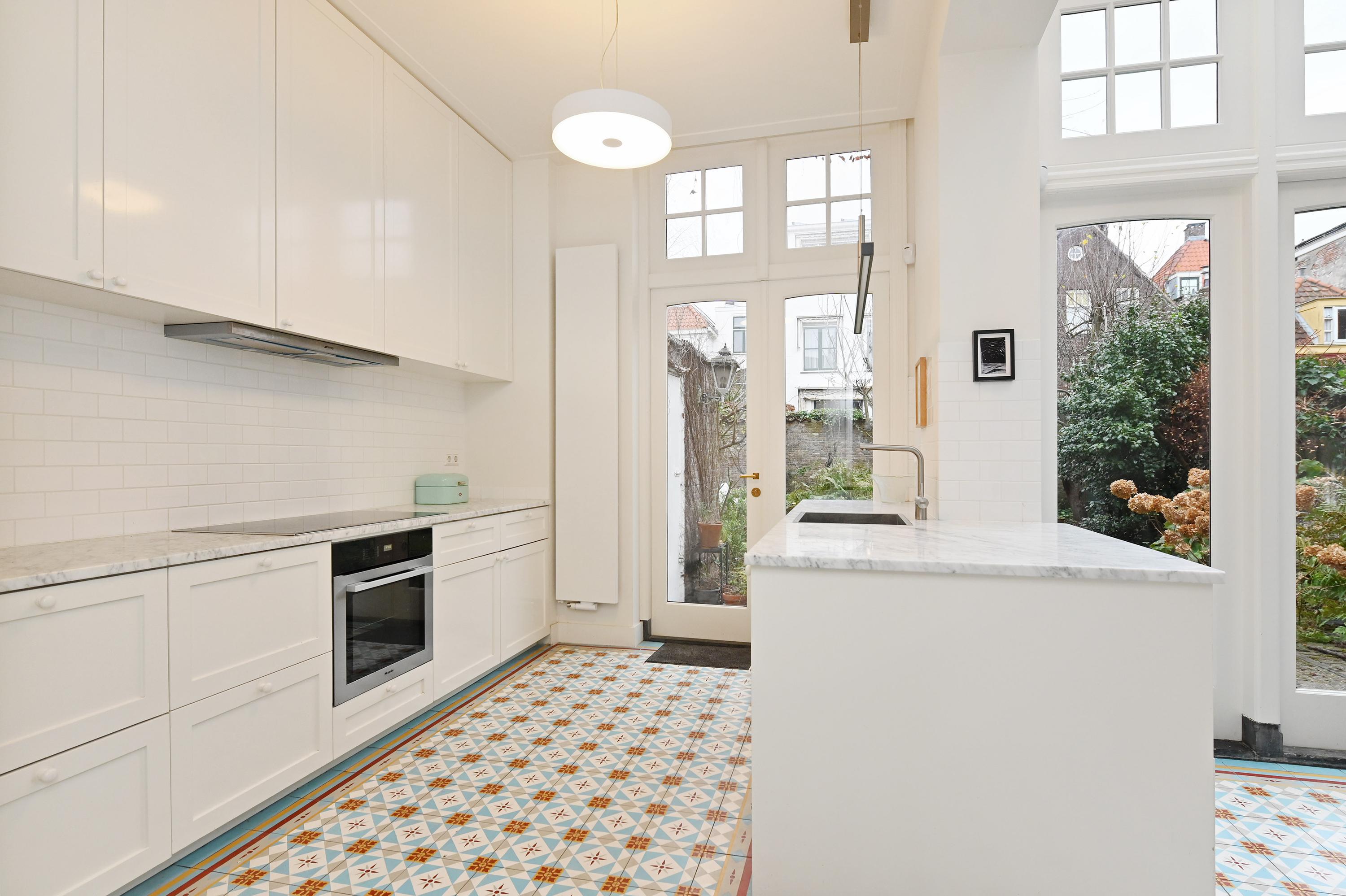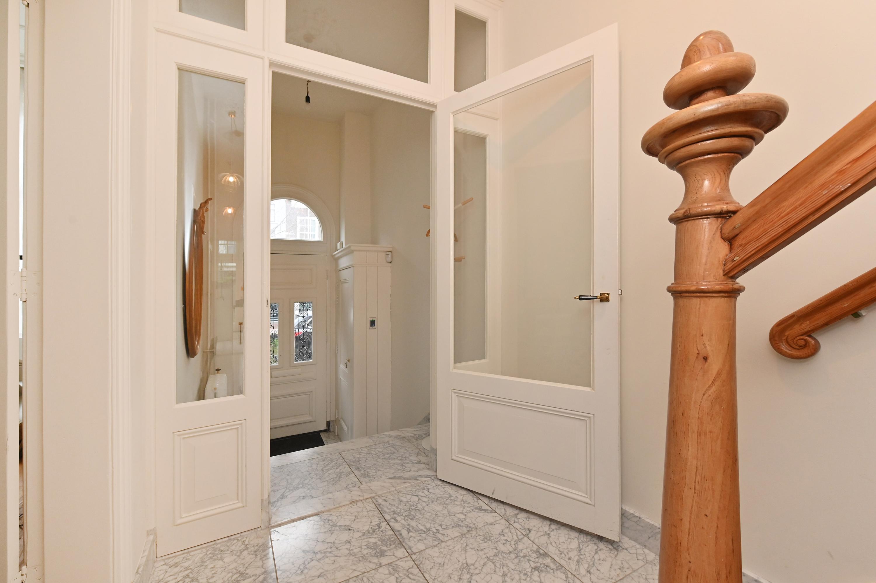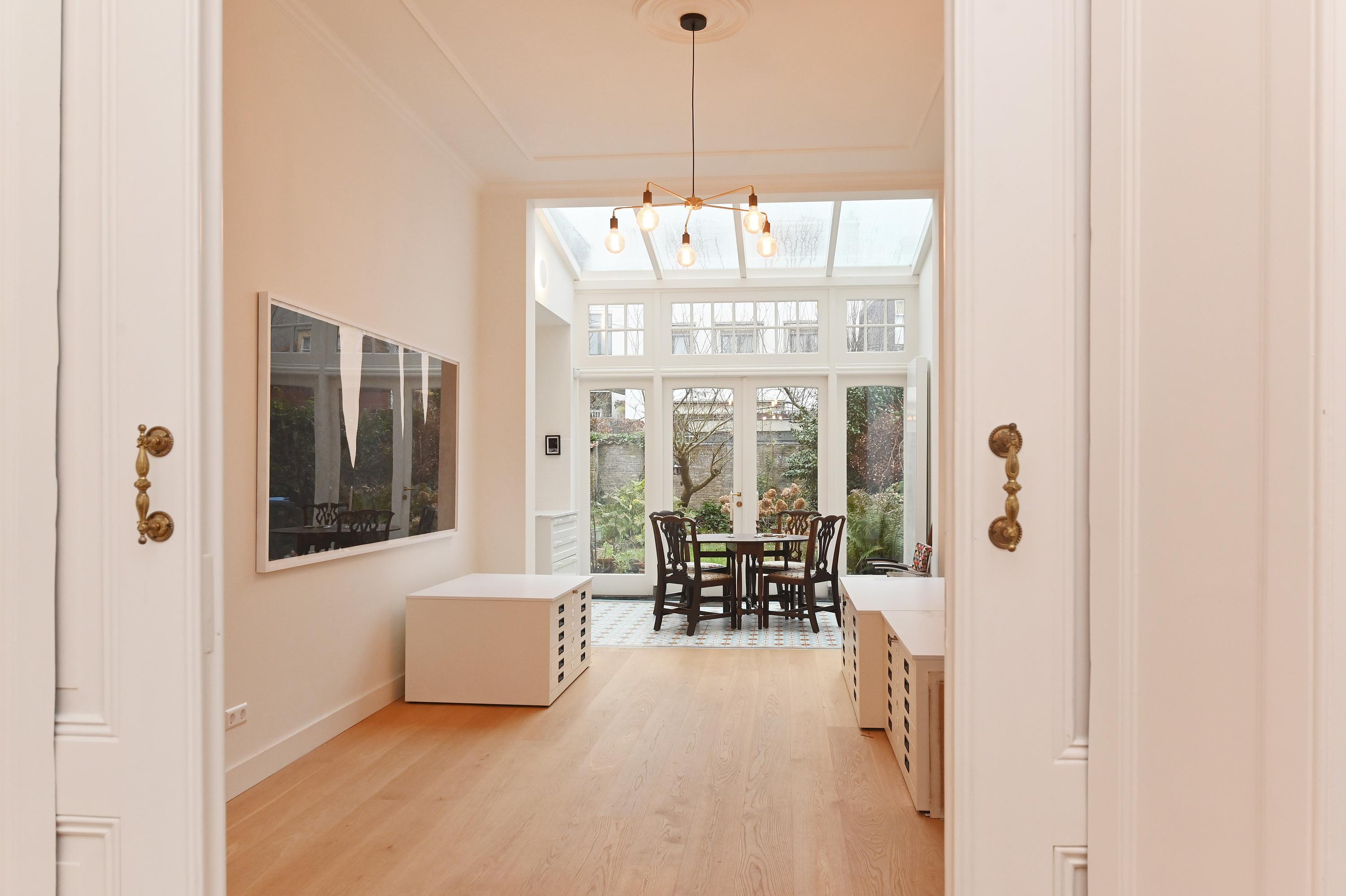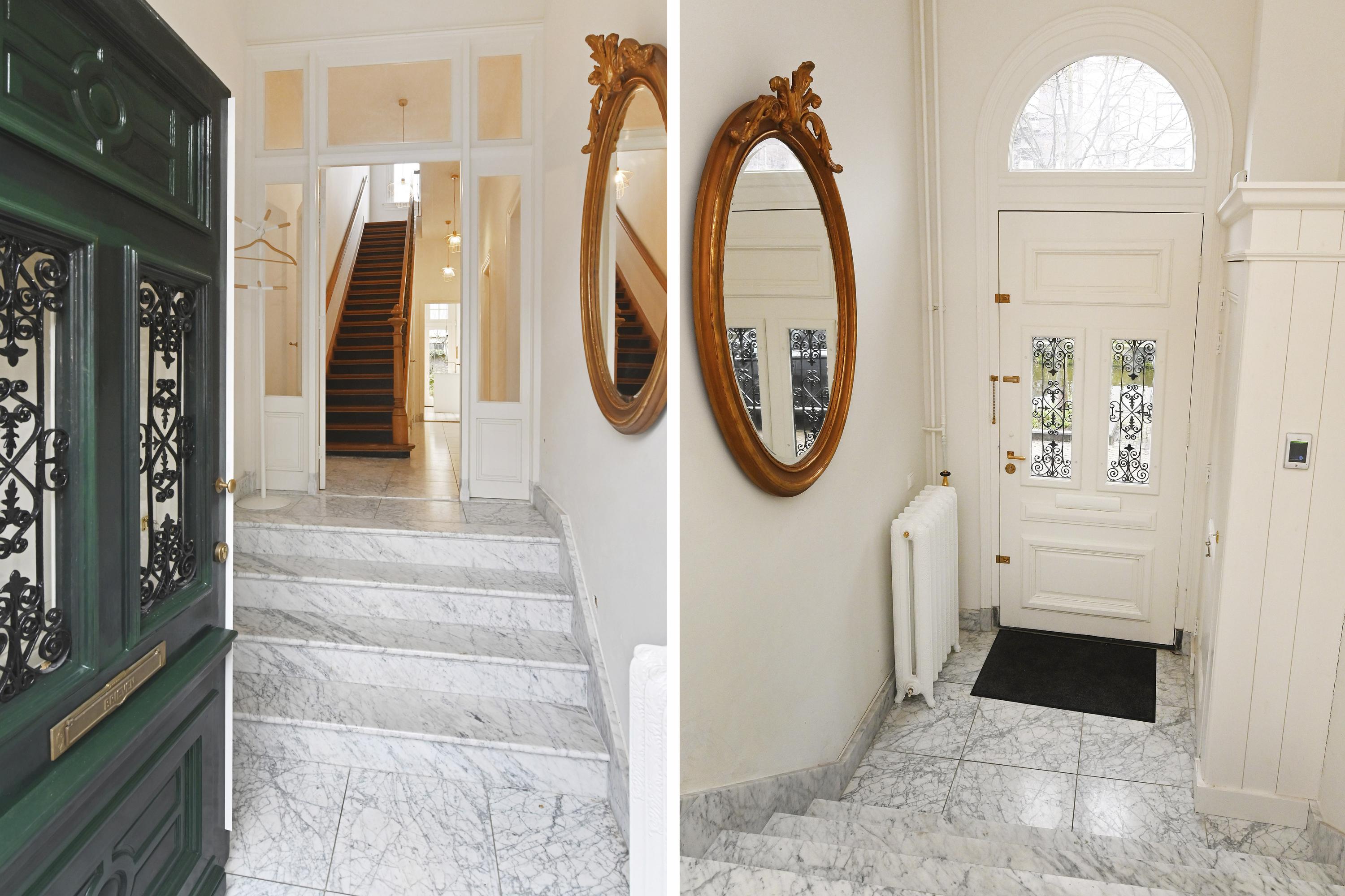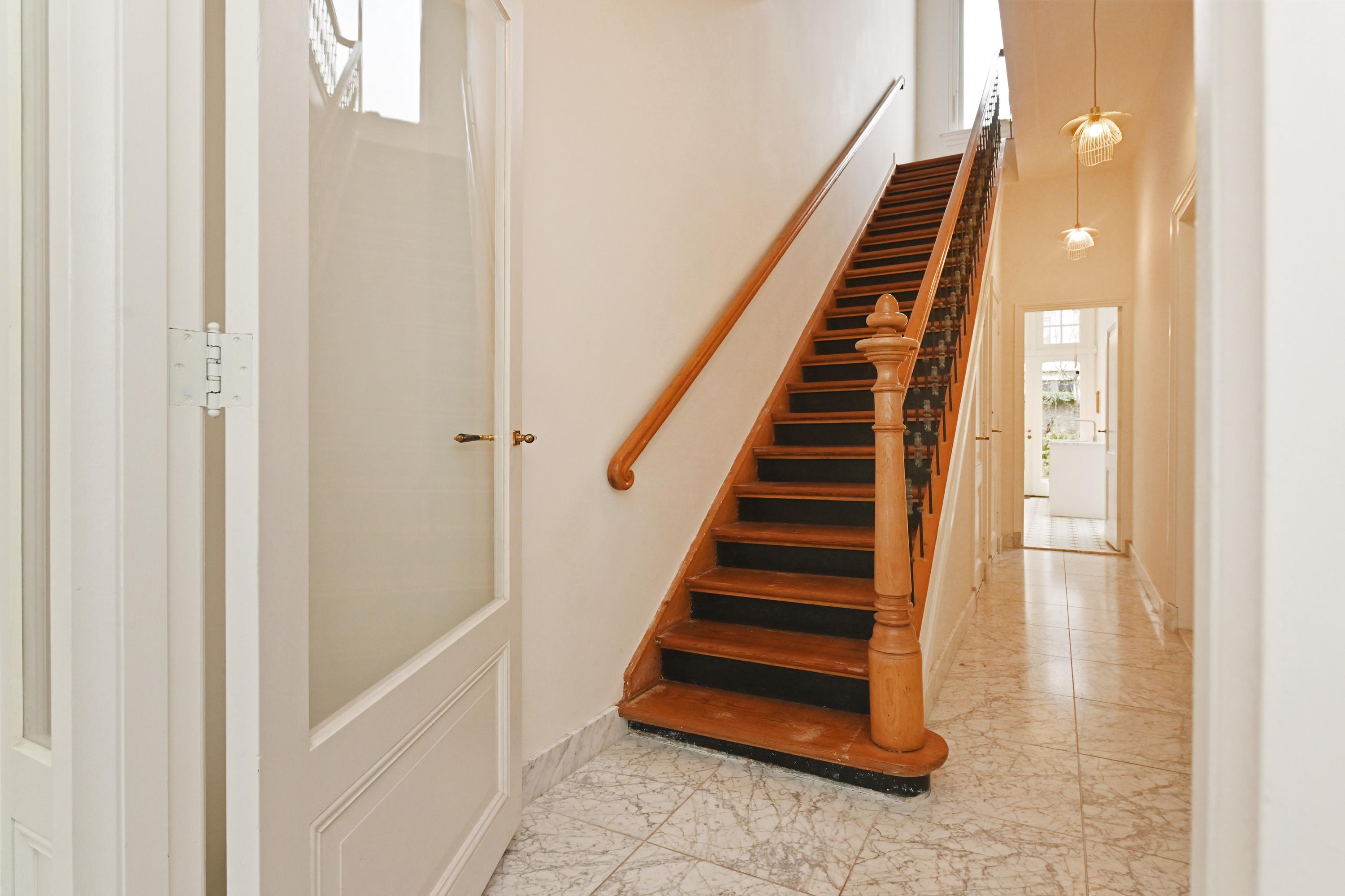 Binnenkomst in de vestibule, een marmeren trap naar de gang. In de hal is een kelderkast en een moderne toiletruimte. Vanuit de hal is er toegang tot de open keuken en de woonkamer. De woonkamer is stijlvol met hoge plafonds met sierlijsten, ingebouwde en-suite kasten en prachtige schuifdeuren naar de eetkamer. De eetkamer is heel bijzonder door de prachtige uitbouw aan de achterzijde met een schitterende lichtinval, en de hoge raampartij met roedeverdeling. De keuken heeft een semi-kookeiland waarvan je contact hebt met de kamer en vanaf de keuken prachtig uitzicht over de tuin. De keuken is modern afgewerkt met een marmeren blad en heeft diverse inbouwapparatuur.