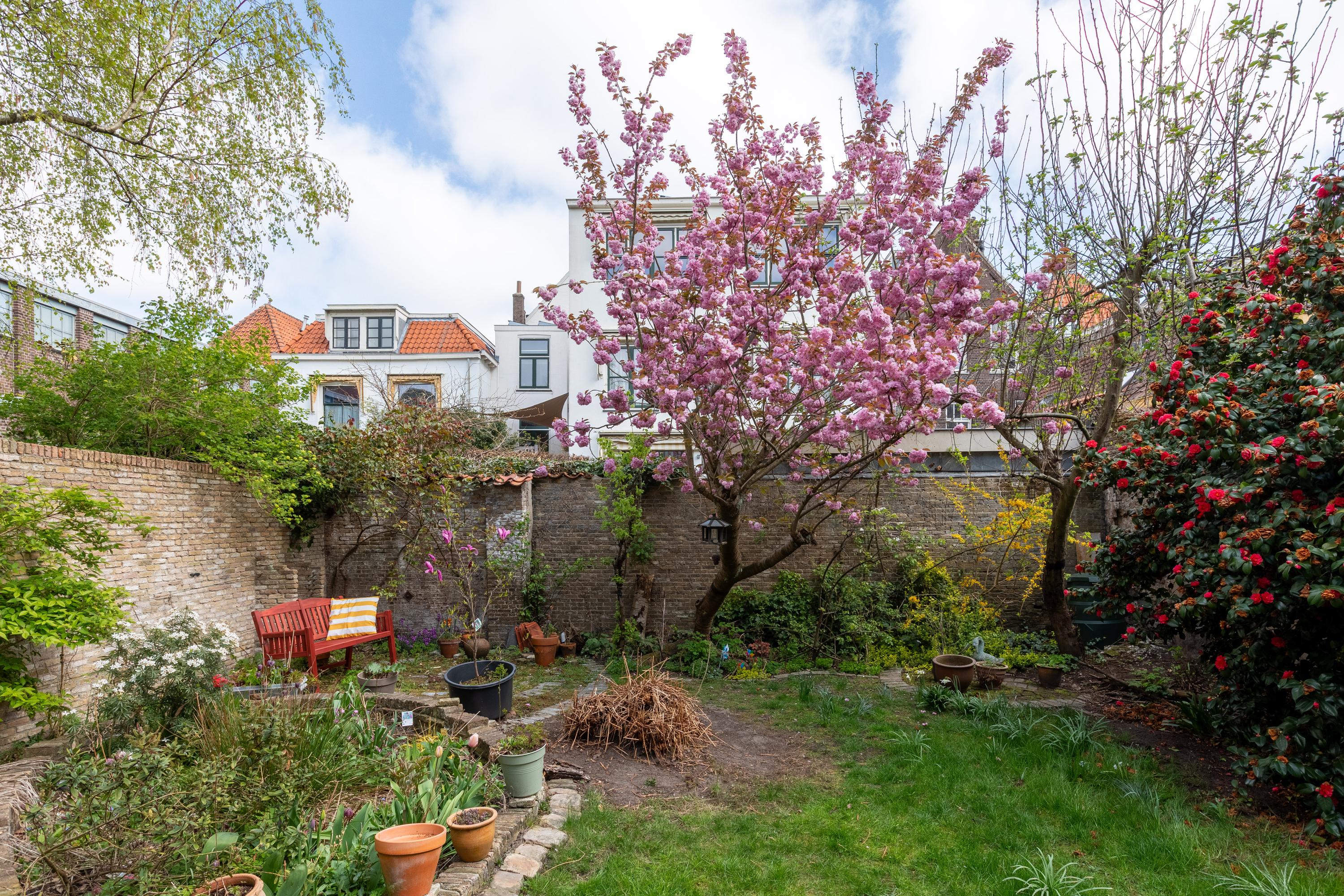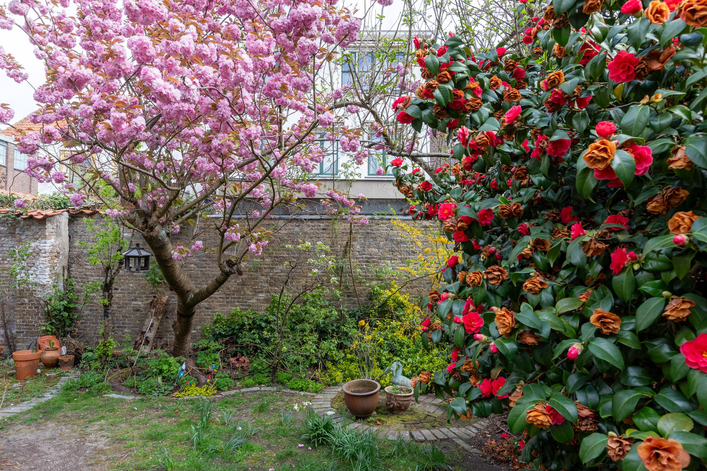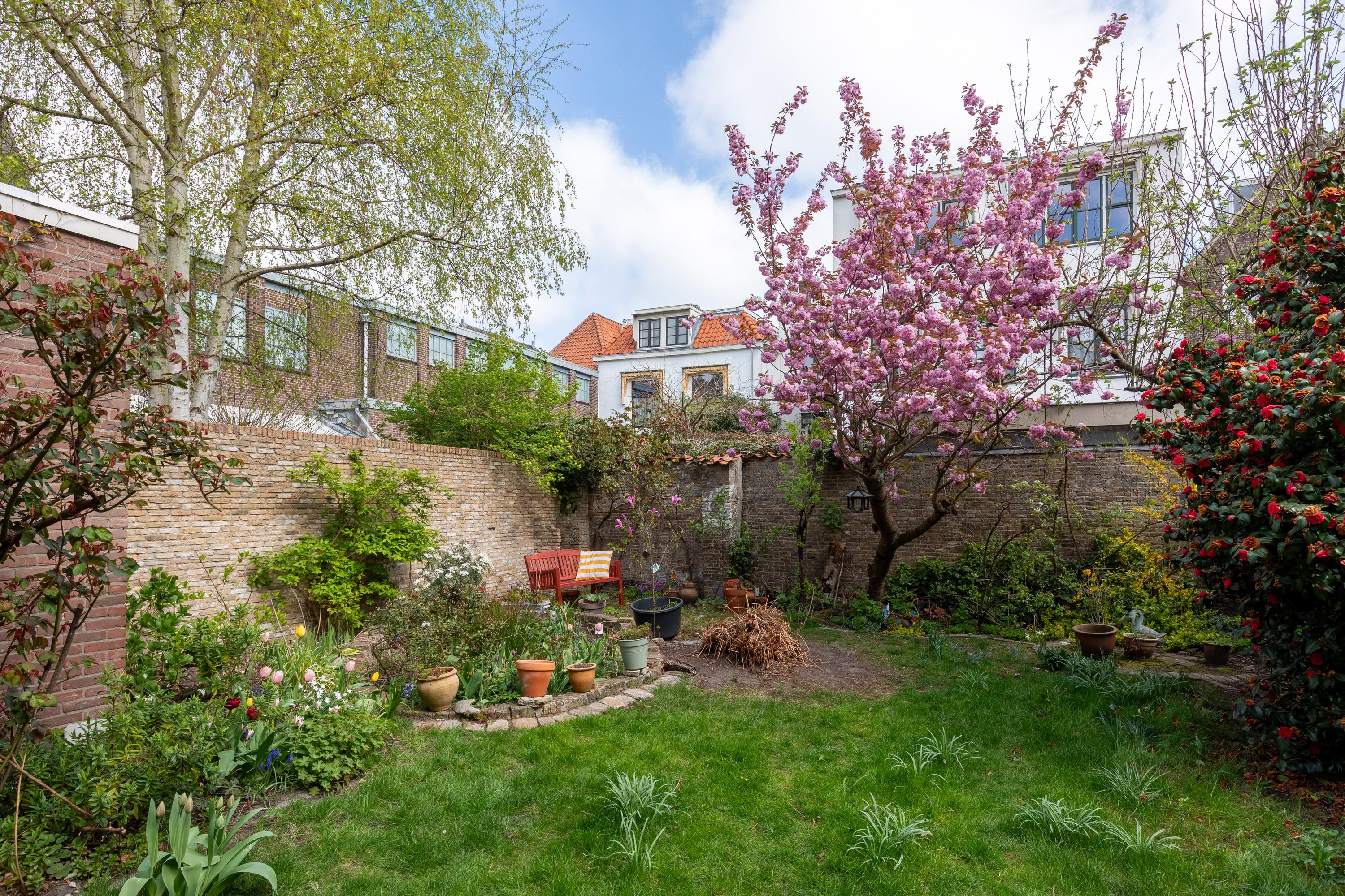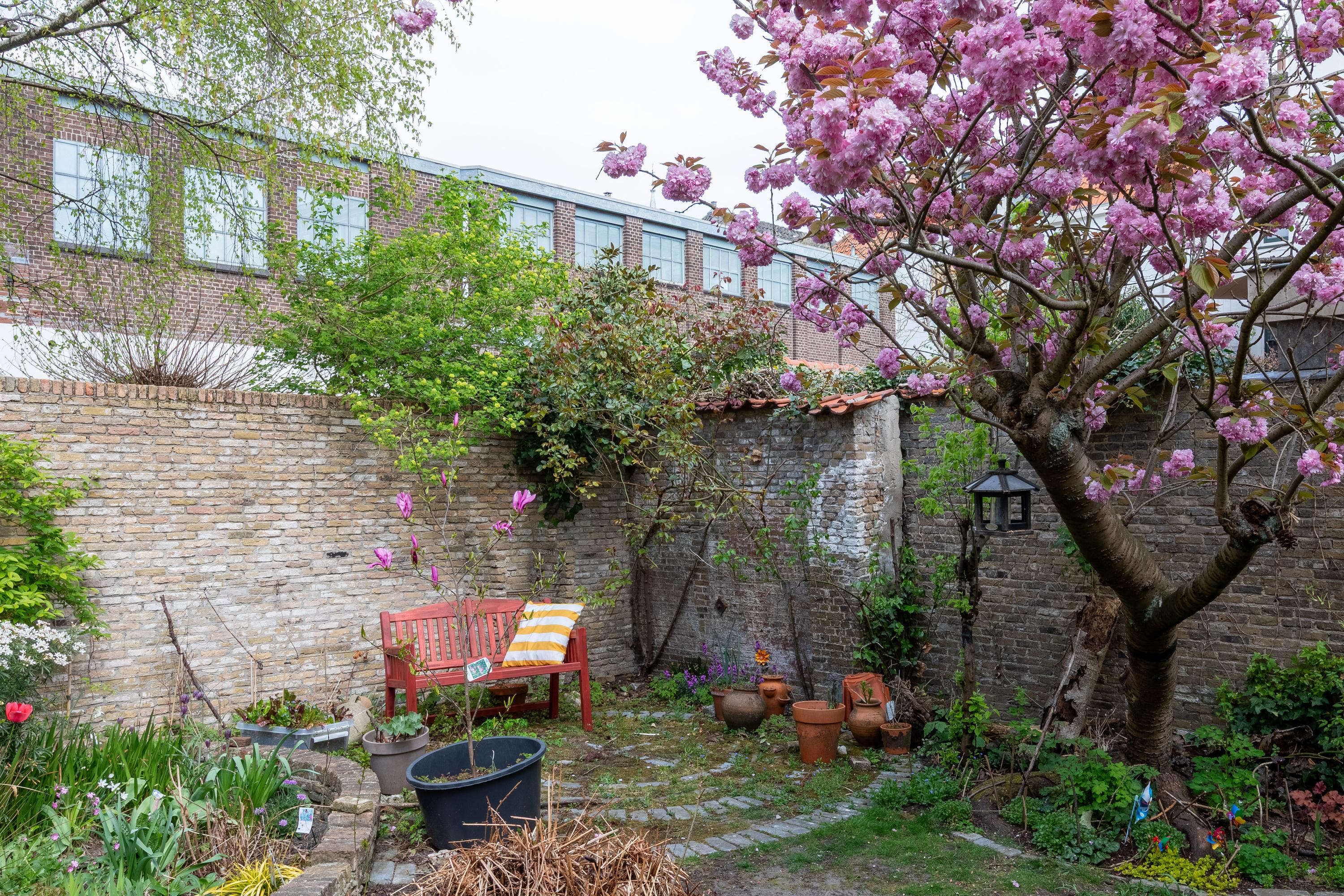 Vanuit de keuken en via openslaande deuren in de eetkamer is er toegang tot de extra brede en 12 meter diepe, ommuurde achtertuin. Tot in de avond is er altijd wel een plekje in de zon of de schaduw.