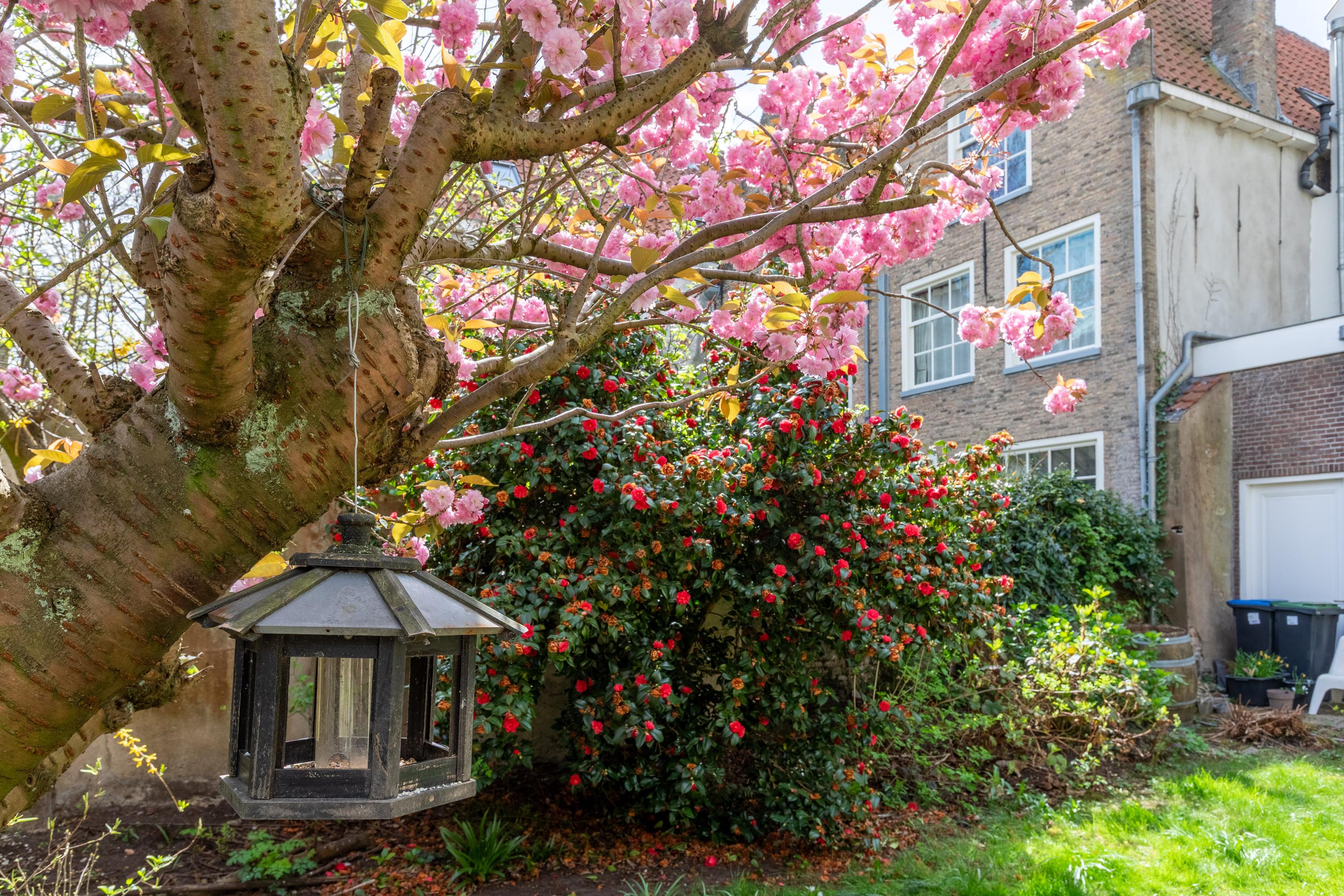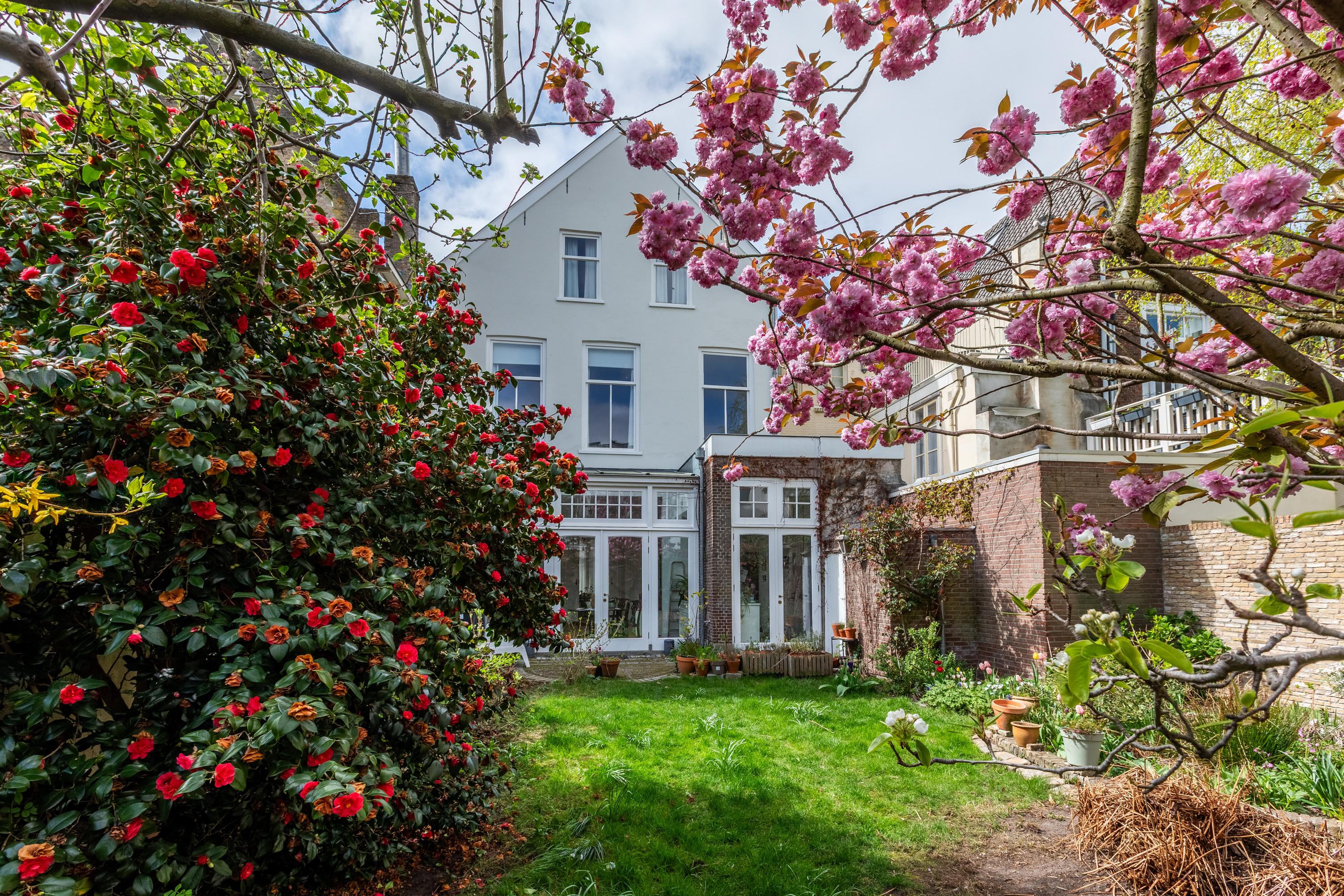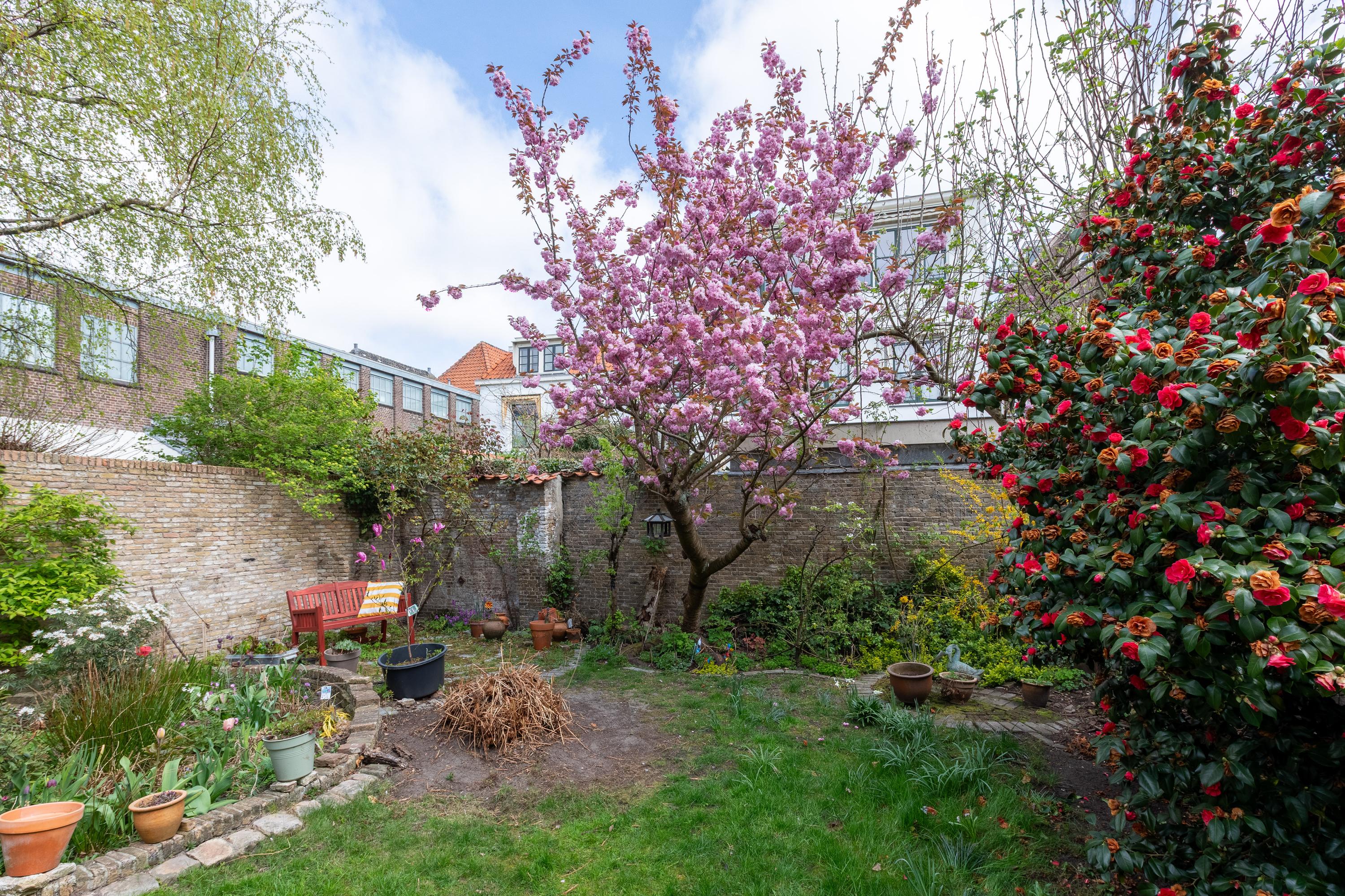 Vanuit de keuken en via openslaande deuren in de eetkamer is er toegang tot de extra brede en 12 meter diepe, ommuurde achtertuin. Tot in de avond is er altijd wel een plekje in de zon of de schaduw.
