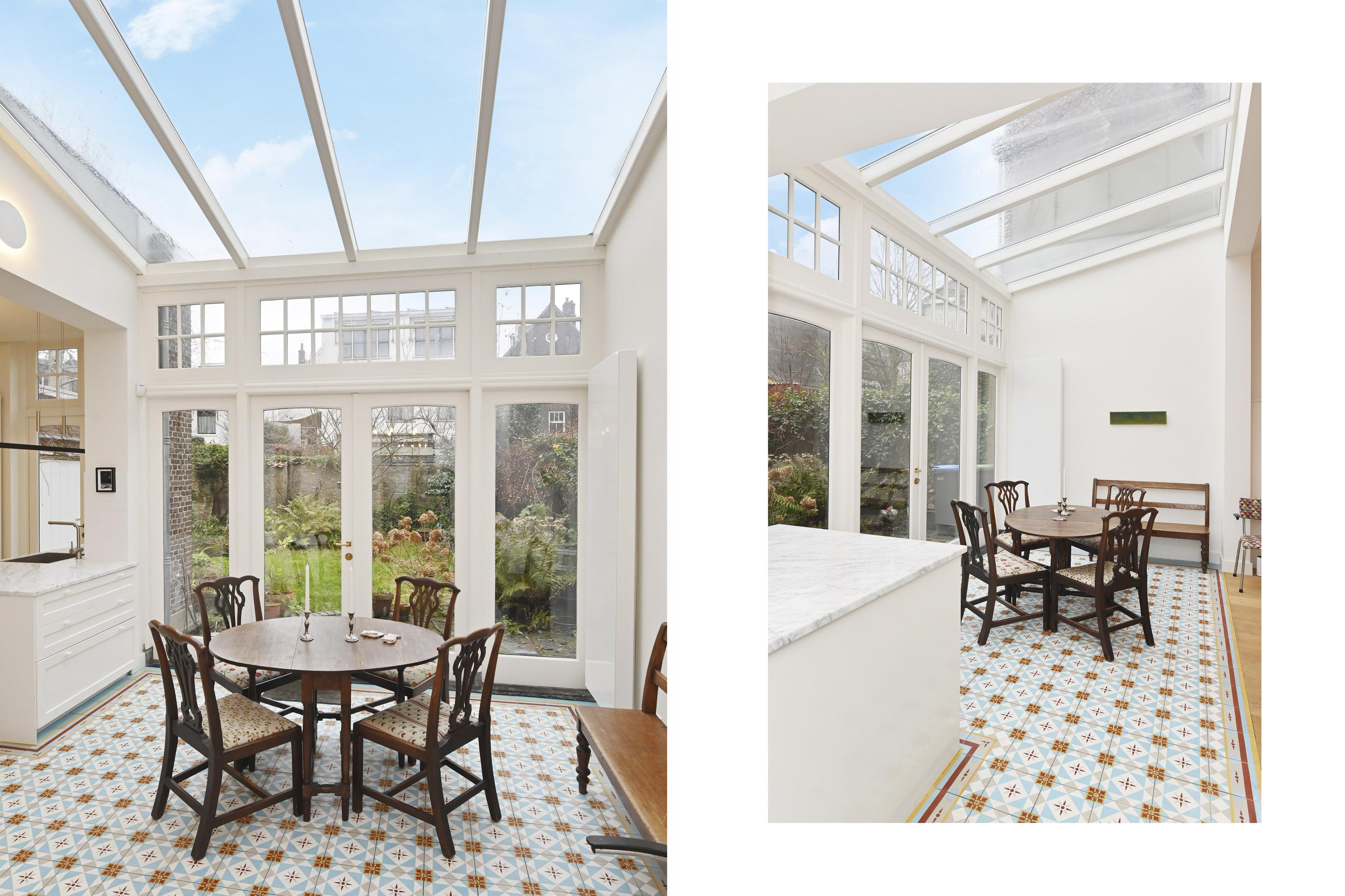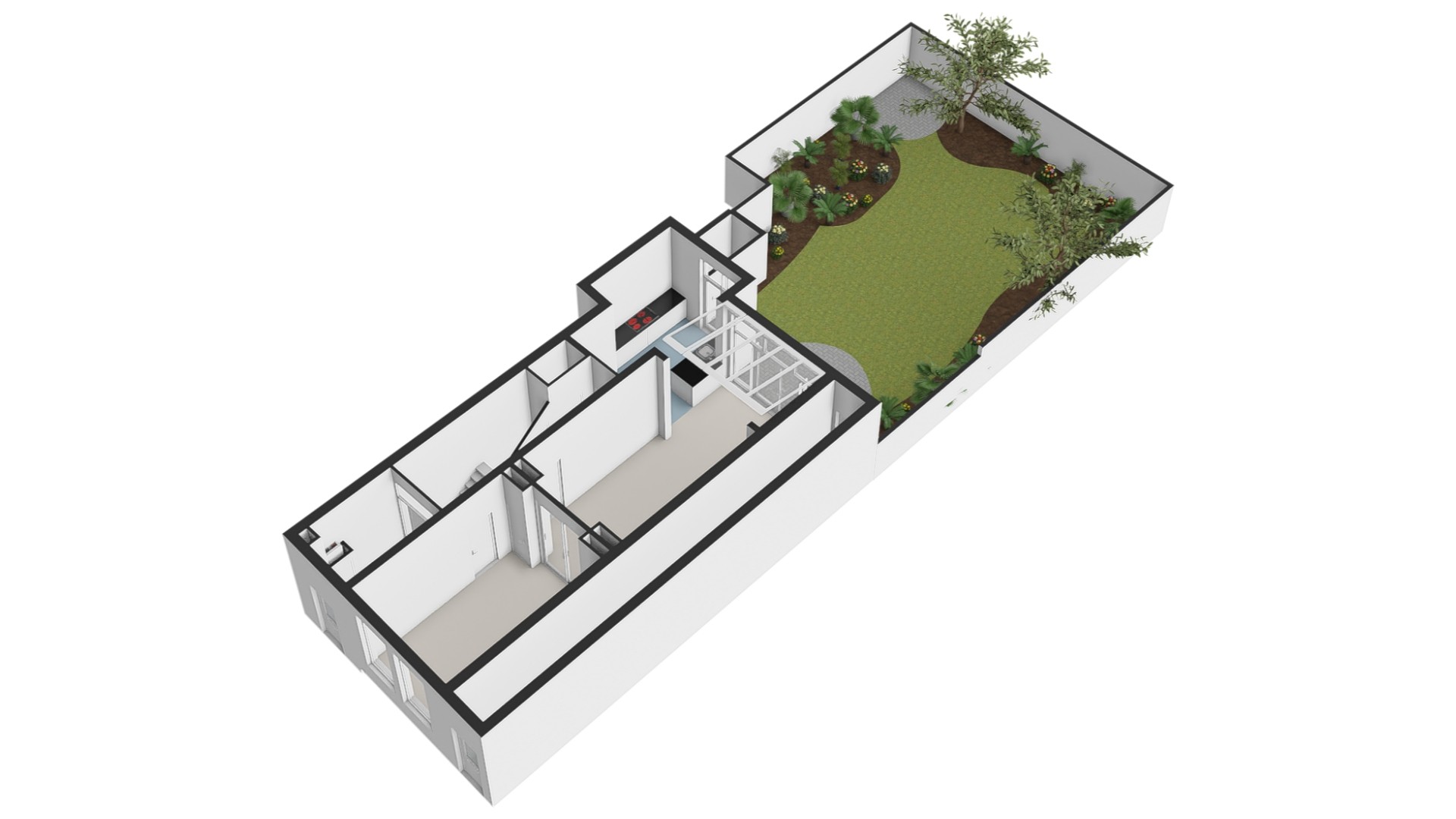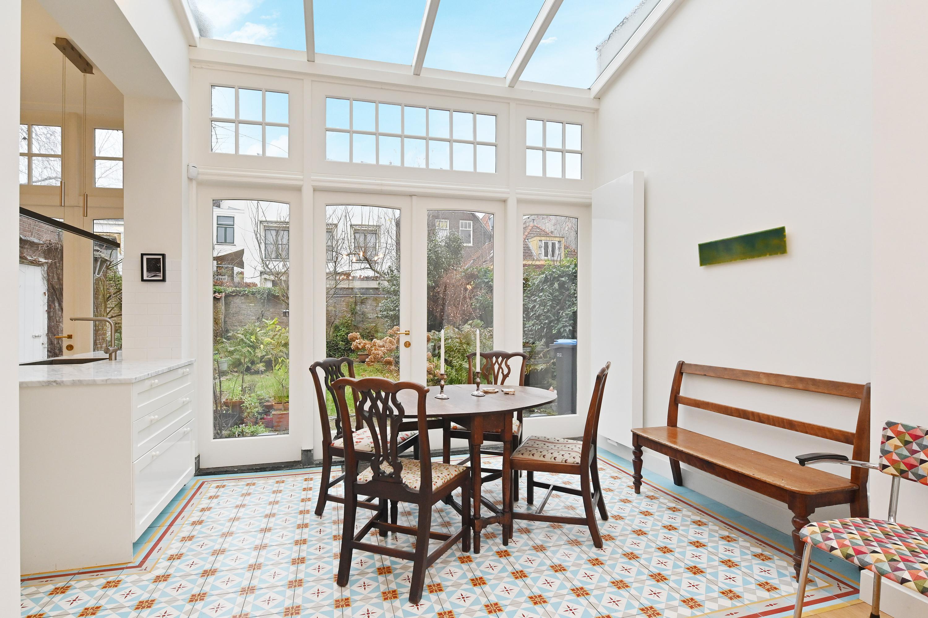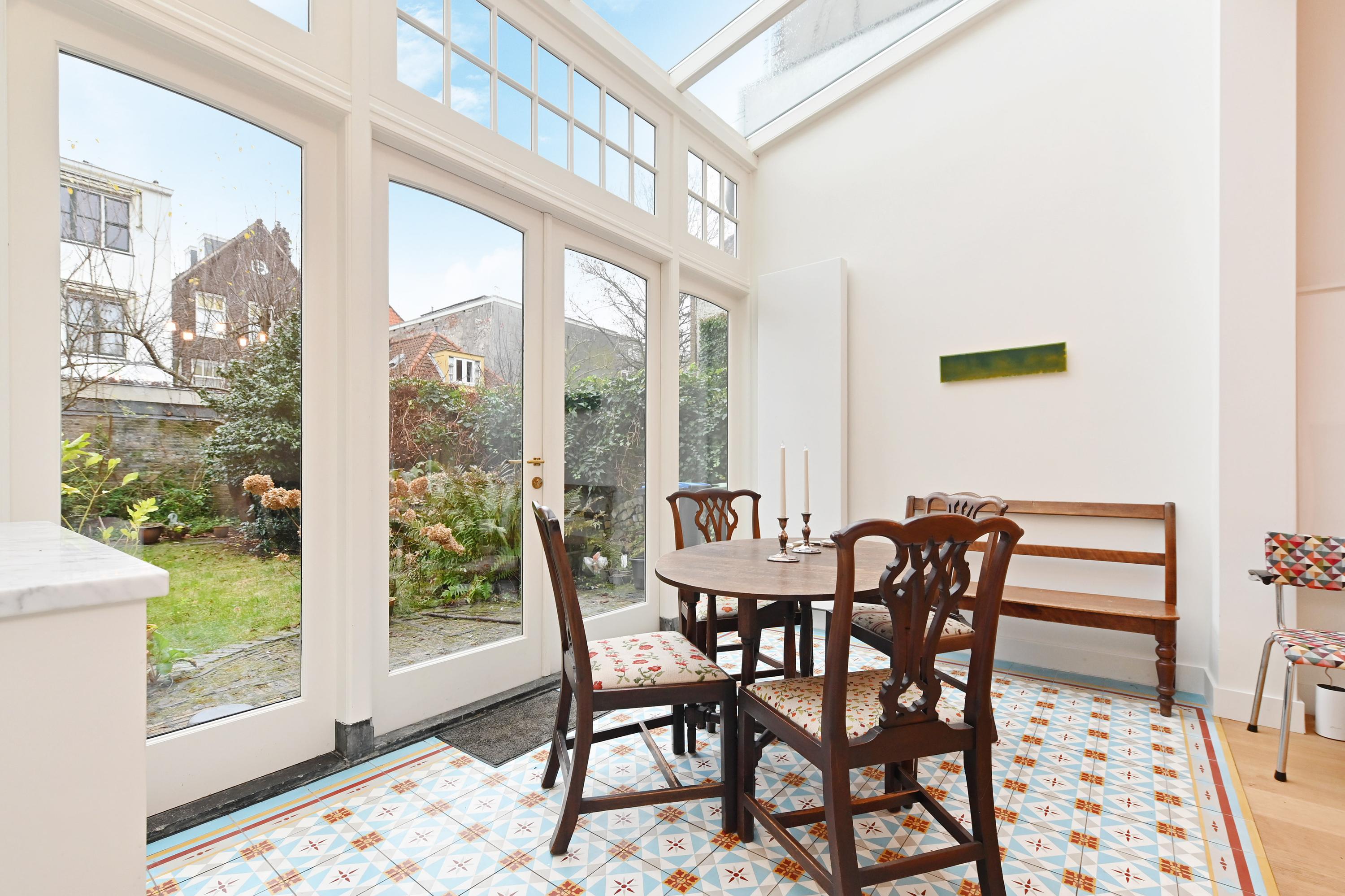 Vanuit de keuken en via openslaande deuren in de eetkamer is er toegang tot de extra brede en 12 meter diepe, ommuurde achtertuin. Tot in de avond is er altijd wel een plekje in de zon of de schaduw.