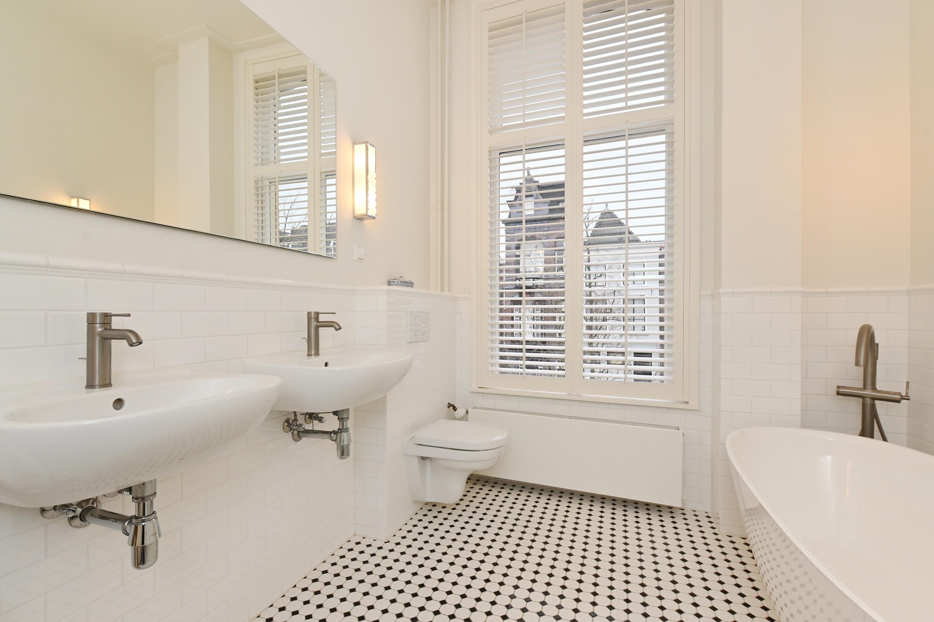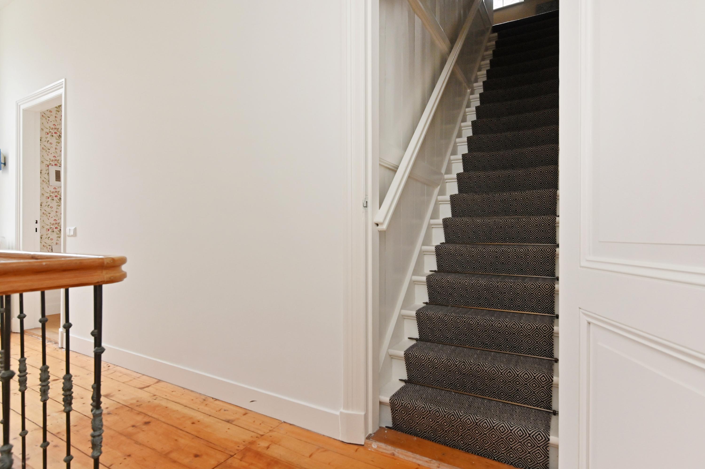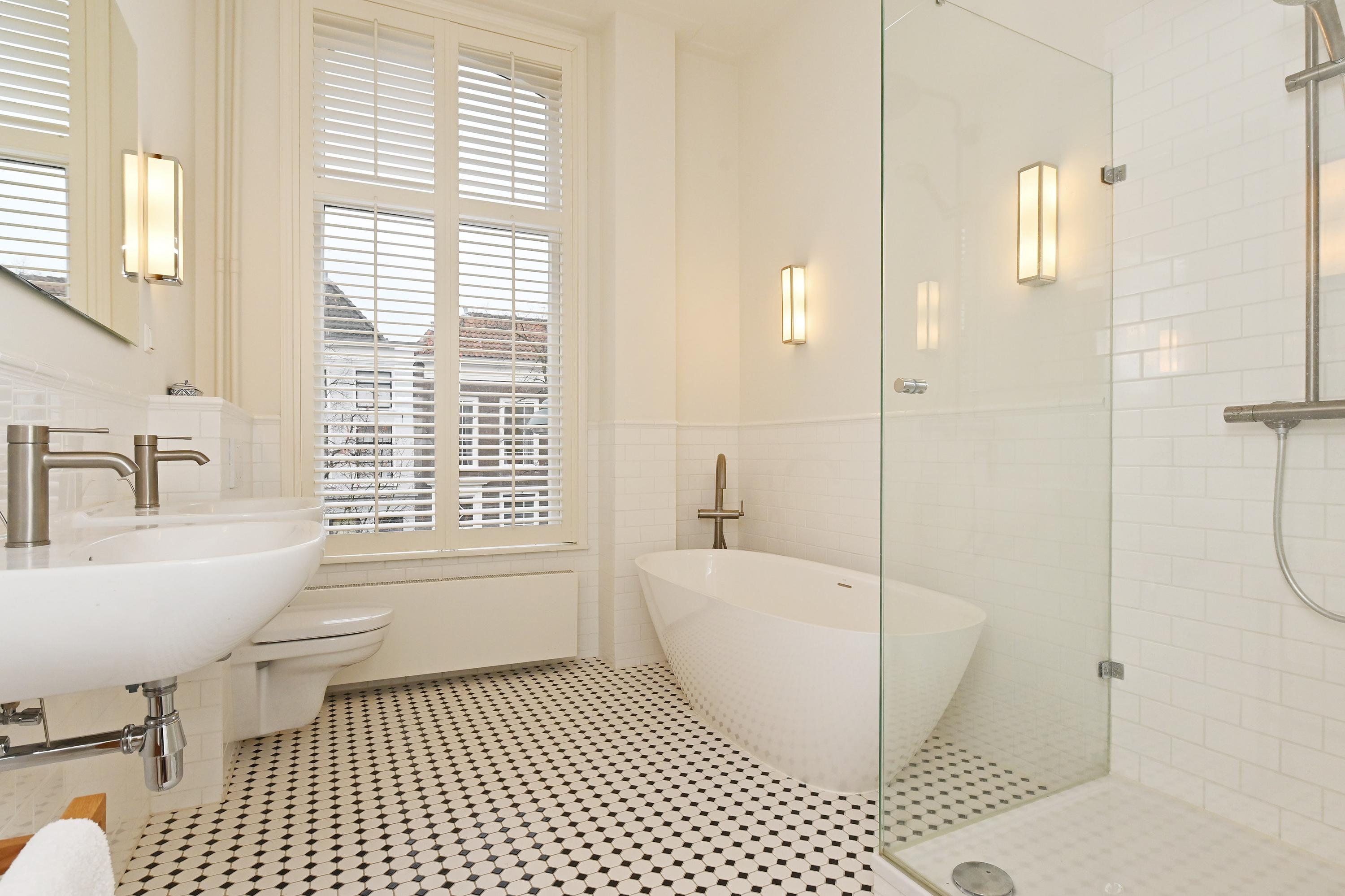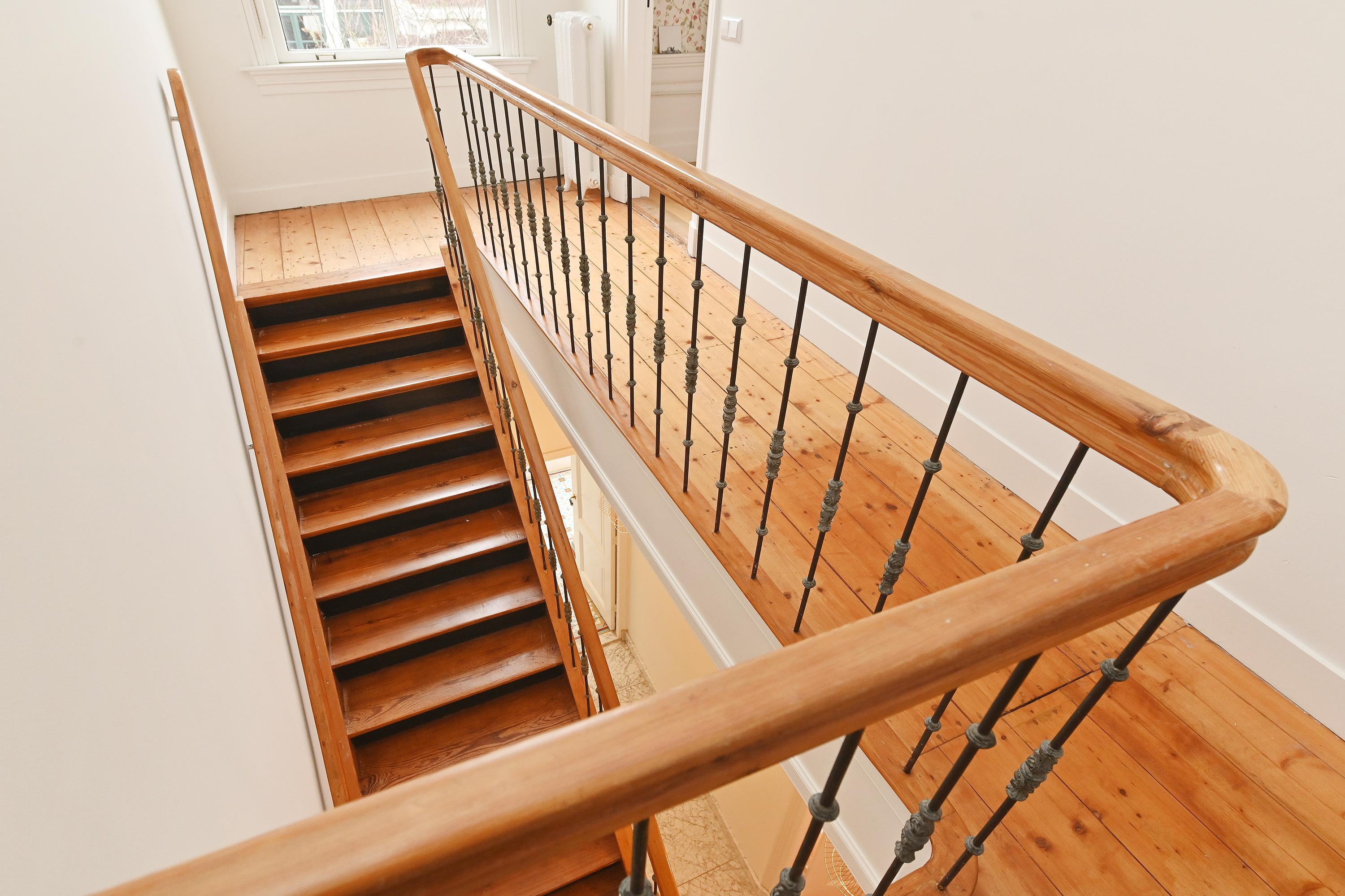 Aan de achterzijde bevindt zich een grote slaapkamer die ideaal is voor ouderslaapkamer. Op deze etage prachtige 3-meter hoge plafonds. Badkamer met douche, ligbad, dubbele wastafel en toilet.