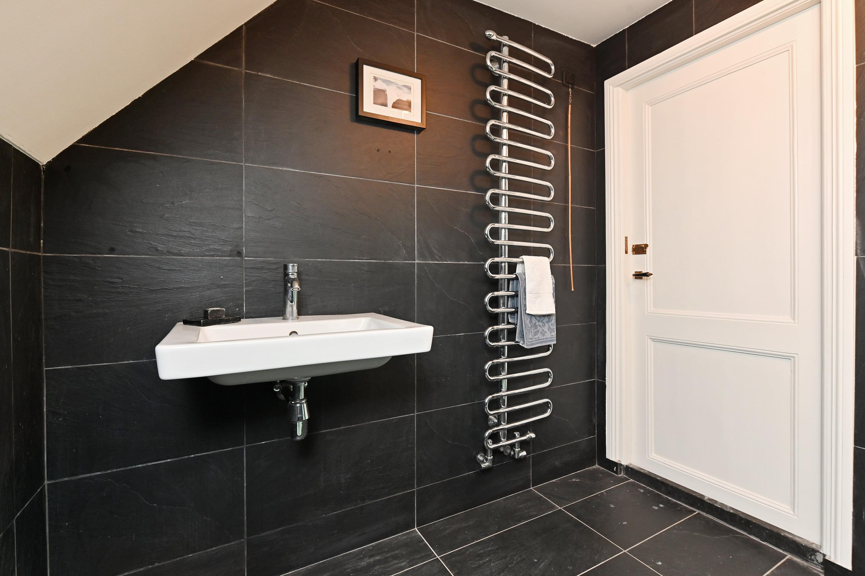 Trap naar de tweede volledige etage met twee slaapkamers aan de achterzijde, beide met een eigen wastafel en een grote open zolder met een hoogte van ruim 3 meter. Deze zolderkamer met zicht op de robuuste spanten is goed in te delen in bijvoorbeeld een slaapkamer en een waskamer. Hier zijn ook de aansluitingen voor de wasmachine en de droger en de opstelplaats van de CV-ketel plus boiler. Moderne toiletruimte. Moderne badkamer met royale inloopdouche, designradiator, design toiletkast en dakvenster.
