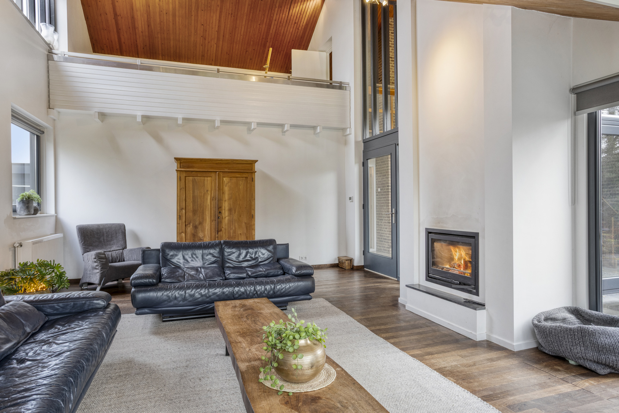 Via de hal kom je in de eetkamer, een lichte en uitnodigende ruimte dankzij de grote schuifpui. De eetkamer is voorzien van een houtkachel. Hier bevindt zich ook de trapopgang naar de eerste verdieping. Vanuit de eetkamer loop je door naar de woonkamer en de keuken. De woonkamer is ook voorzien van een sfeervolle houtkachel. De dichte keuken heeft een speels effect dank zij de bar aan het keukenblad. De keuken is uitgerust met diverse inbouwapparatuur, waaronder een 4-pits inductiekookplaat met afzuigkap, oven, koelkast, vaatwasser, stoomoven, warmhoudlade en een keukenboiler.