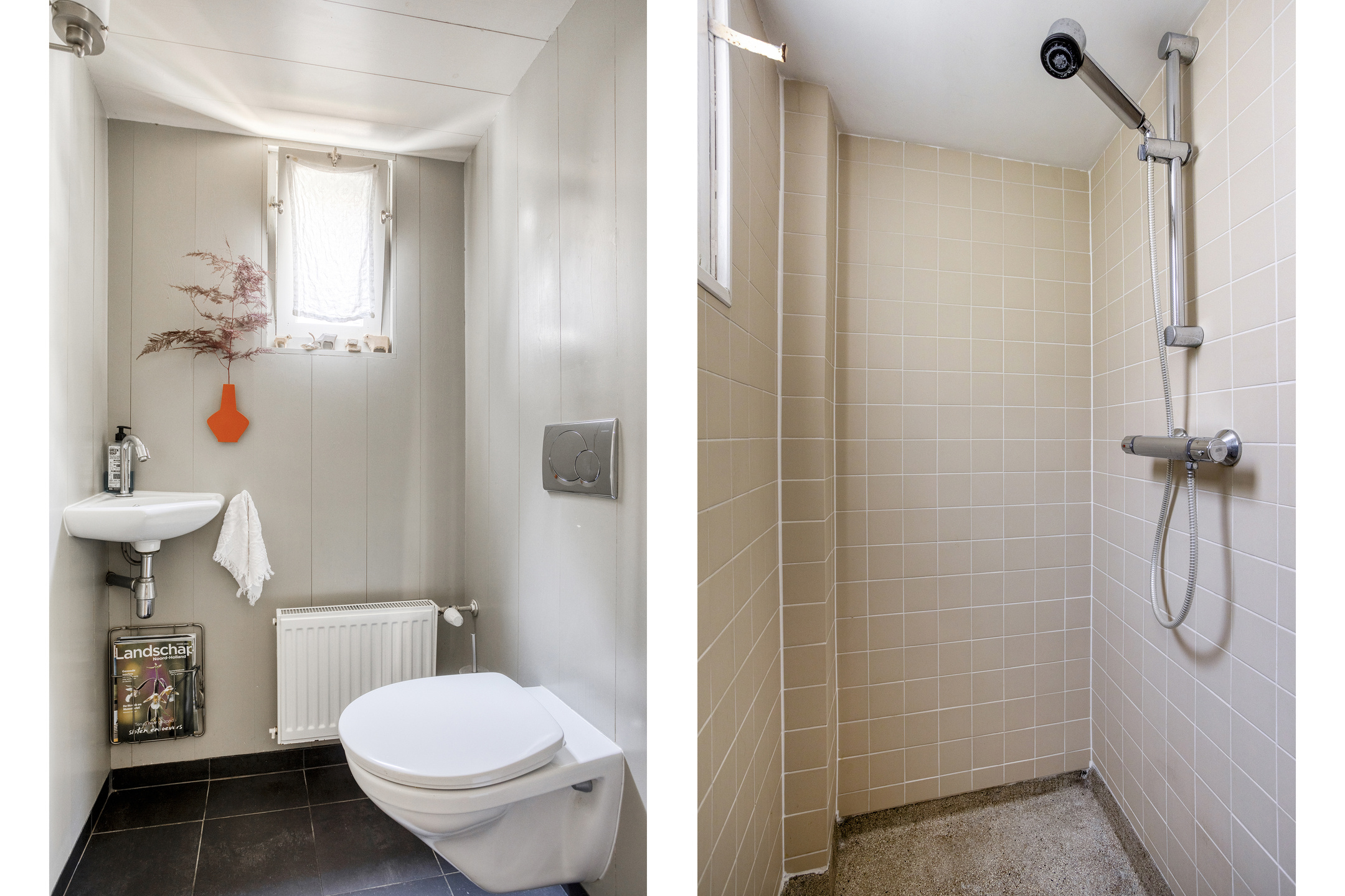 De overgang naar het achterhuis wordt gevormd door een ruime hal, die niet alleen een praktische verbindingsruimte is, maar ook beschikt over een douche en een toilet met fontein.