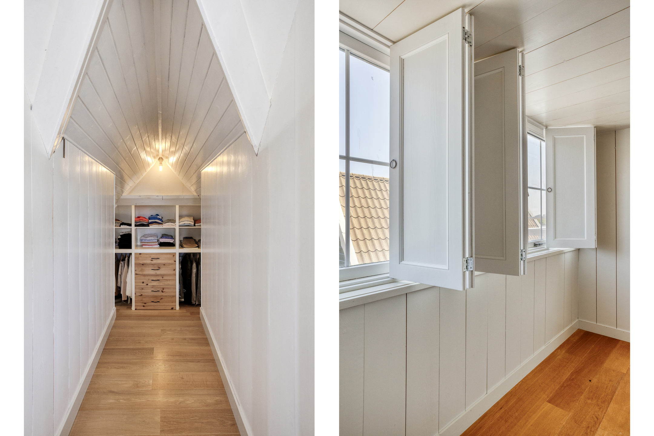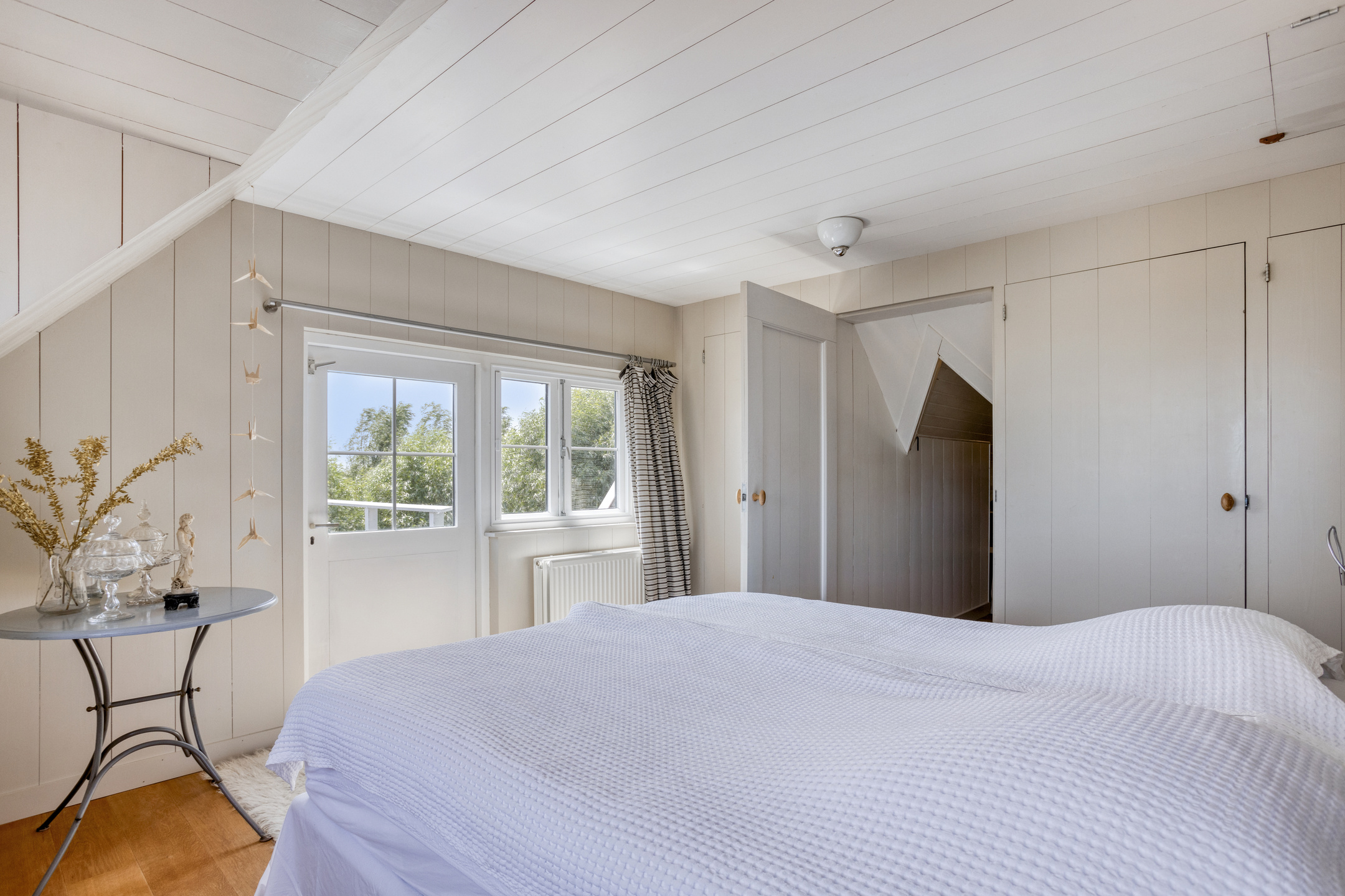 De eerste verdieping is verdeeld over het voorhuis en het achterhuis. In het voorhuis vind u twee ruime slaapkamers, elk voorzien van bergruimte achter de knieschotten. In het achterhuis leidt een brede trap naar een sfeervolle overloop, waar een charmante bedstee is ingebouwd, een unieke toevoeging dat kinderen zeker zal aanspreken. Vanuit hier bereikt u de royale master bedroom, voorzien van ingebouwde kastenwanden, een bergvliering en openslaande deuren naar een ruim dakterras met vrij uitzicht over het omringende landschap.
