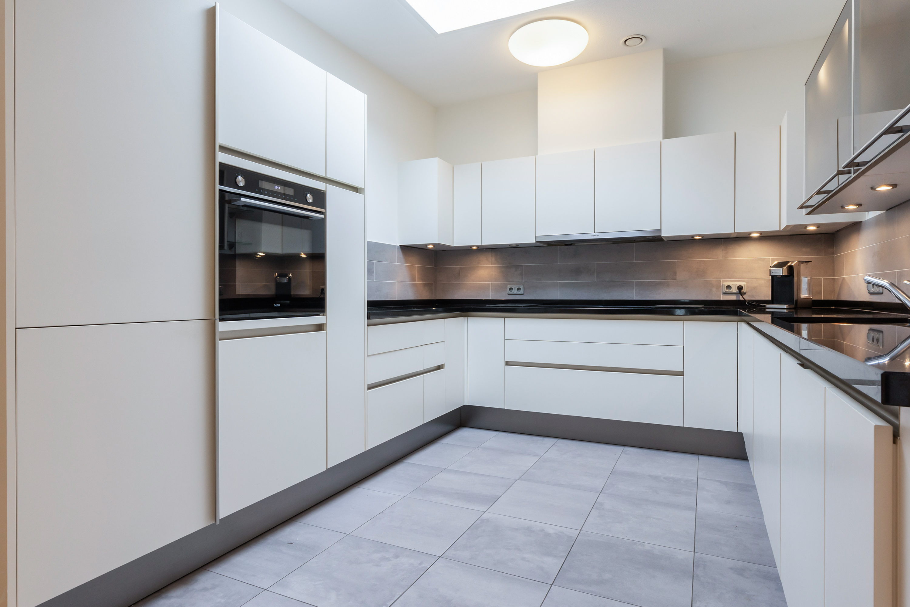 De open keuken is modern en greeploos uitgevoerd in hoogglans wit met een zwart granieten werkblad. De U-vormige opstelling biedt volop werkruimte en is voorzien van complete inbouwapparatuur: een koel-vriescombinatie, vaatwasser, combi-oven, keramische kookplaat en afzuigunit. De lichtkoepel in het plafond zorgt voor extra daglicht.