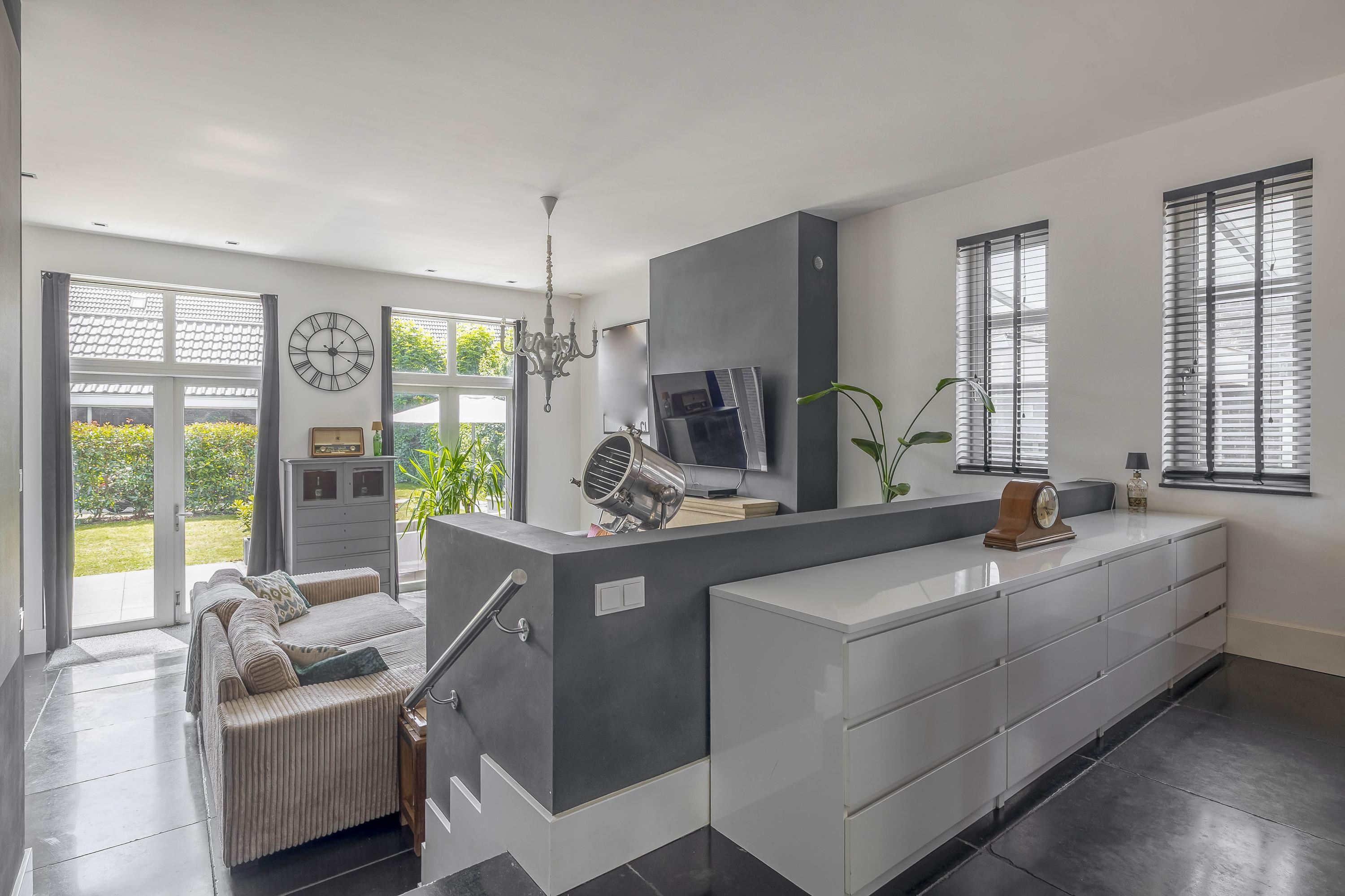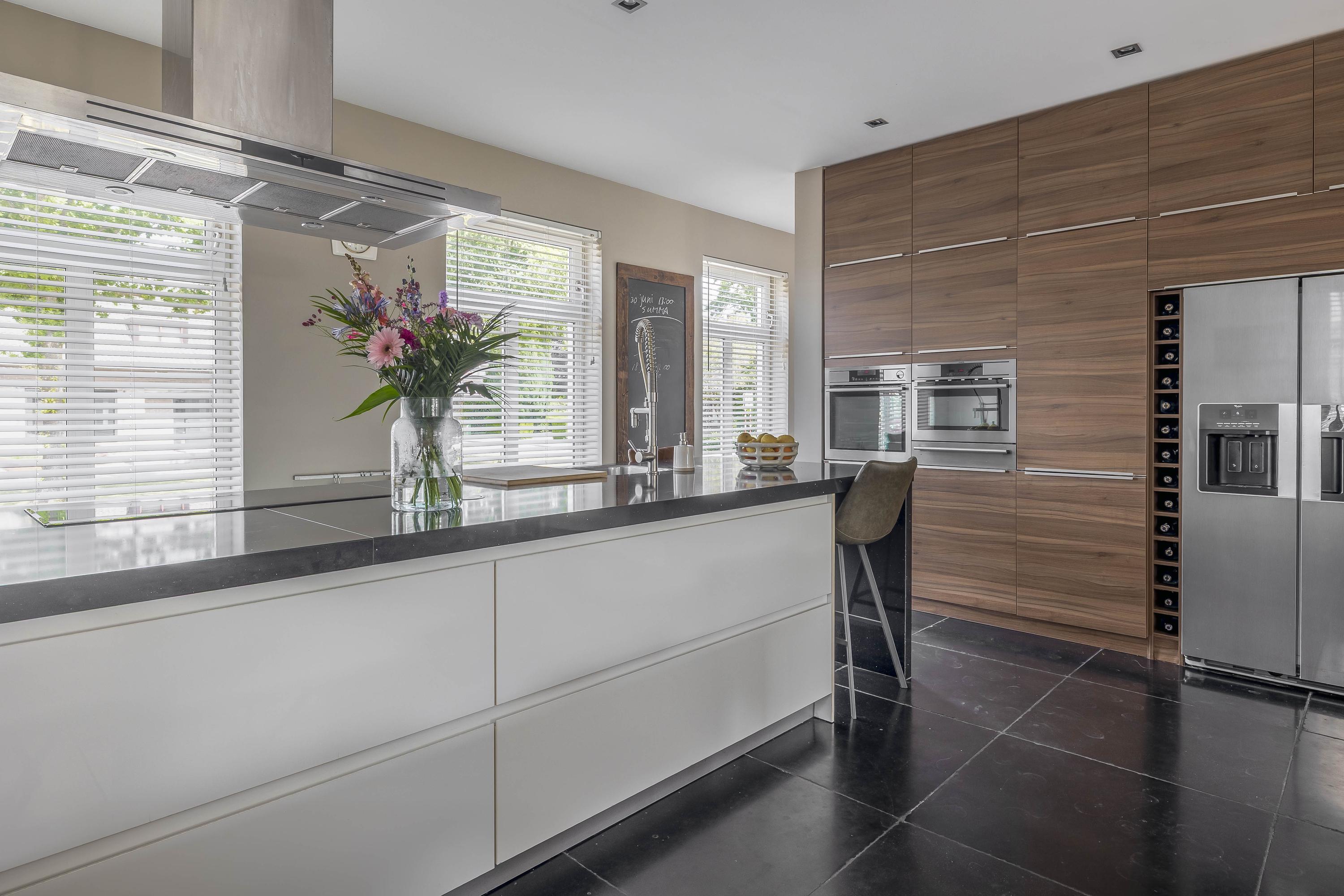 Via de ruime entree met fraaie tegelvloer, modern toilet en uitgebreide meterkast, kom je binnen in de leefkeuken aan de voorzijde van de woning. Deze stijlvolle en complete keuken is het hart van het huis en beschikt over een kookeiland, luxe apparatuur en veel werkruimte. Dankzij het verhoogde vloerniveau heb je een prachtig uitzicht over de straat.