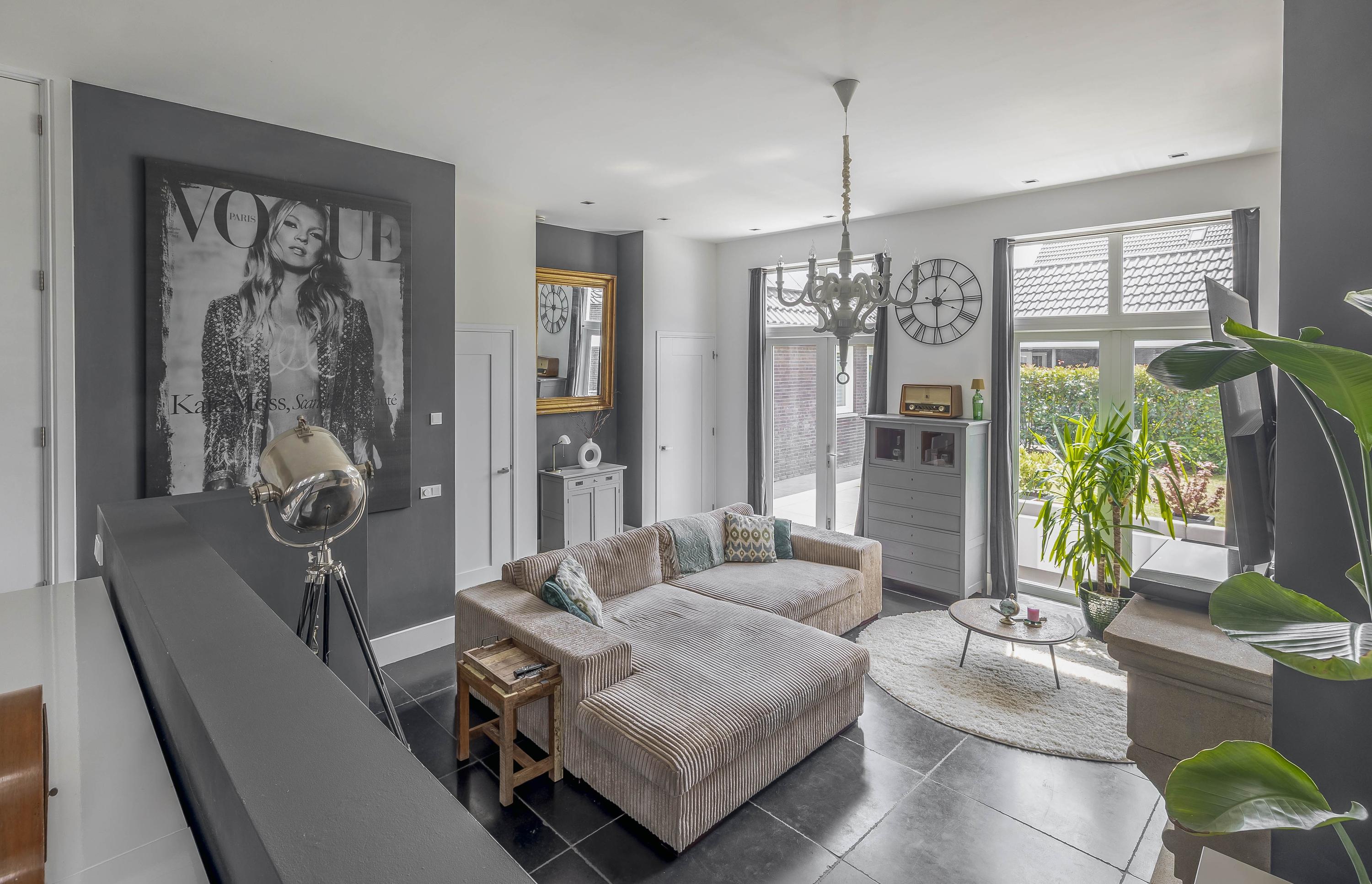 Een korte trap leidt naar de sfeervolle, royale woonkamer met indrukwekkende plafondhoogte van 3,5 meter. Grote ramen en dubbele tuindeuren zorgen hier voor een zee aan licht en directe verbinding met de tuin. Een zandstenen schouw met sierhaard maakt het plaatje compleet. Grenzend aan de woonkamer vind je een praktische speel- of werkkamer met ingebouwde kastenwand – ideaal voor kinderen of als thuiskantoor.