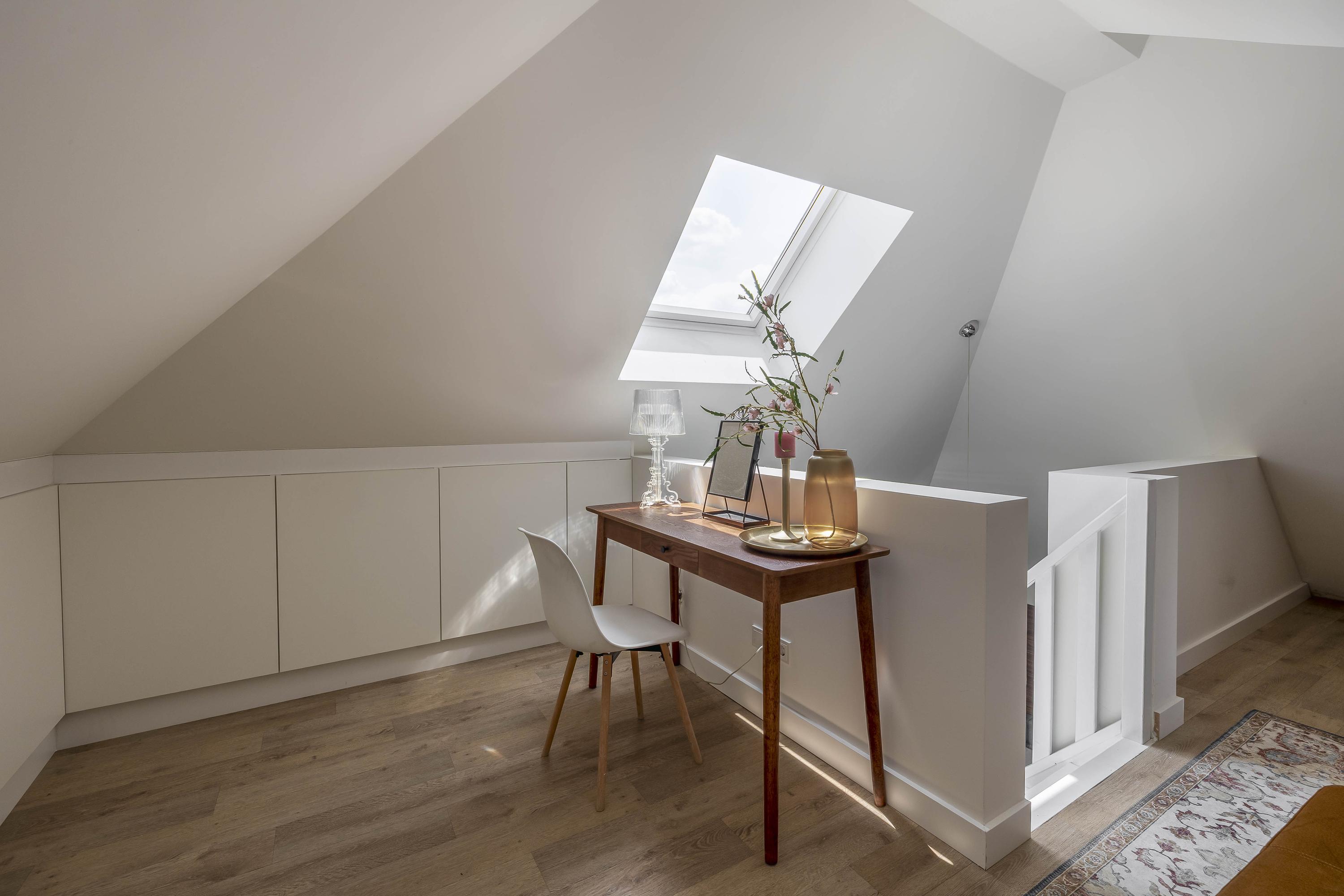 De zolderverdieping is zowel bereikbaar vanaf de overloop als vanuit de masterbedroom. De verdieping is voorzien van een vinylvloer, drie Velux dakvensters en bestaat uit twee ruime, multifunctionele gedeeltes met volop bergruimte onder de schuinte van het dak. Ideaal als kleedkamer, werk- of hobbyruimte.