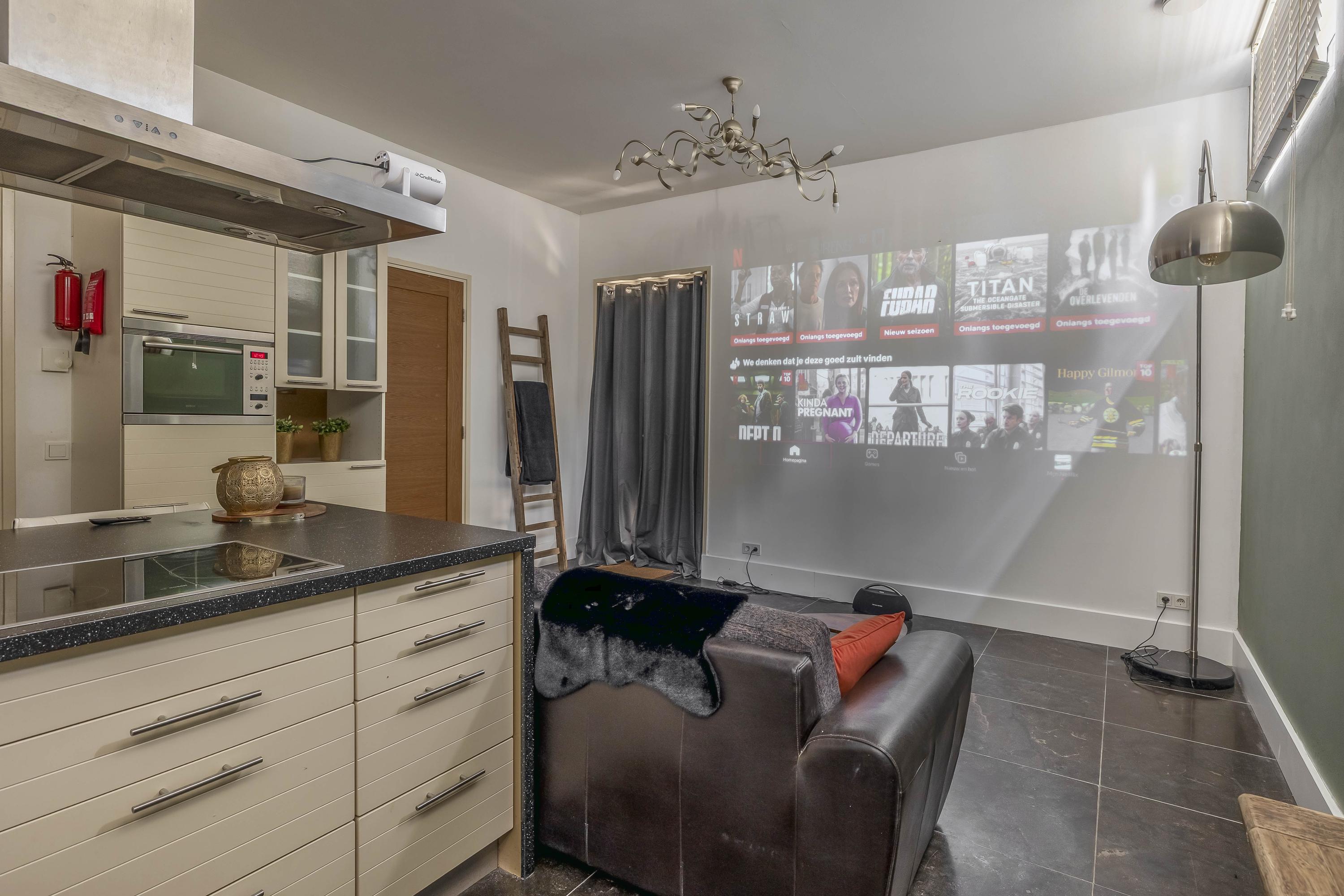 Je betreedt deze ruimte in een lichte woonkamer met open keuken, waar de indrukwekkende plafondhoogte van ruim 3 meter direct opvalt. De keuken is modern en compleet uitgerust met een inductiekookplaat, afzuigkap, vaatwasser, koelkast en combi-magnetron. In een handige nis achter de keuken bevindt zich de aansluiting voor de wasmachine.