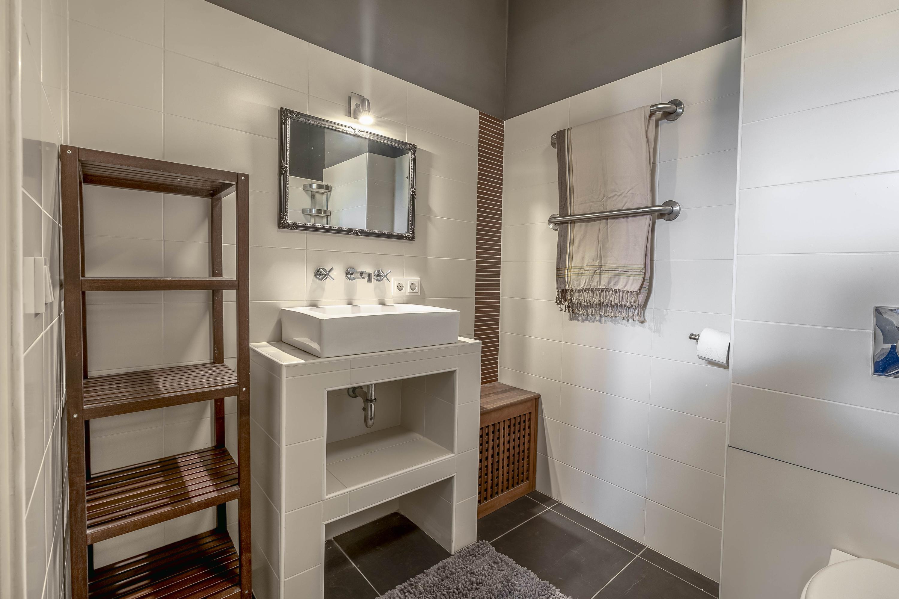 De gedeeltelijk betegelde badkamer is voorzien van een inloopdouche, wandcloset en een wastafelplateau met waskom.