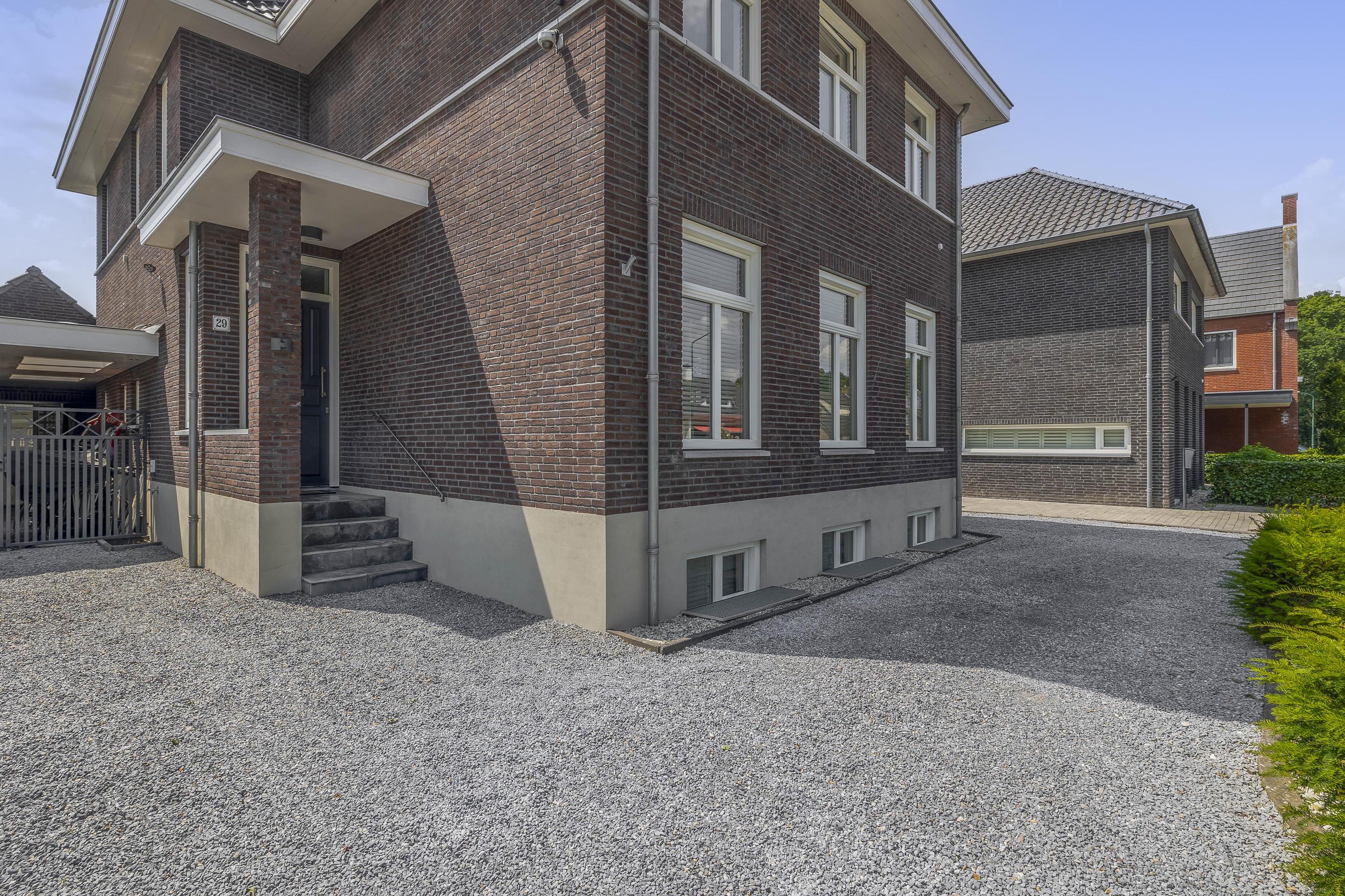 De onderhoudsvriendelijke voortuin is fraai aangelegd met siergrind en biedt toegang tot twee opritten aan weerszijden van de woning. De oprit aan de rechterzijde is voorzien van een aluminium overkapping, waaronder zich de trap naar het appartement in het souterrain bevindt. Aan de linkerzijde vindt je een tweede oprit met carport, uitgerust met drie lichtkoepels en afsluitbaar met een dubbele sierpoort.