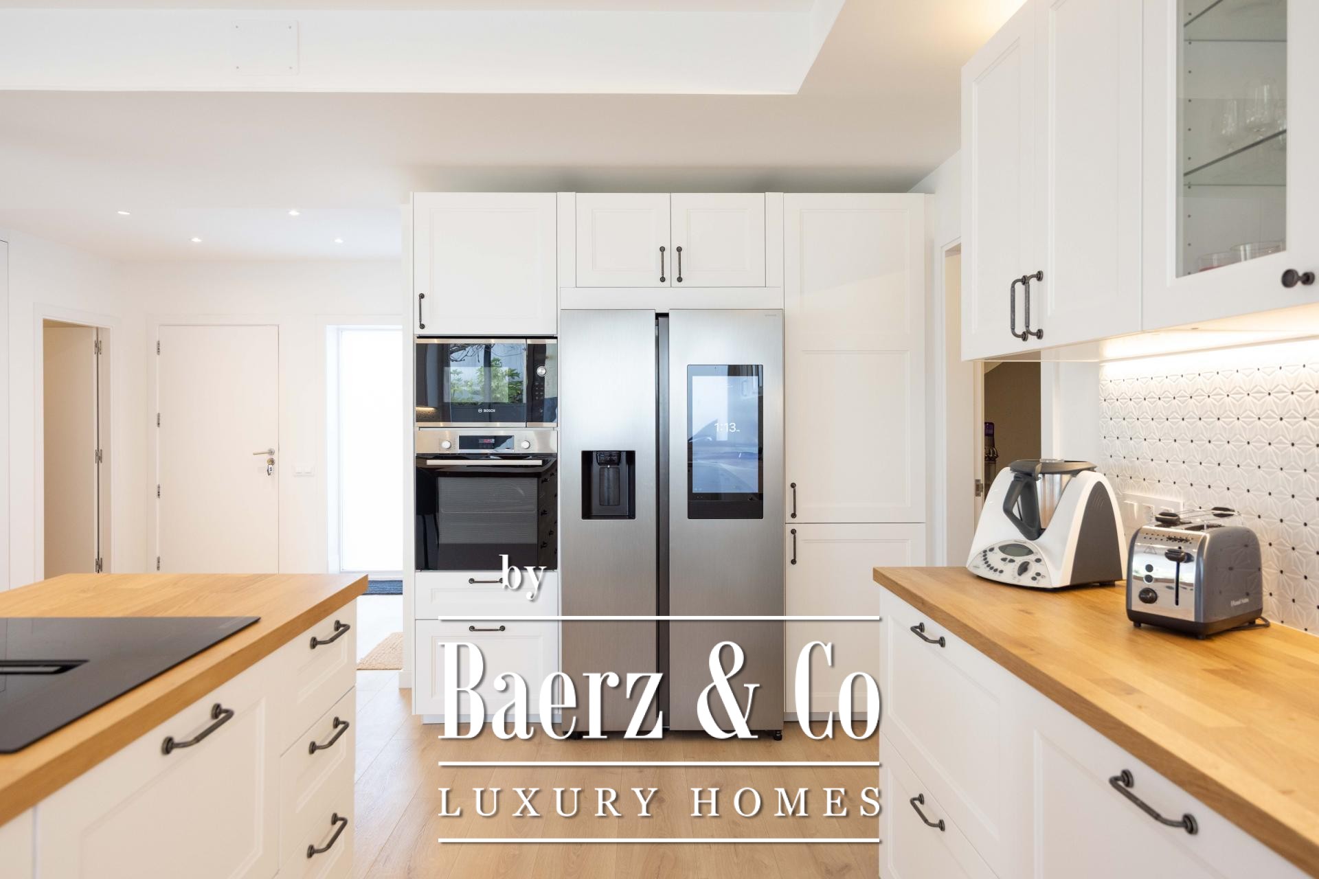 De open verbinding tussen de woonkamer en op maat gemaakte leefkeuken, uitgerust met Bosch apparatuur en een Amerikaanse koelkast, creëert moeiteloos ruimte voor zowel intiem gezinsleven als elegant entertainen. Een sfeervolle houtkachel vormt het middelpunt, terwijl het interieur verfijnde luxe uitstraalt met aandacht voor functionaliteit.