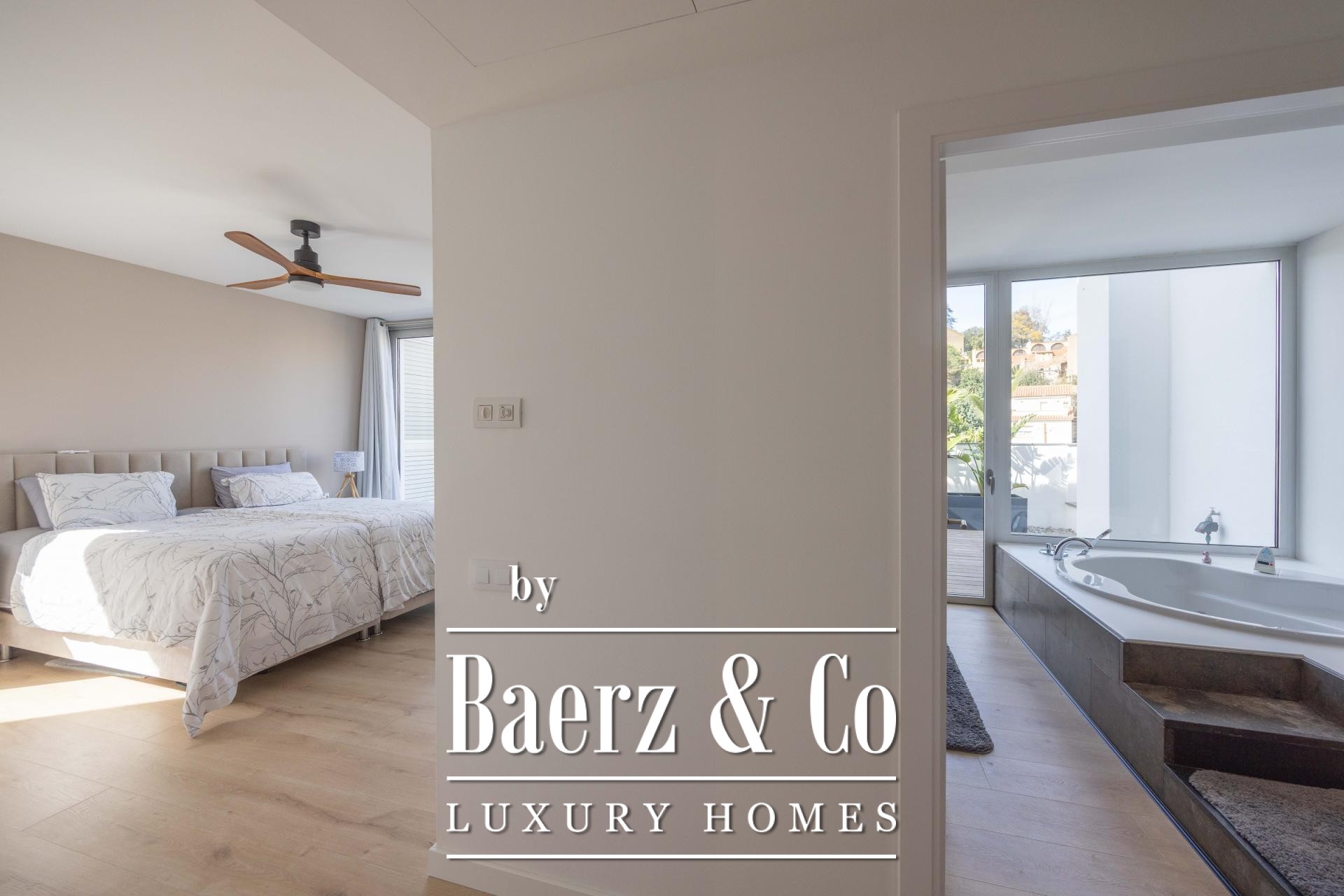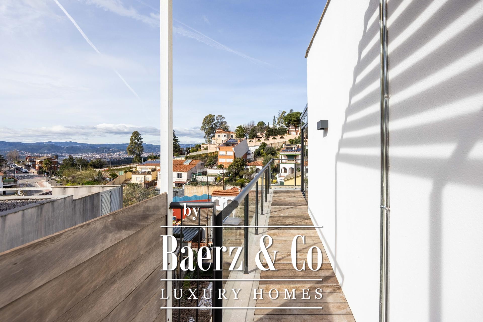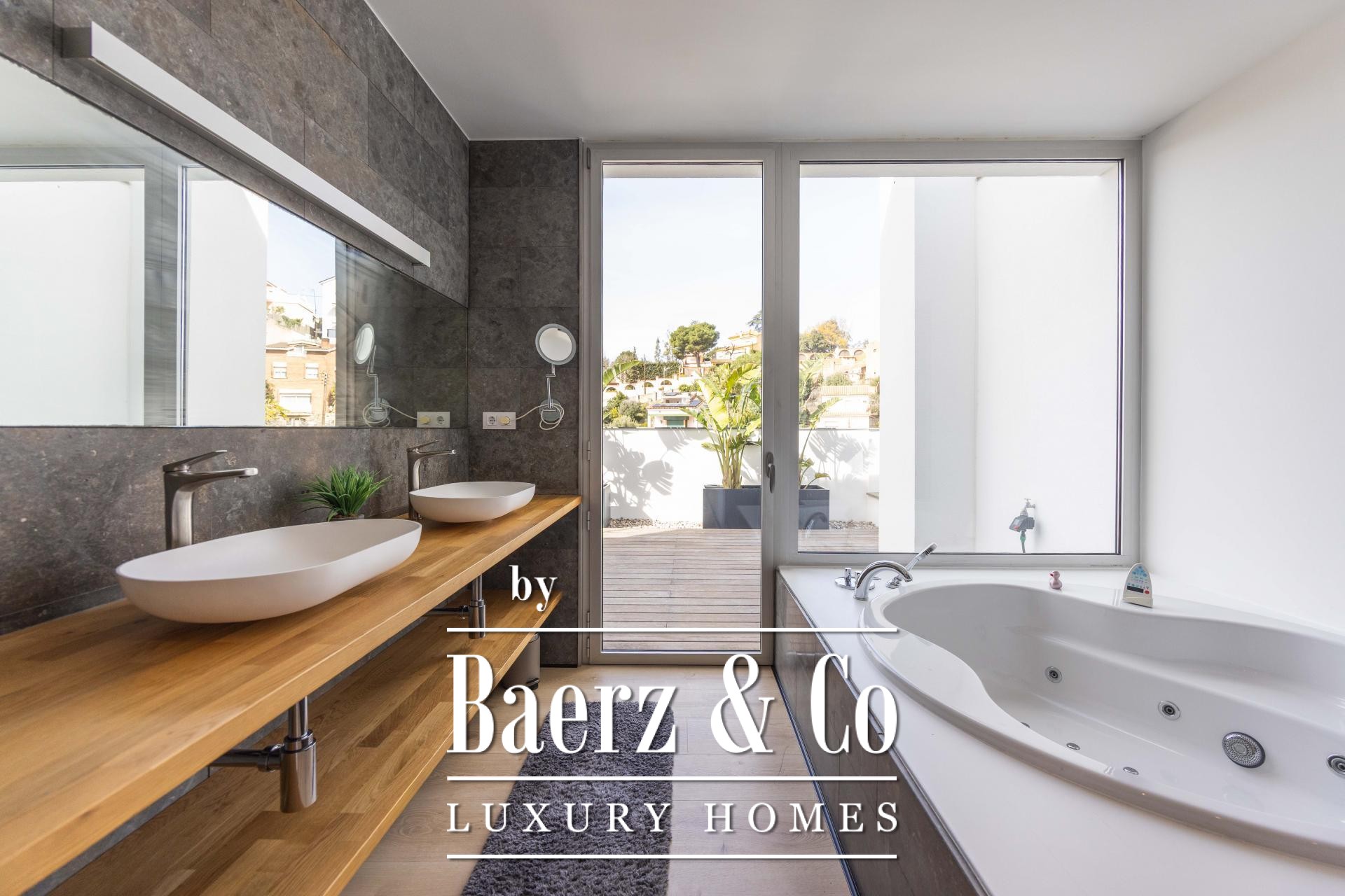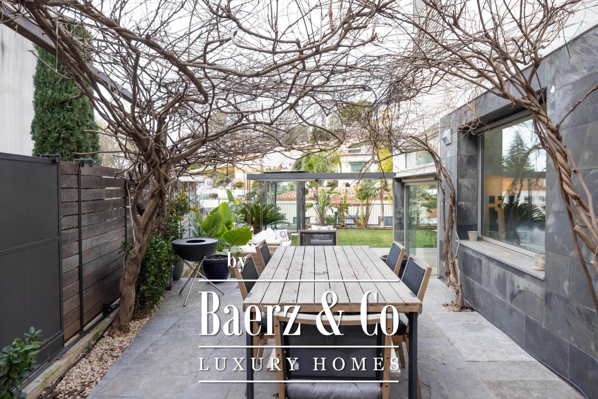 De ervaring wordt buiten voortgezet op vier aangelegde terrassen, omringd door palmen, bananenbomen, verzorgd gazon, een schaduwrijke pergola en een buitenkeuken voor de zomer. Het zwembad van 7x5 m en het houten zonneterras nodigen uit tot ontspanning en privacy. De master suite kenmerkt zich door een inloopkast, privéterras en hydromassagebad, terwijl twee slaapkamers toegang bieden tot een beschutte buitenruimte. Een lift verbindt de niveaus en biedt ultiem comfort en moeiteloze toegankelijkheid in de woning. De verfijnde ligging in Esplugues de Llobregat garandeert discretie en directe toegang tot het hart van Barcelona.