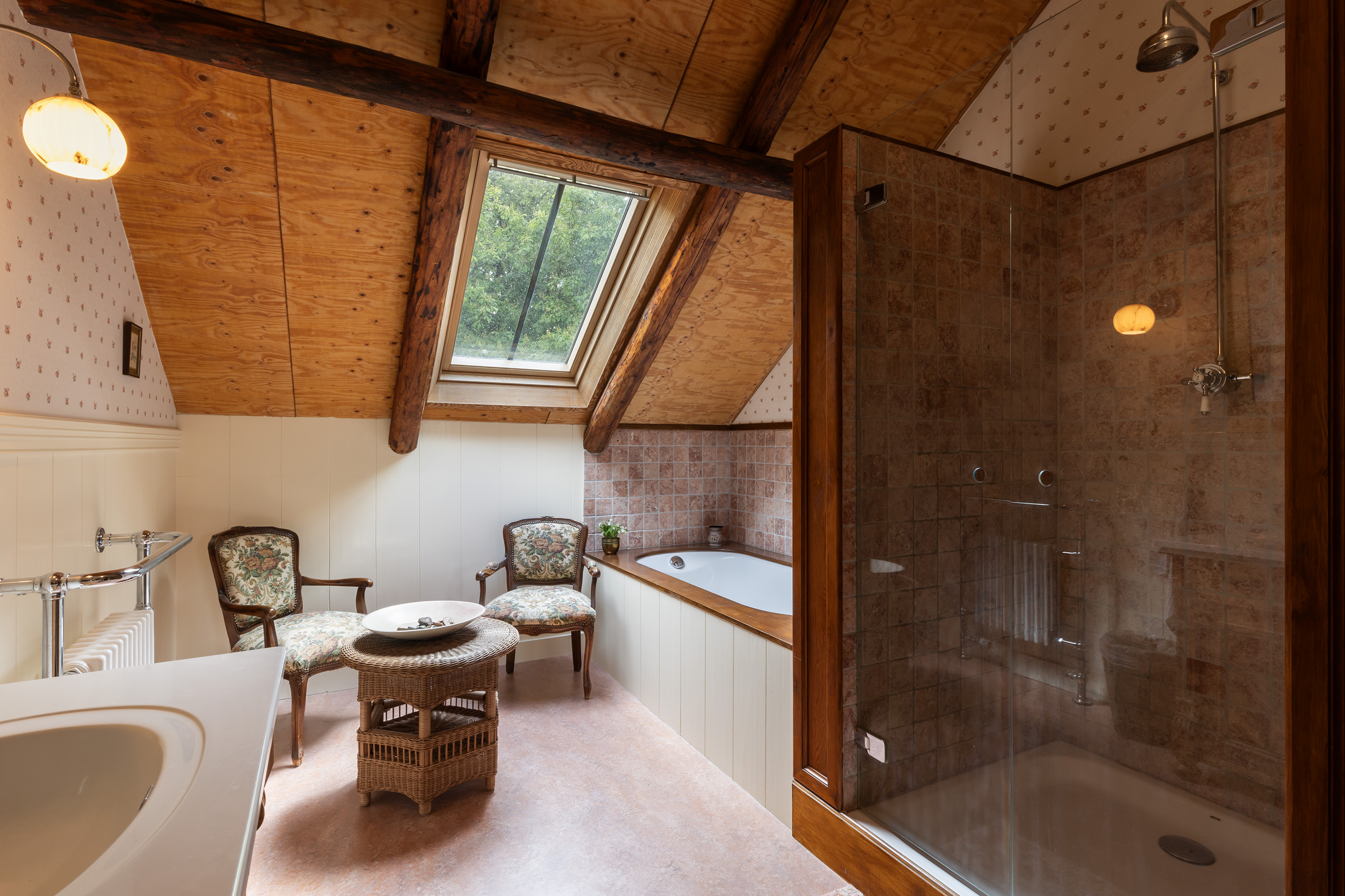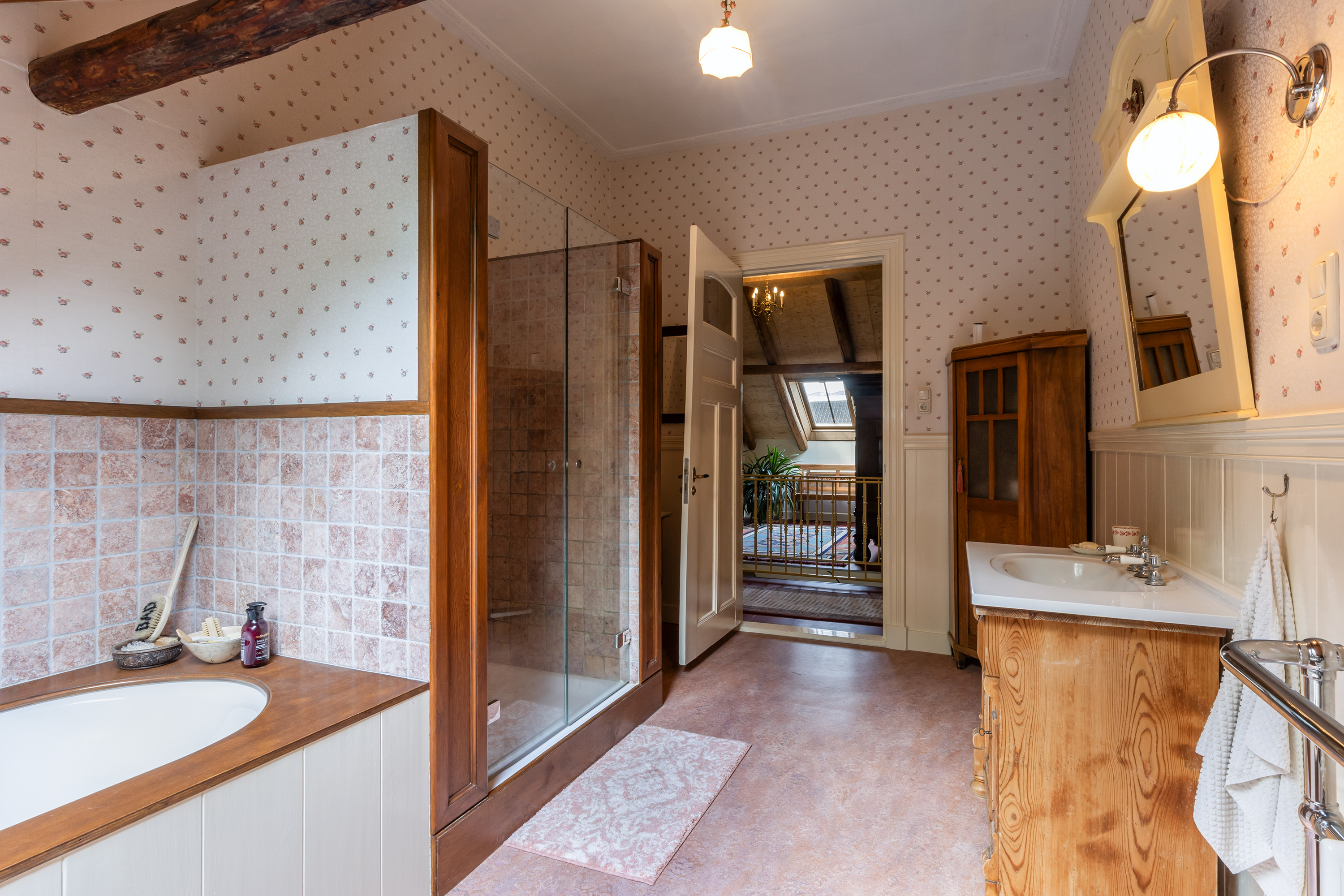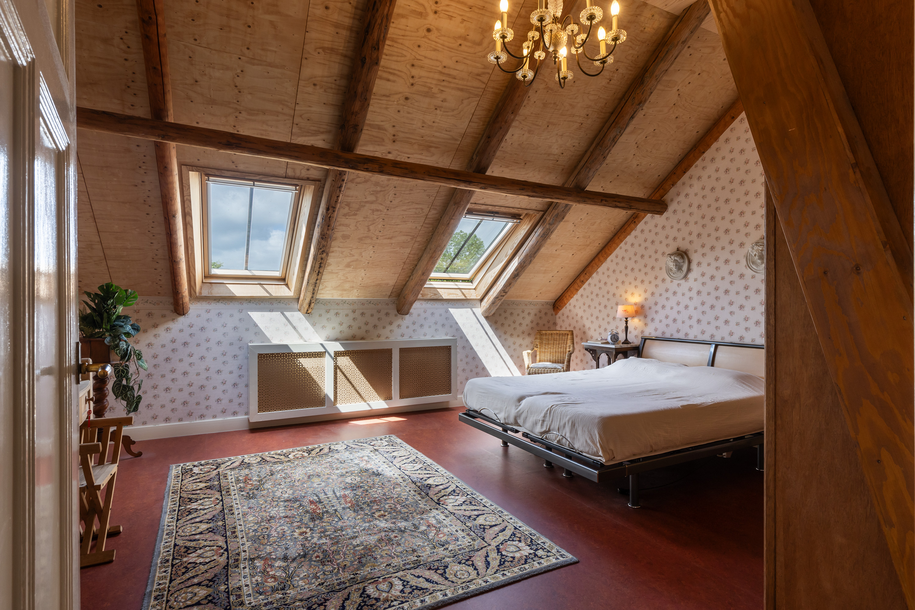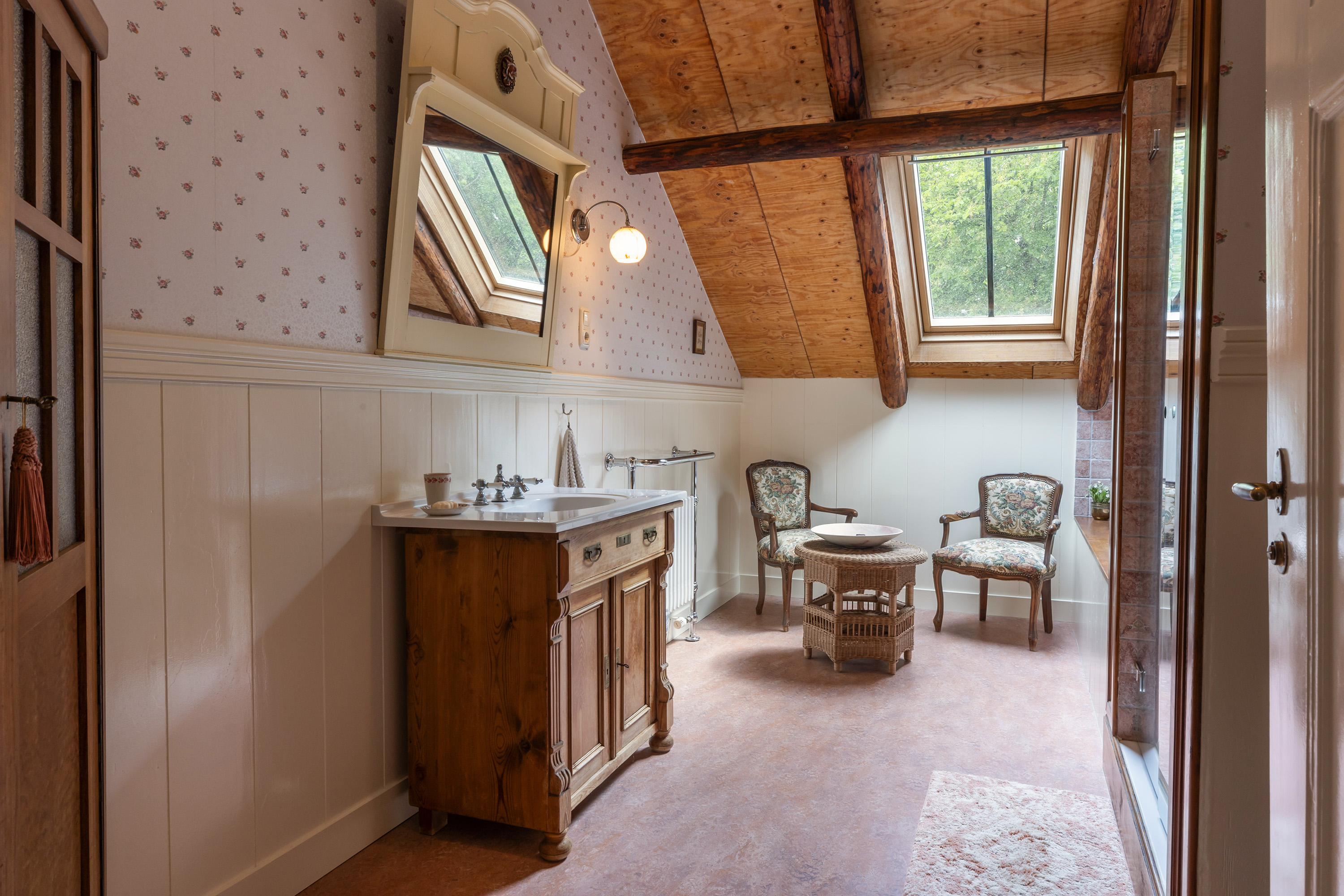 De bovenverdieping is bij de verbouwing volledig aangepakt: oude ondervloeren zijn verwijderd en opnieuw aangebracht, waardoor een grote zolderruimte ontstond. Hier bevinden zich nu een sfeervolle kantoor-/zitkamer, twee slaapkamers, een moderne badkamer en een separaat toilet. De badkamer is royaal en stijlvol afgewerkt met een ligbad onder het dakraam, een ruime inloopdouche en een wastafelmeubel. De combinatie van hout met natuurstenen wandtegels geeft deze ruimte een serene, luxueuze sfeer. Verder is er een separaat toilet aanwezig. De verdieping is recent voorzien van 5 velux dakramen met dubbel glas en wordt verwarmd door de hybride warmtepompinstallatie.