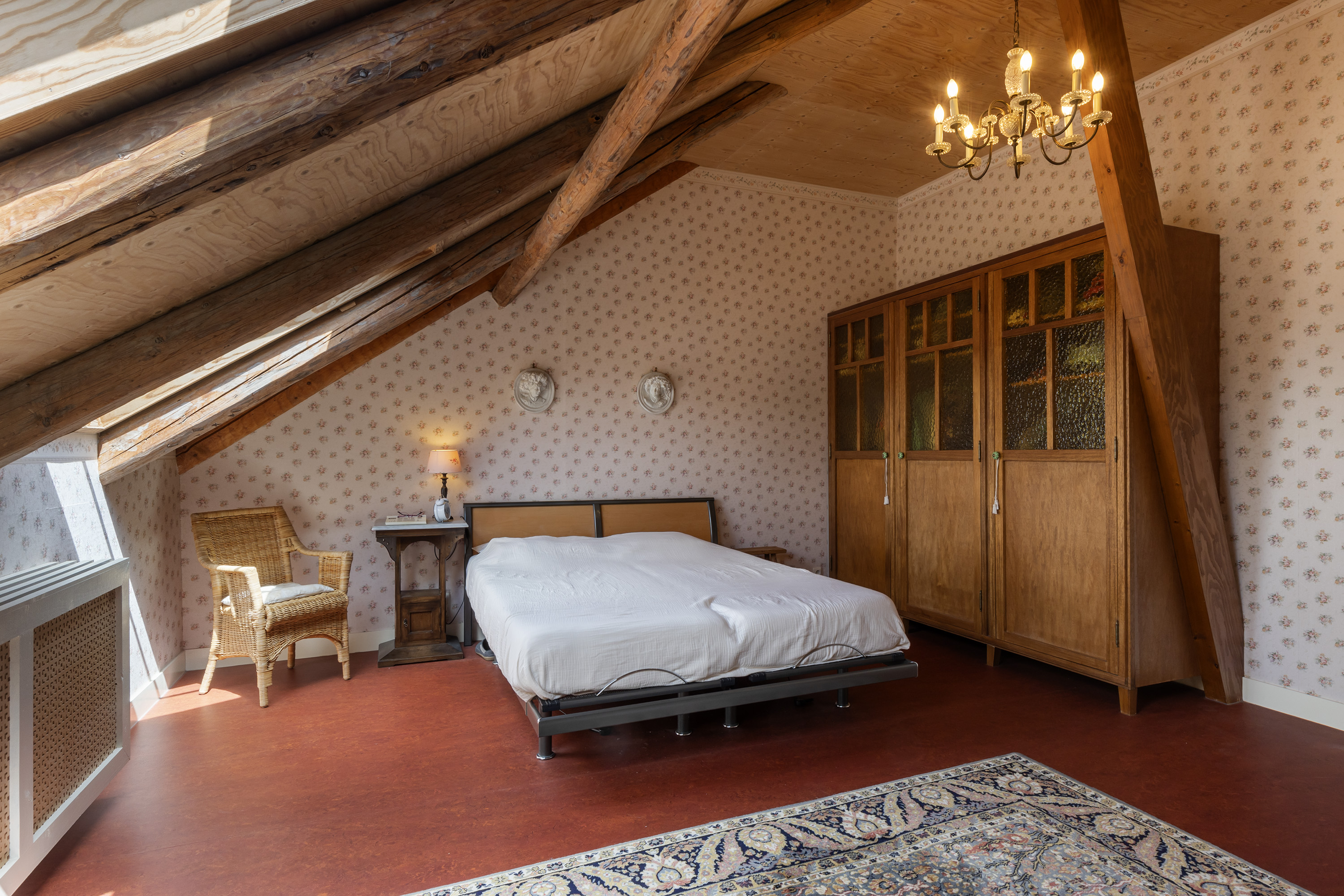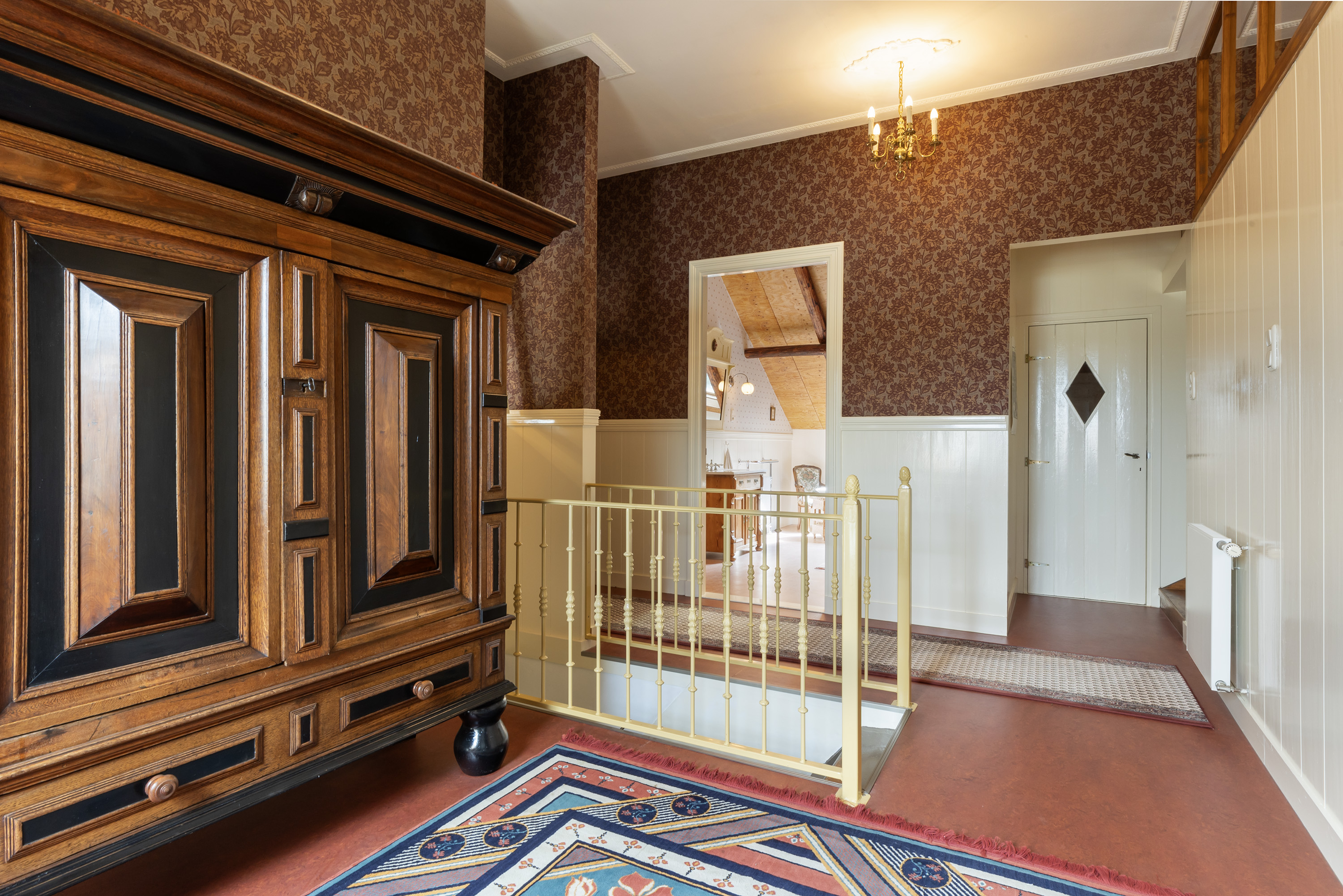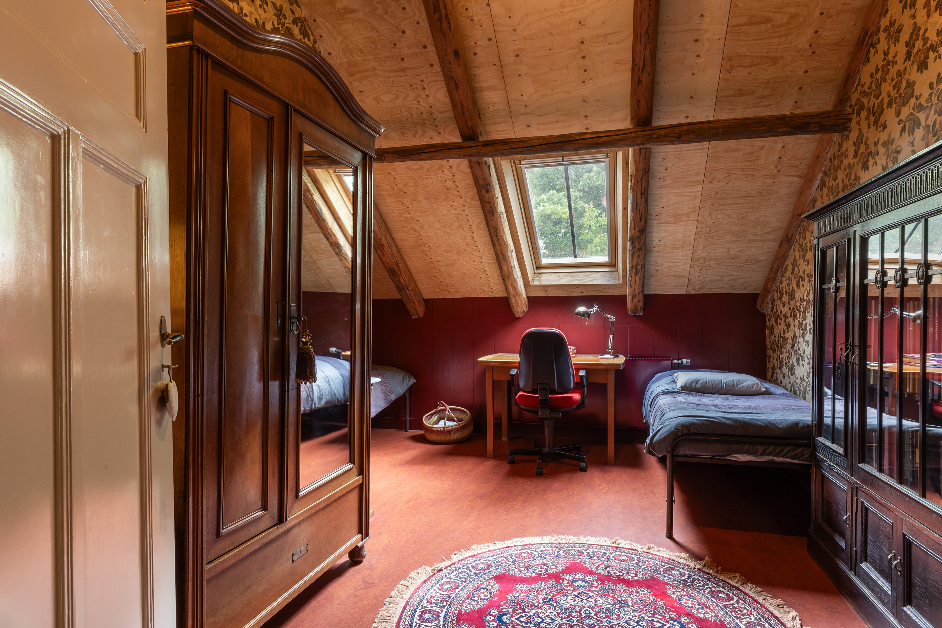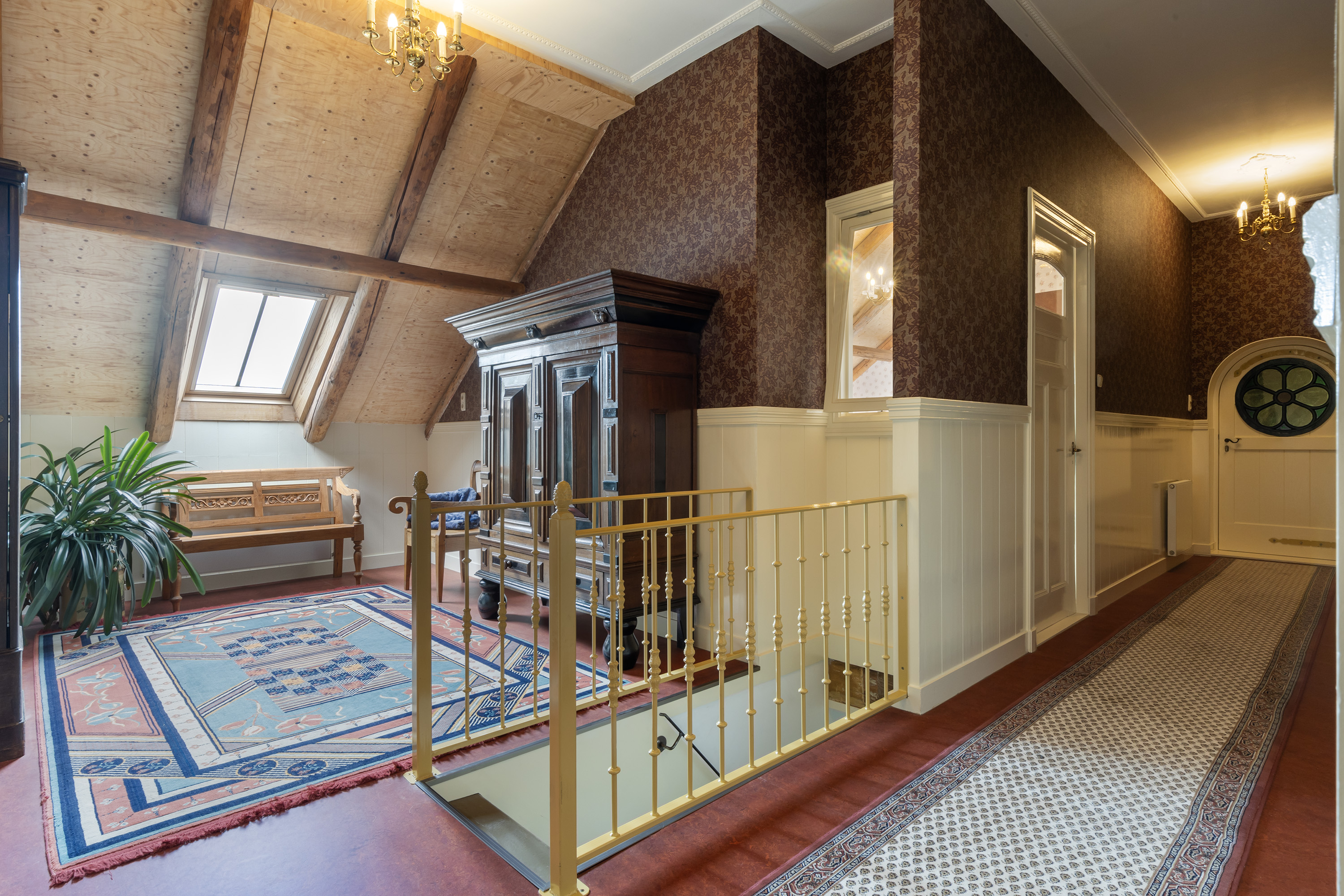 De bovenverdieping is bij de verbouwing volledig aangepakt: oude ondervloeren zijn verwijderd en opnieuw aangebracht, waardoor een grote zolderruimte ontstond. Hier bevinden zich nu een sfeervolle kantoor-/zitkamer, twee slaapkamers, een moderne badkamer en een separaat toilet. De badkamer is royaal en stijlvol afgewerkt met een ligbad onder het dakraam, een ruime inloopdouche en een wastafelmeubel. De combinatie van hout met natuurstenen wandtegels geeft deze ruimte een serene, luxueuze sfeer. Verder is er een separaat toilet aanwezig. De verdieping is recent voorzien van 5 velux dakramen met dubbel glas en wordt verwarmd door de hybride warmtepompinstallatie.