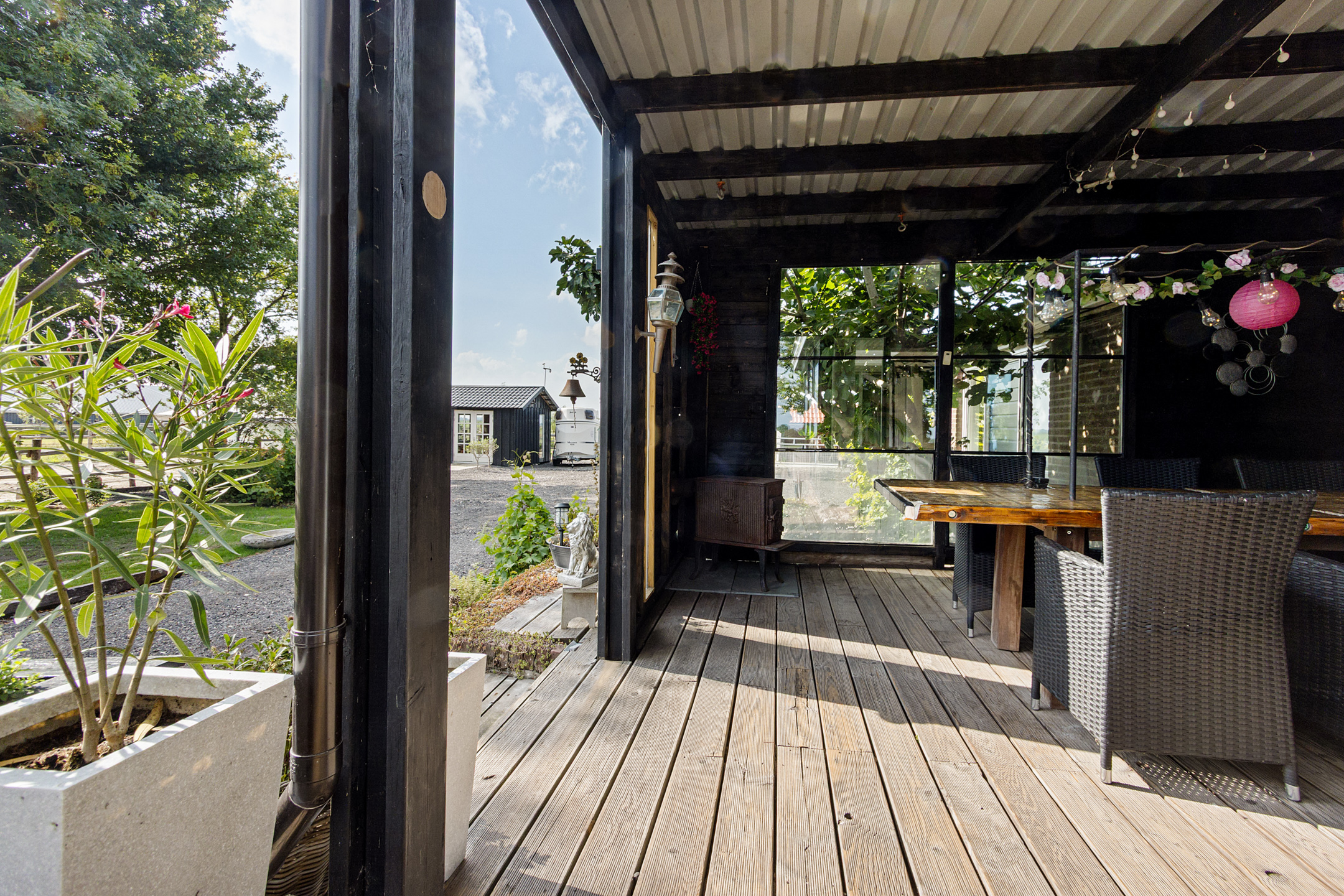 Het perceel is speels aangelegd met gazons, bloeiende borders, fruitbomen en meerdere terrassen in zon en schaduw. Bij het tiny house is een fijne zitplek onder de oude boom, waar de paarden graag een appeltje mee-eten. Verder zijn aanwezig: een kapschuur, garage met berging en carport, een paddock paradise met inloopstal, zadelkamer en voeropslag. Er is voldoende parkeergelegenheid op eigen terrein.