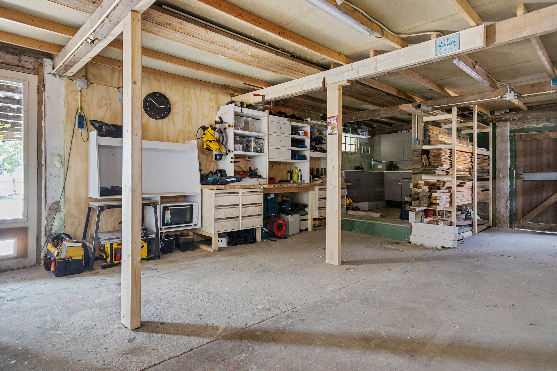 De achtergelegen schuur is zowel inpandig als via een zijentree bereikbaar. Deze ruimte is zeer geschikt als werkplaats voor een bedrijf aan huis of stalling. De schuur heeft een overkapping geschikt voor opslag van hooi of het stallen van voertuigen, een berging en een carport.