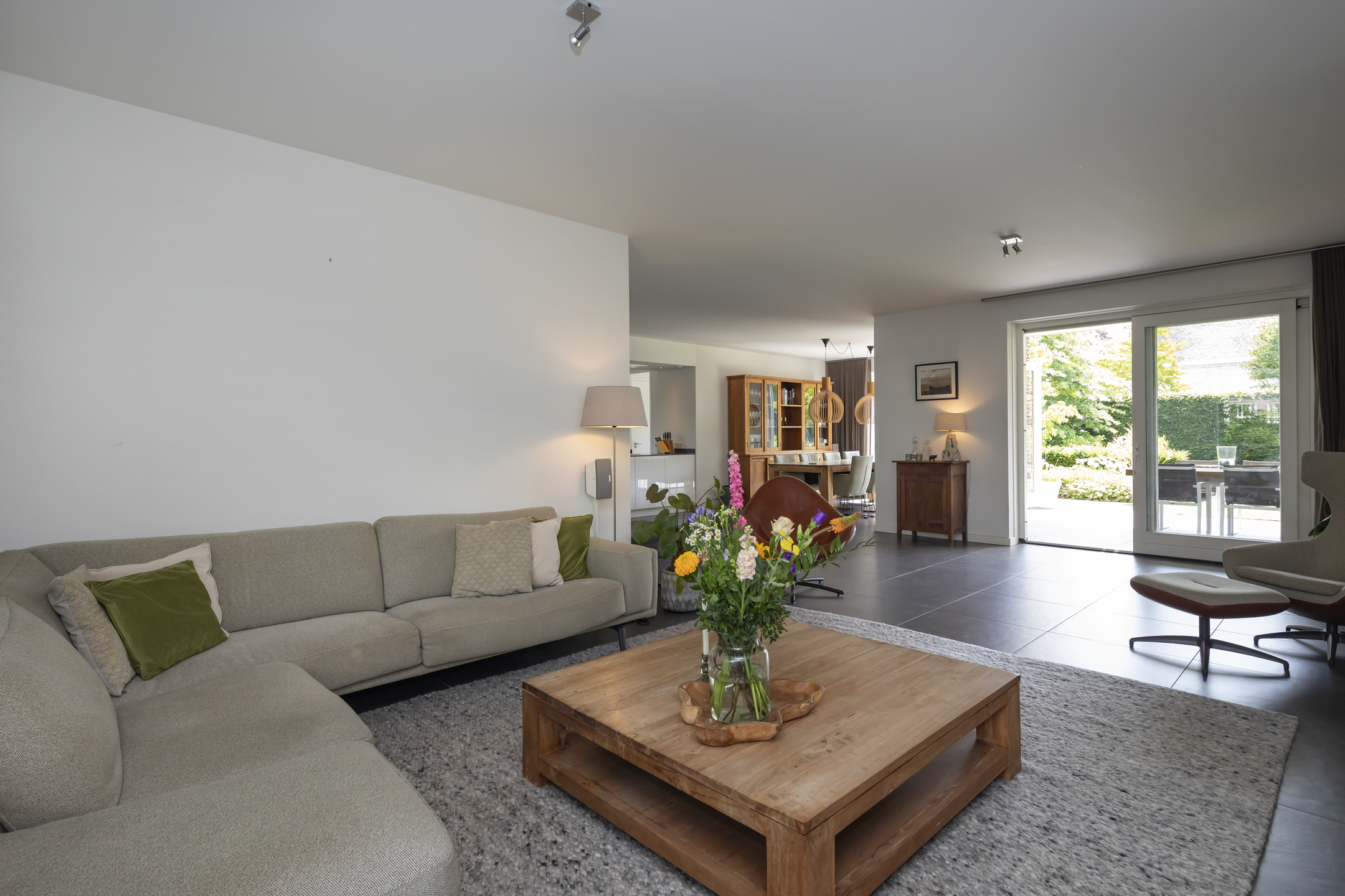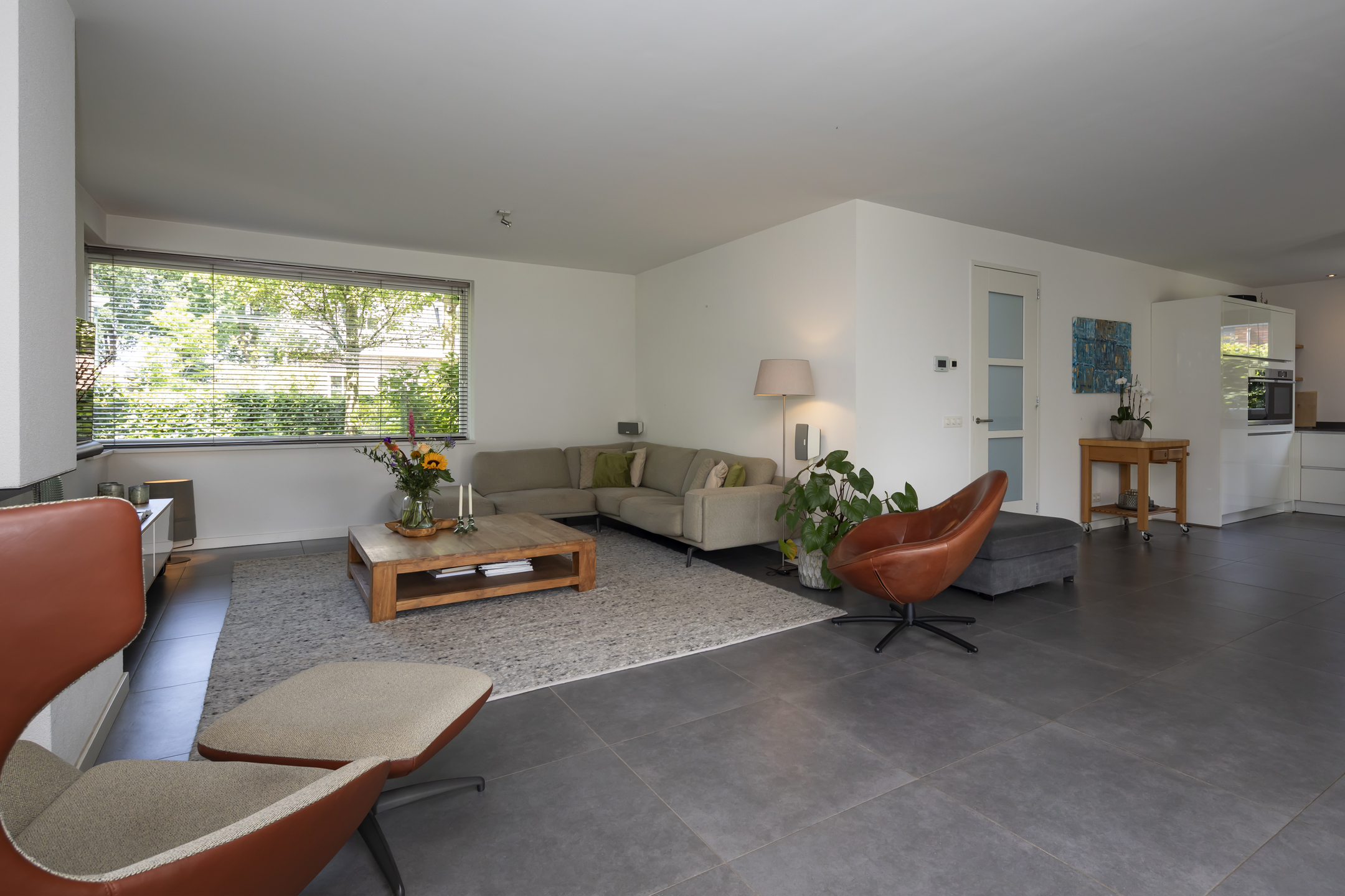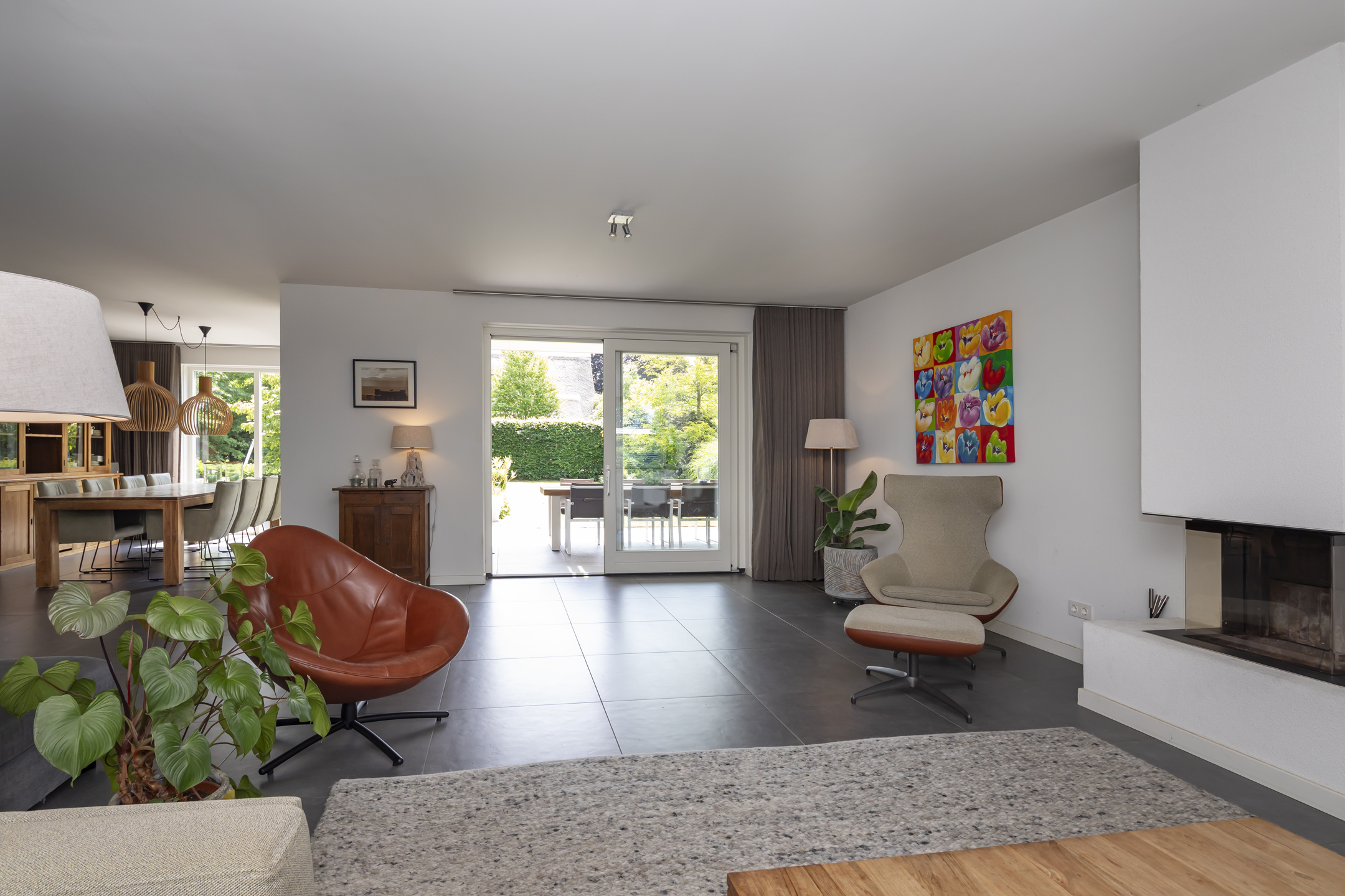 De sfeervolle haard bevindt zich centraal in de woonkamer. Het is een zonnige woonkamer dankzij de grote raampartij aan de voorzijde en de schuifpui aan de achterzijde, welke toegang geeft tot het fijne overdekte terras.