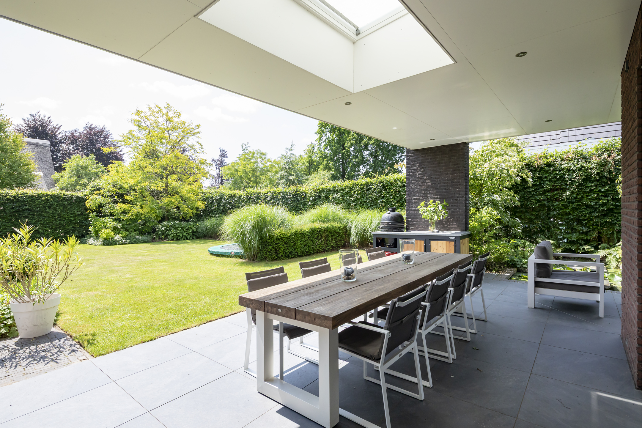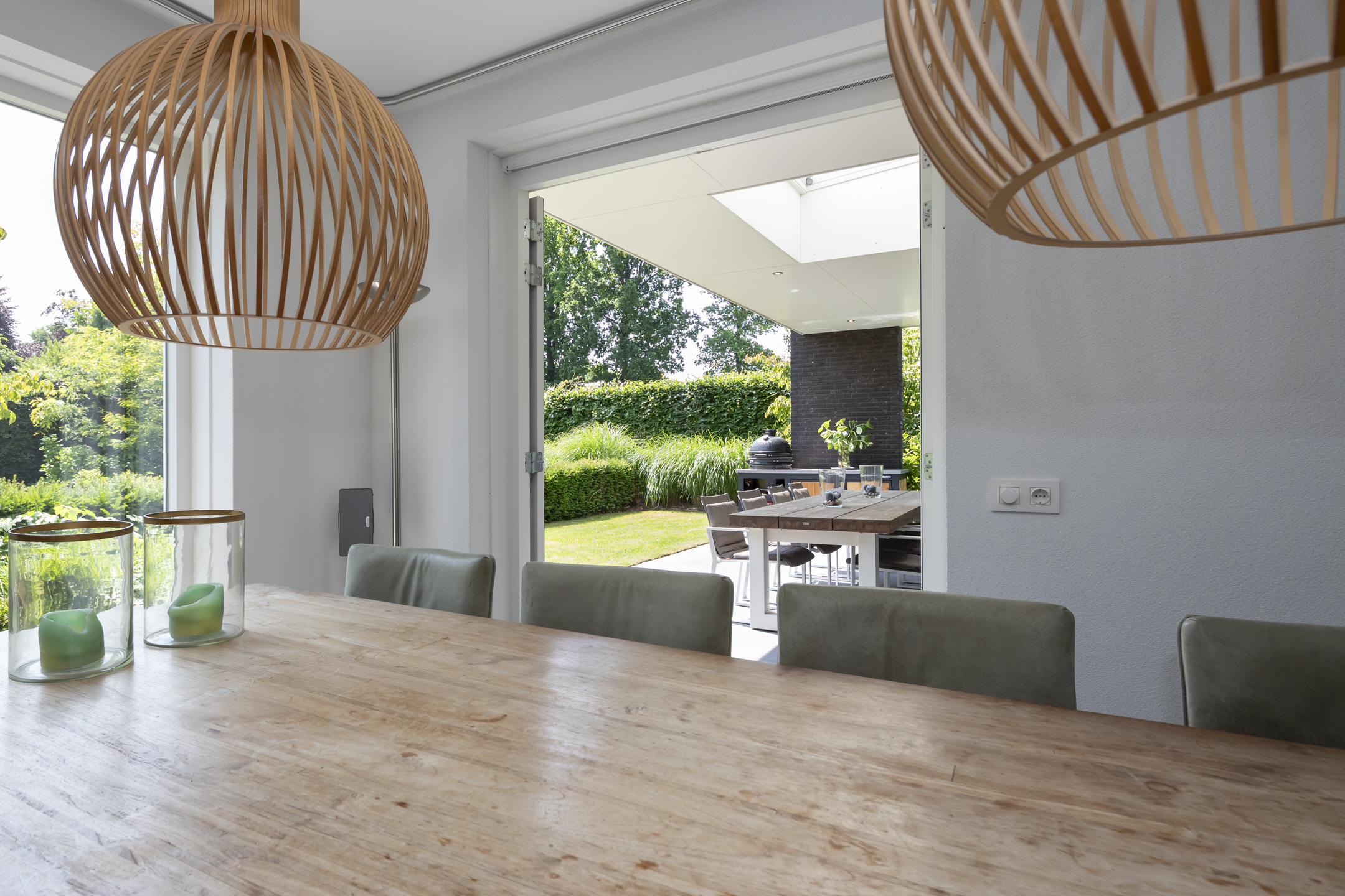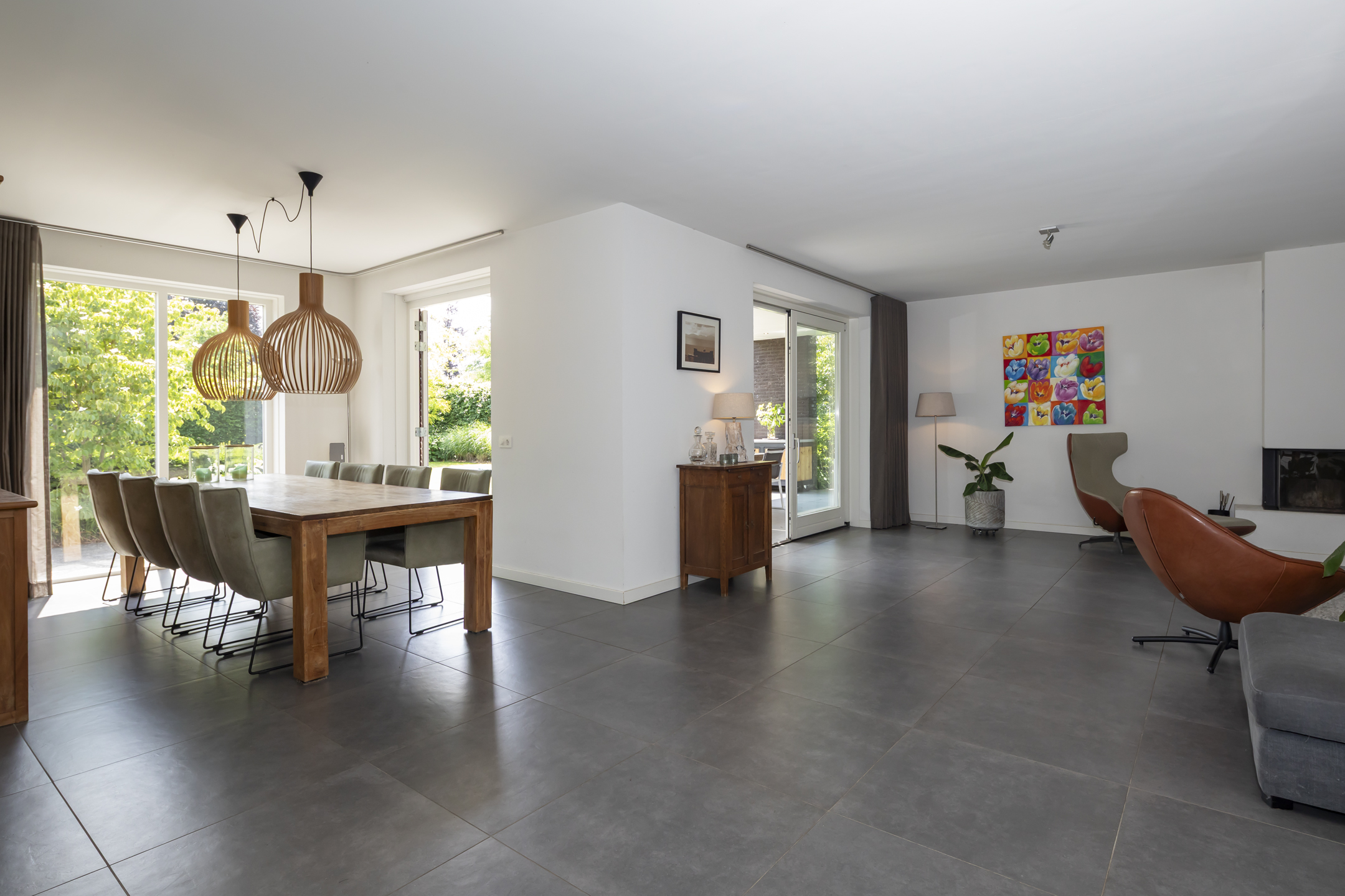 Het eetkamergedeelte is eveneens mooi ruim opgezet. Terwijl u aan tafel zit, kunt u genieten van het uitzicht op de fraaie tuin. Via de dubbele openslaande terrasdeuren in de eetkamer, komt u uit op het royale overdekte terras.